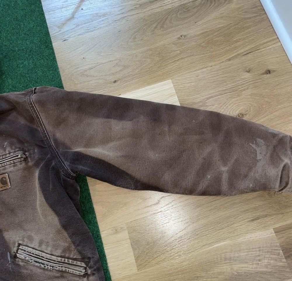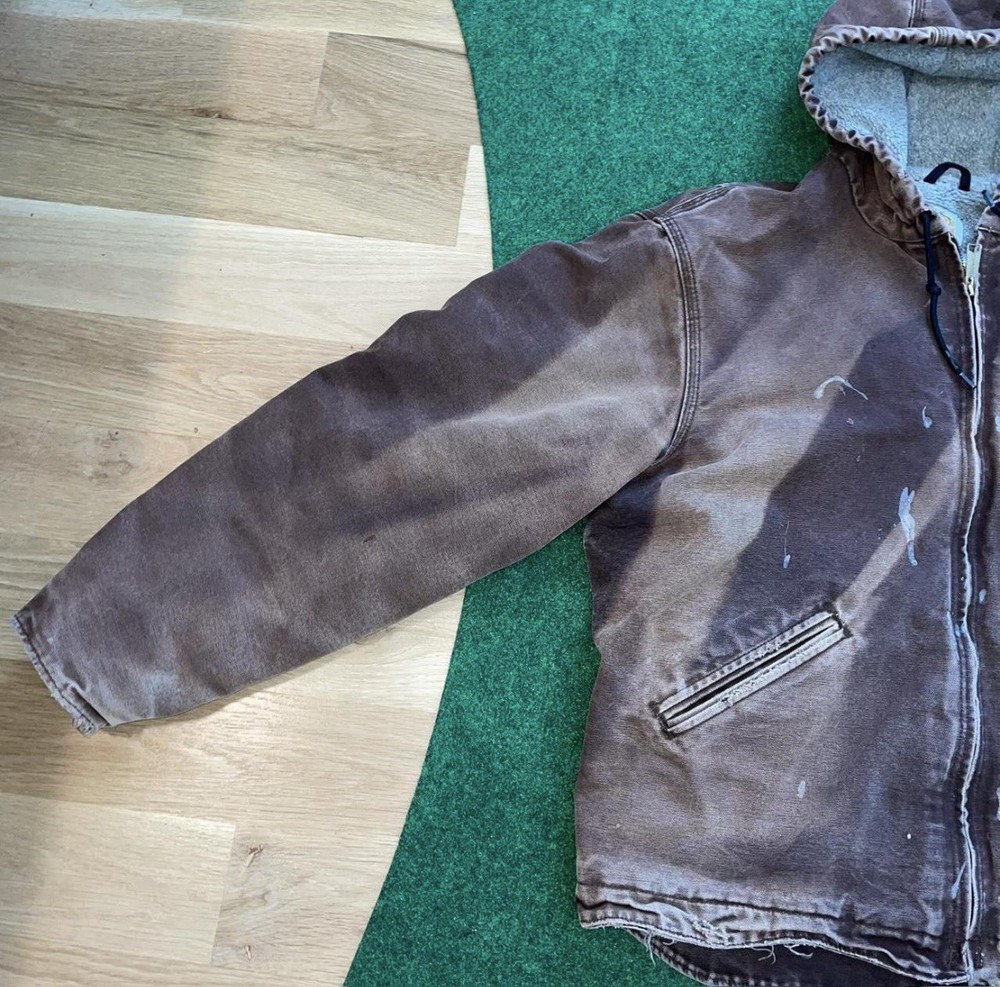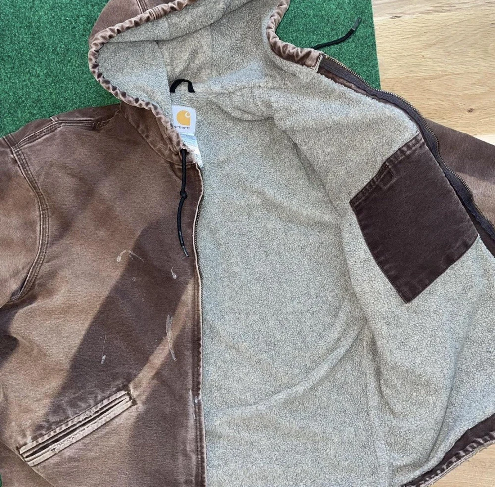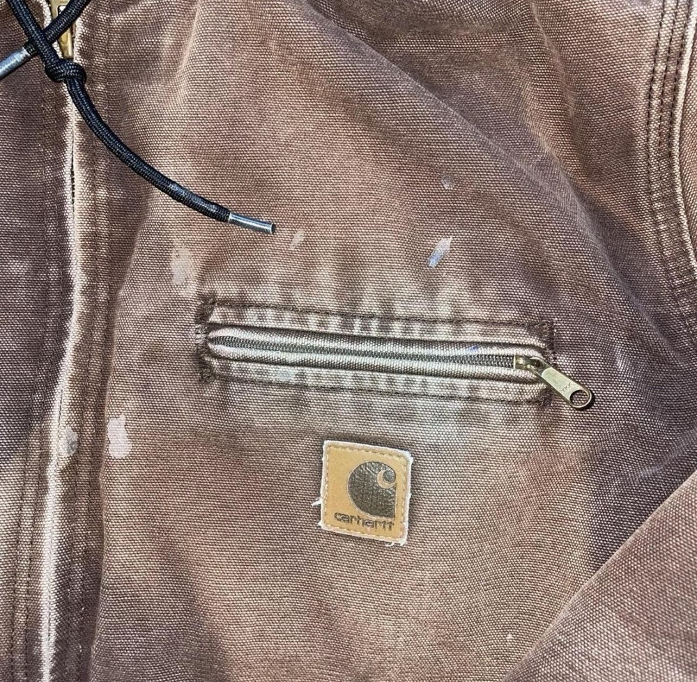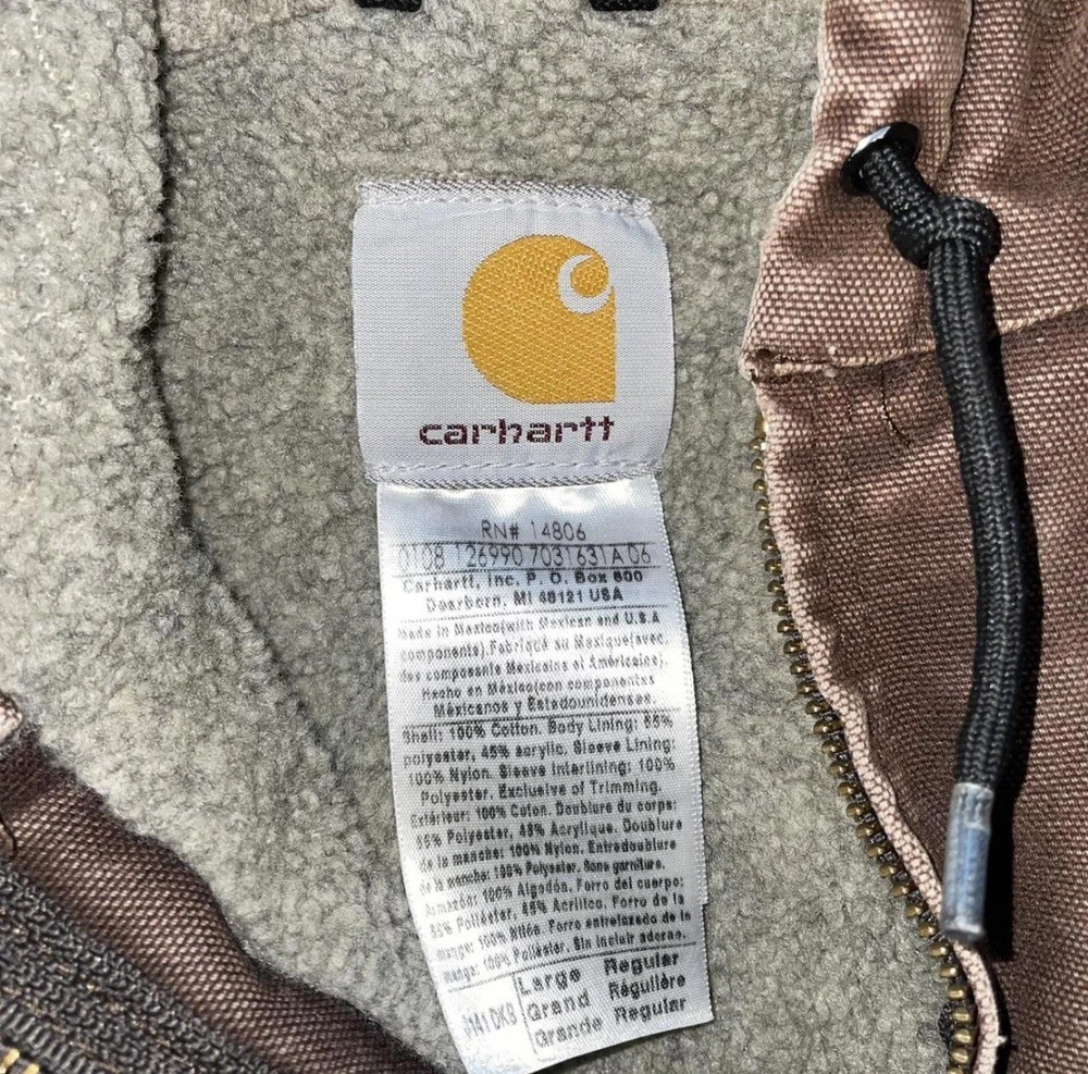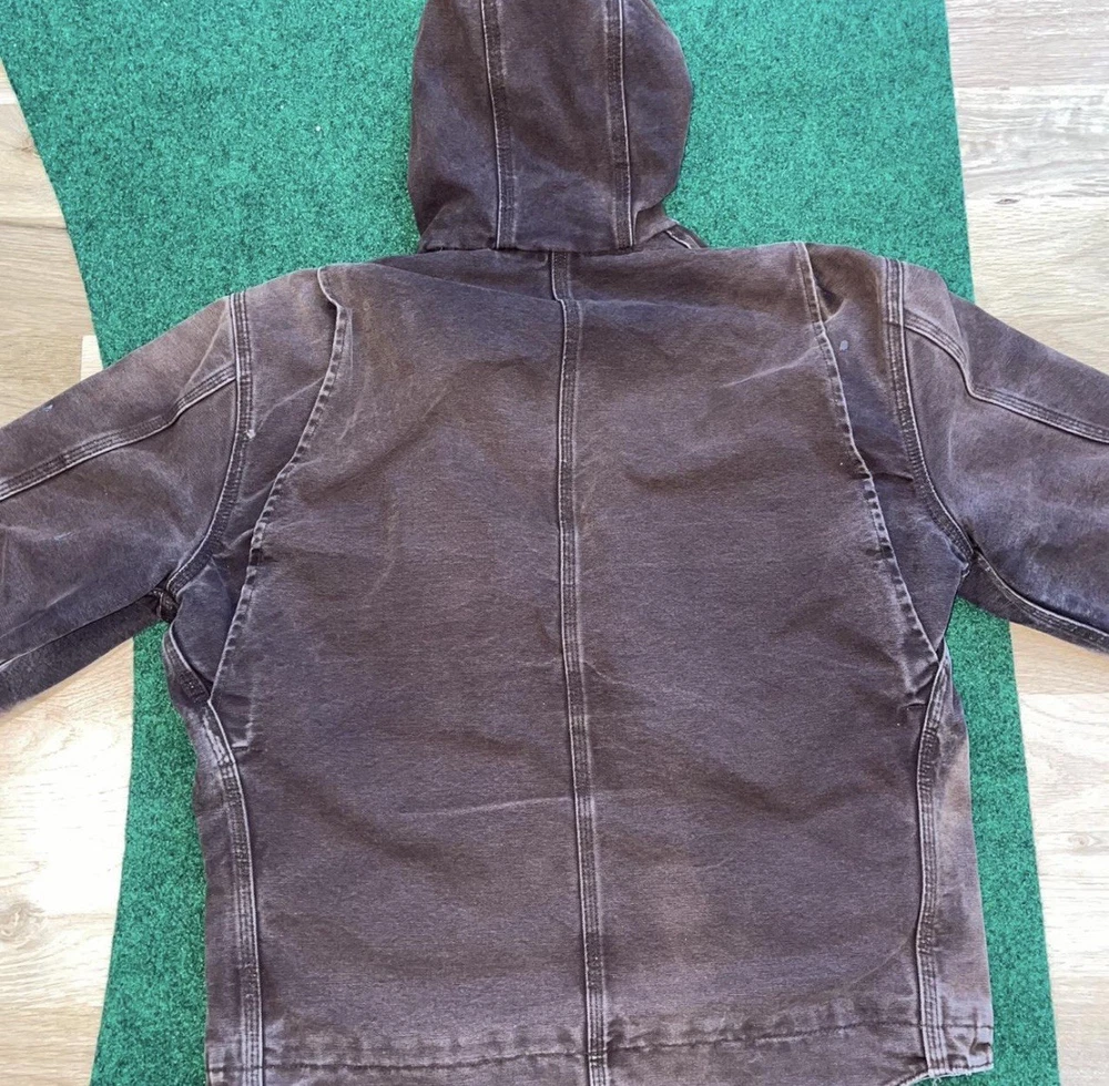 This Vintage Y2K 2008 Sun Faded Carhartt Lined Jacket is a stylish and practical piece perfect for workwear. Made of durable cotton with a cozy fleece lining, it is ideal for colder seasons like winter, fall, and spring. The jacket features a solid brown color, zip closure, and a hood for added warmth. With a regular fit and size large, this bomber jacket is a timeless classic that will keep you comfortable and looking great while tackling your daily tasks. Shipped with USPS Ground