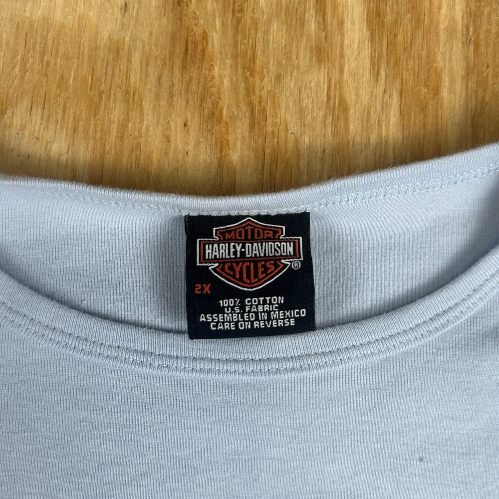 This Y2k Benjy's Harley Davidson T-Shirt is a must-have for any cat lover who loves the open road. The blue, crew neck tee features a cute cat graphic and is made of 100% cotton for easy care and breathability. It's perfect for casual wear or travel and can be worn during all seasons, including summer, fall, and spring. The T-Shirt is a regular fit and comes in women's size 2XL. It has short sleeves and a neckline that's perfect for displaying your favorite accessories. This unit is a single, machine-washable garment that's made in Mexico. Add it to your collection today and show off your love for cats and Harley-Davidson.