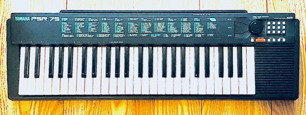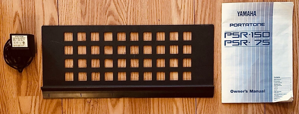 YAMAHA PSR-75 electronic synthesizer keyboard. All buttons, keys, selector, and speaker are working. Both AC adapter and battery operation have been tested fine. The aux/headphone output has not been tested due to professional headphones not being readily available. A 110 V AC to 800 mA 12 V DC adapter made in Taiwan, a foldable steel stand, instructions, the original box and music score holder are included. Shipping to lower 48 states only