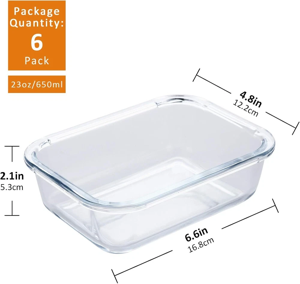 YEBODA Glass Food Storage Containers with Airtight Snap Locking Lids Clear Product Details Product Dimensions: 16.1"L x 7.4"W x 5.5"H Recommended Uses For Product: Meal Prep Special Feature: leak-resistant, airtight Container Shape: Rectangular Closure Type: Snap Is Dishwasher Safe: Yes Material Type Free: BPA Free Item Package Quantity: 1 Item Weight: 6.9 Pounds Product Care Instructions: Oven Safe, Refrigerator Safe, Freezer Safe, Microwave Safe, Dishwasher Safe Item Volume: 640 Milliliters Is Microwaveable: Yes Manufacturer: YEBODA Item Weight: 6.89 pounds Is Discontinued By Manufacturer: No Shape: Rectangular Special Features: leak-resistant, airtight Batteries Included?: No Batteries Required?: No Number of Sets: 6 Brand: YEBODA Color: Clear Material: Silicone, Glass, Plastic, Borosilicate Glass Material Feature: BPA Free Capacity: 1.4 Pounds TOP-QUALITY:Food storage containers made of borosilicate glass. Heat-resistant is up to 750℉(400℃). AIRTIGHT:100% airtight lids built with 4 lock for our containers made with BPA-Free silicone rings. MULTIPURPOSE:Encourage you to take your containers to travel, work, gym, picnics and school lunches. EASY CLEAN:Remind customer not putting lids in oven or microwave, sealing rings are removable-clean.
