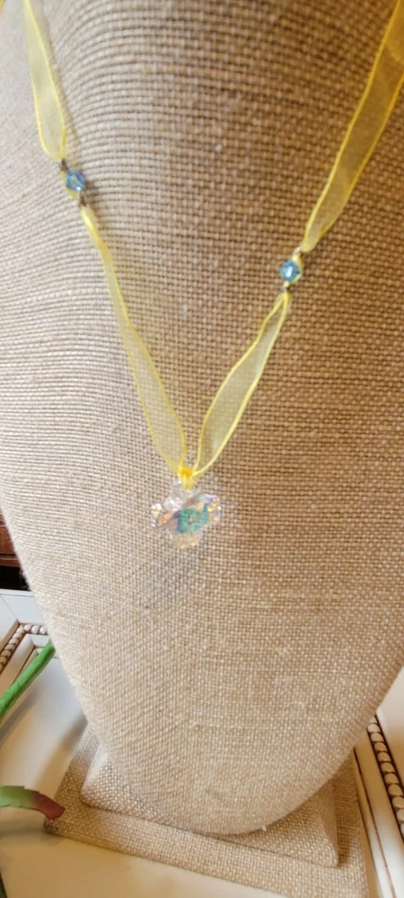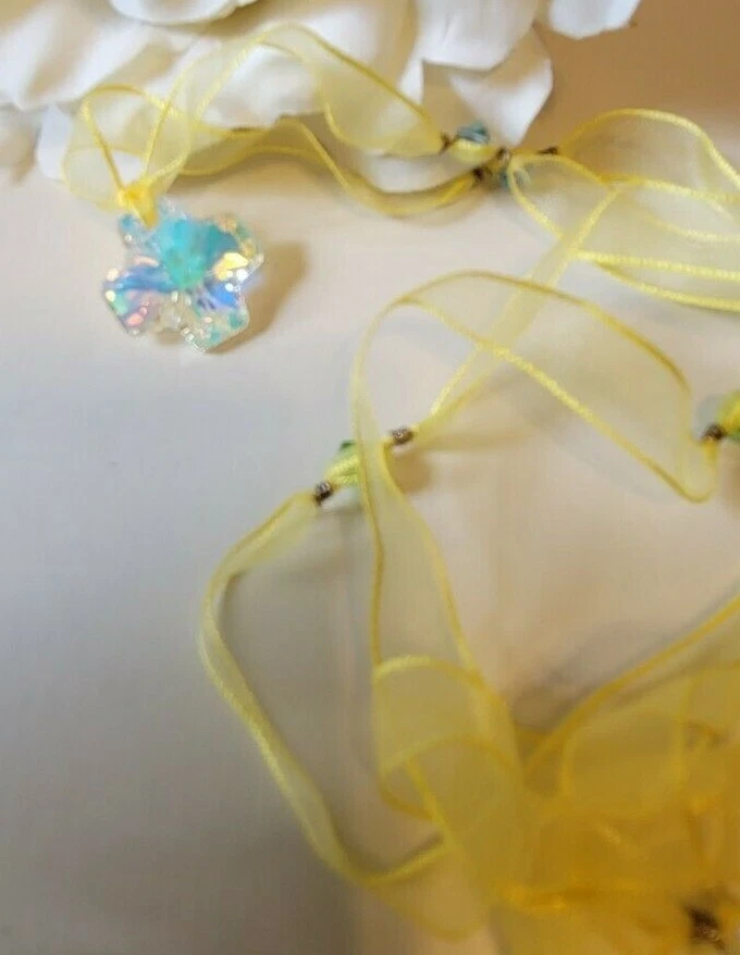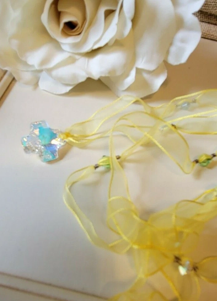 † YELLOW Ribbon Crystal Cross Necklace † STUNNING Aurora Borealis