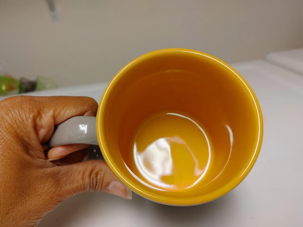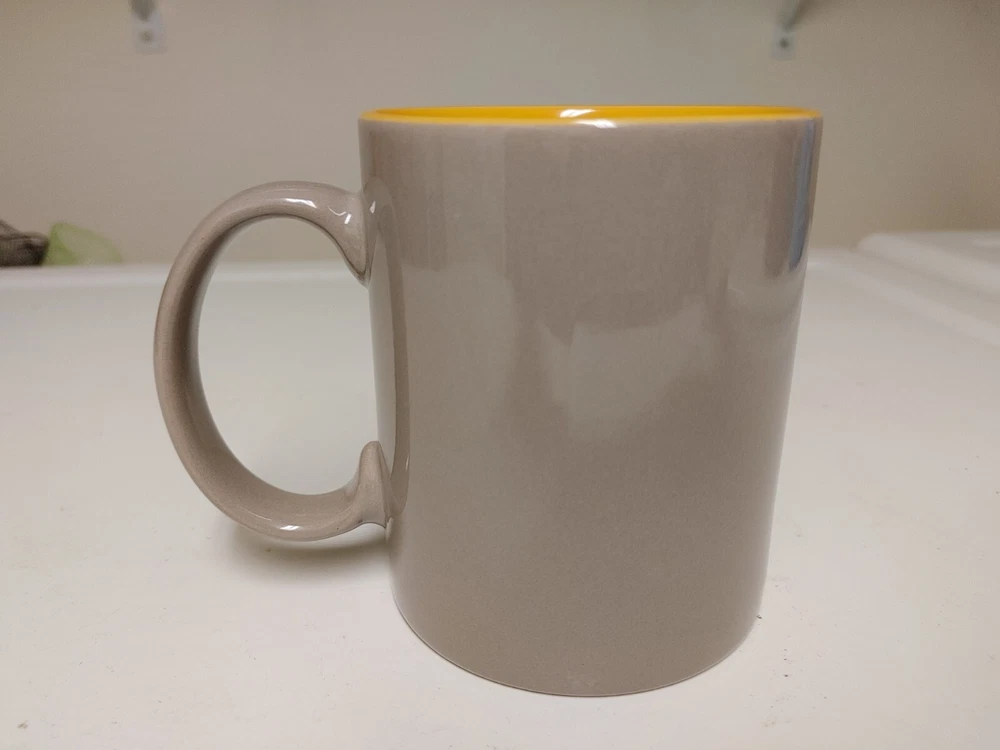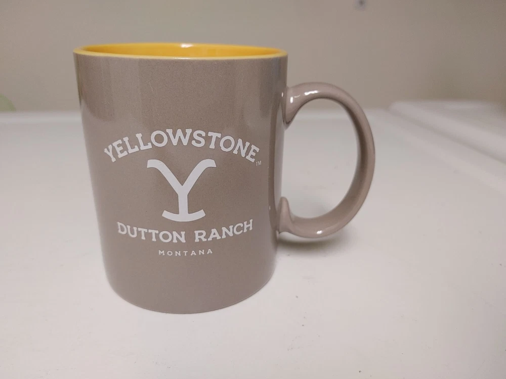 The Yellowstone ceramic coffee mug is a modern-style, round, medium-sized mug that can hold 11.5 oz of hot or cold beverage. It features the logo of the Dutton Ranch and is handmade with ceramic and porcelain materials. The mug is machine washable and has a capacity of 11.5 oz. It is a gray color with yellow accents and is an original, licensed reproduction from the Yellowstone franchise. Perfect for all occasions, this mug is a great addition to any kitchen or collectible display.