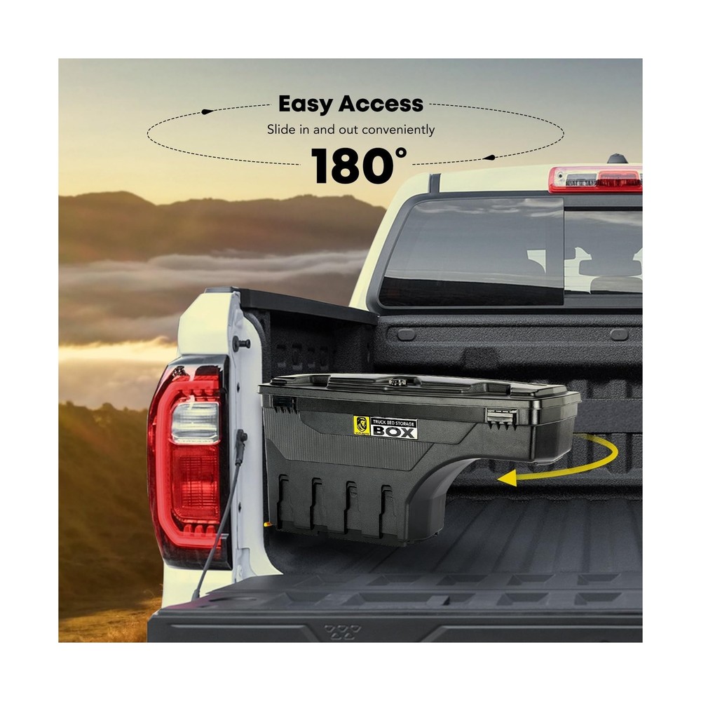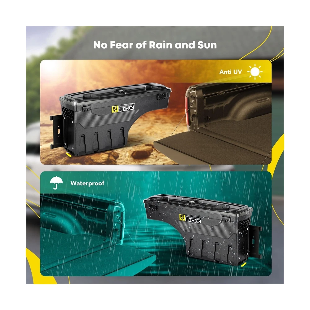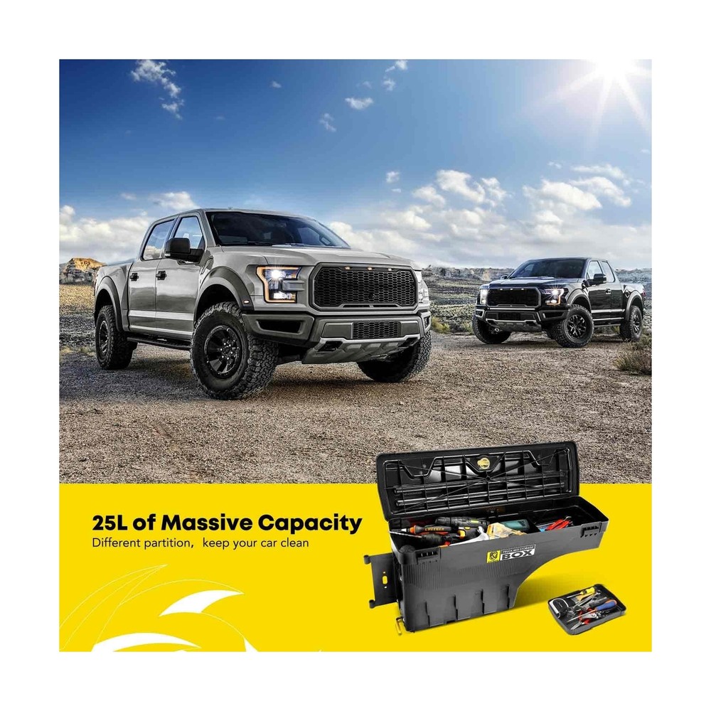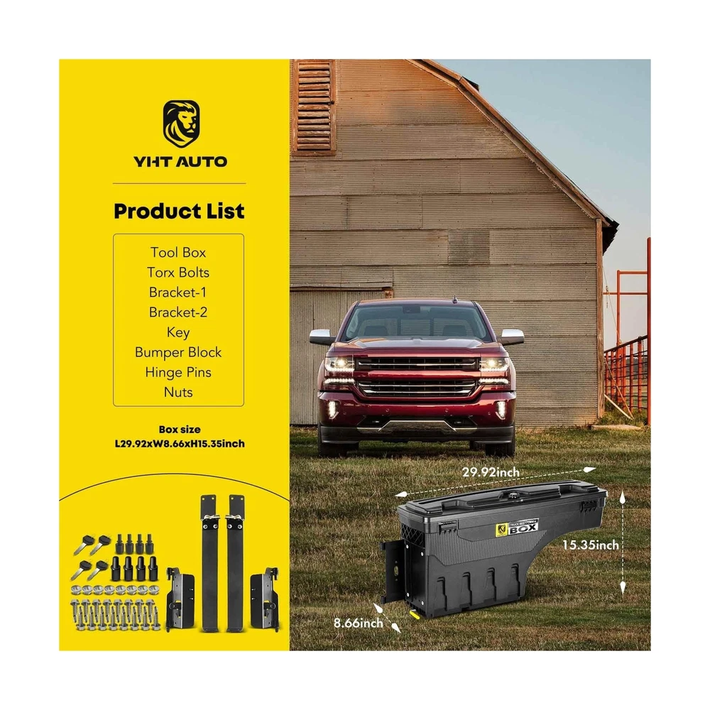 YHTAUTO Set of 2 Truck Bed Storage Tool box Lockable Compatible with 2002-2018 Dodge Ram 1500 2500 3500, Not Fit Rambox, Swing Waterproof Wheel Well Toolbox Description Features: Incredible Fit: Compatible with Dodge Ram 1500/Ram 2500/Ram 3500 2002-2018 truck's driver and passenger side, it is worth noting that does not fit rambox and 2013-2015 Ram 3500 factory tow package; Works with almost any tonneau cover, quick installation with eyelets to easily secure the case to the bed Double Locking for Security: Not sure where to store your equipment? Don't worry, you can lock everything away with YHTAUTO's truck bed toolbox. The innovative lockable case will keep your gear safe, while the bonus unpickable combination password lock offers an extra layer of security. Our dual anti-theft feature protects against any tampering attempts, providing you with peace of mind Unmatched Toughness: The superior quality ABS composite material makes the YHTAUTO truck bed tool box not only durable but also lightweight. It protects your belongings from strong winds, rain and dust, and can even withstand the sun's rays. Don't let the elements ruin your day The Ultimate in Convenience: The swing truck tool boxes mounted on the trucks bed side; Pull the latch and the swing box truck toolboxes pivot nearly 180o over your lowered tailgate, providing instant access. Fold it up when not in use and it doesn't take up any valuable cargo space. No matter how fast you drive, it stays in place Attention: The maximum load our products can reach in a static state is 75 LB, but due to the different road conditions in the process of drive, the actual load capacity of the product is less than 75 LB. We kindly recommend that you save some weight when loading the tools, so as to avoid damage, and prolong the product's service life Product Details: Brand: YHTAUTO Color: black Material: Acrylonitrile Butadiene Styrene Special Feature: lockable Style: Modern Brand: YHTAUTO Color: black Material: Acrylonitrile Butadiene Styrene Special Feature: lockable Style: Modern Recommended Uses For Product: Tools Water Resistance Level: Waterproof Opening Mechanism: Latch Shape: Rectangular Pattern: Solid Number of Items: 2 Number of Compartments: 2 Unit Count: 1 Count Item Package Quantity: 2 Material Feature: Durable, lightweight, and weather-resistant Maximum Weight Recommendation: 75 Pounds Closure Type: Latch Manufacturer: YTAUTOPARTS Item Weight: 40.8 pounds Package Dimensions: 36.65 x 20.55 x 17 inches Manufacturer Part Number: YHTPTB10006 OEM Part Number: 5-SBSC-DR02-L, 5SBSCDR02L, SC300D, 5-SBSC-DR02-R, 5SBSC-DR02R, SC300P Special Features: lockable Date First Available: July 31, 2019 Delivery We Do Not Ship Outside of the Continental US. Return Policy All items qualify for returns within 30 days of receipt. Buyer is responsible for return shipping on any item that is not damaged. Feedback We take our reputation seriously, we buy and sell online, so we understand the value of trust. If you are unsatisfied with your order, please contact us and we will work with you to resolve it to your satisfaction.