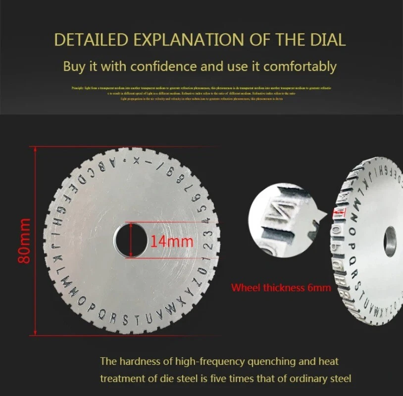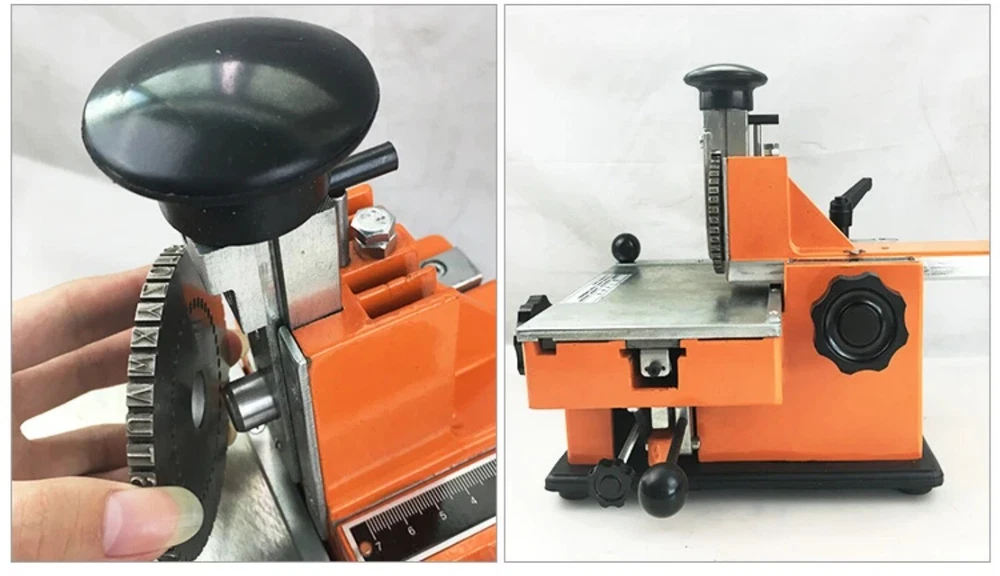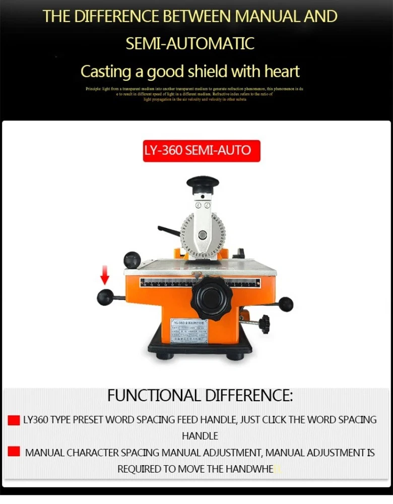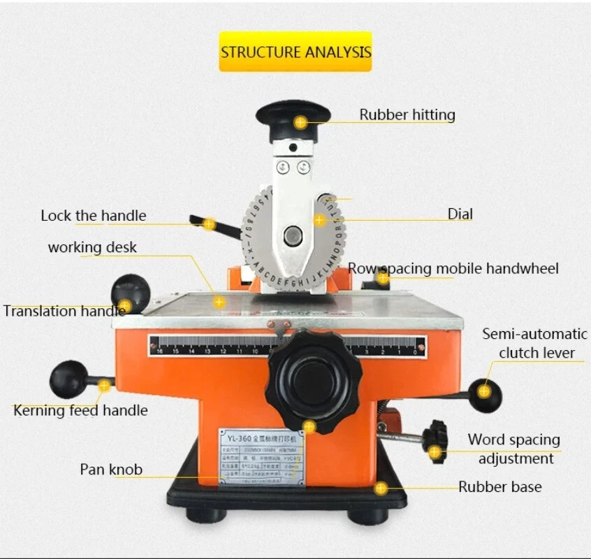 YL-360 Small Desktop Semi-Automatic Marking Machine Metal Nameplate Mosaic Carving Tool Sign Engraving Machine Printer Product parameter product code:GJ0007 Name: Semi-automatic marking machine Model: YL-360 Package weight: 8KG Packing size: 30*35*38 Printing depth: 0.1-0.3mm Whether to supply power: No Printing speed: 2-5/10 seconds. Marking range: 165X 135mm Dial material: 12CrMO high-quality die steel Print content: letters, numbers, symbols Optional sub-disk: 2, 2.5, 3, 4, 5, 6 Product weight: 7.5Kg Dimensions: 280 X 220 X 260mm Use: Metal signs _ engraved on the changed parameters: such as specific model, date, batch number, serial number, serial number, etc. Typical application: All kinds of aluminum, copper, stainless steel, plastic nameplates on machinery, electromechanics, water pumps, valves, automobiles and motorcycles, and electrical appliances. Working principle: The alloy steel turntable after high frequency quenching heat treatment is under the action of external force (hand pressure or rubber hammer), and letters or numbers with a certain depth (0.1~0.3mm deep) are engraved on the metal sign; The heat-treated steel dial can be rotated to the required letters or numbers, and the font can be easily replaced; the marking position and line spacing are steplessly adjusted by a special mechanical mechanism; the character spacing depends on manual adjustment; different character heights can be realized by changing the dial; Signs of various shapes smaller than 200x 135mm can be clamped and engraved. Character wheel material: chrome steel 12CrMo Character wheel hardness: >60 degrees Character wheel thickness : 6 mm, (No. 6 font 7 mm) Character wheel diameter: 80mm Character wheel shaft hole: 14mm The positioning error of the full circle of the character wheel is plus or minus 0.10mm (to avoid overlapping printed characters or uncontrollable kerning) Number of characters: 40 English letters: ABCDE FGHIJKLMNOPQRSTUVWXY Z Arabic numerals: 1 234567 890 Simple notation: *x /一 Theoretical service life: the single character code of the stainless steel nameplate can be printed more than 200,000 times continuously