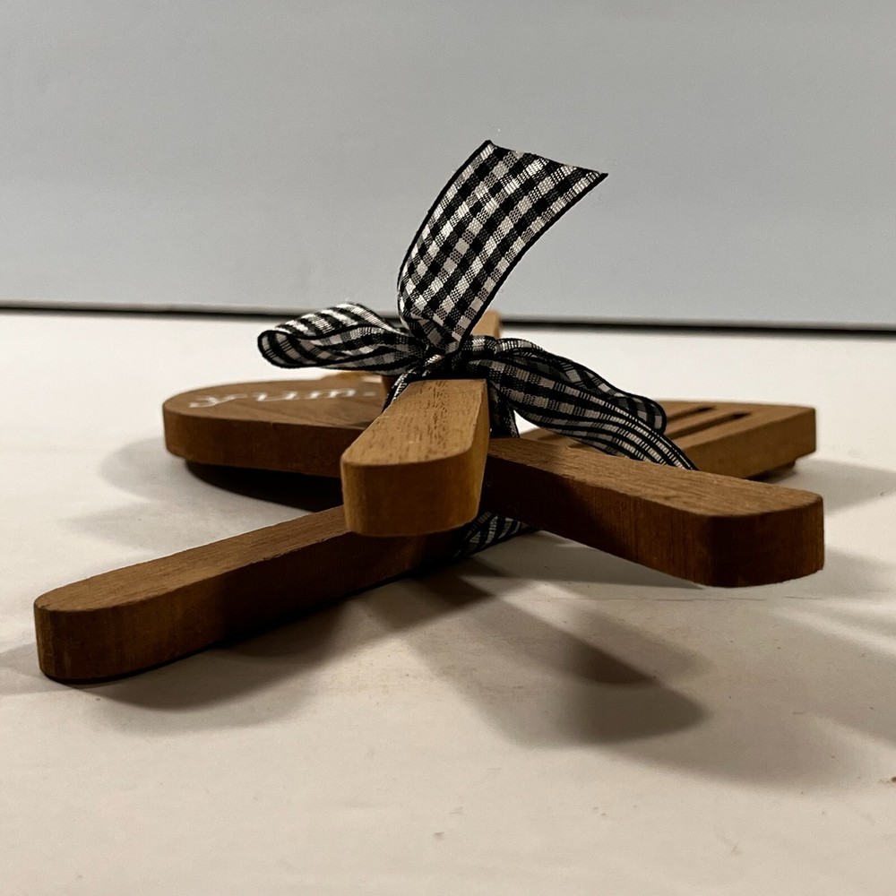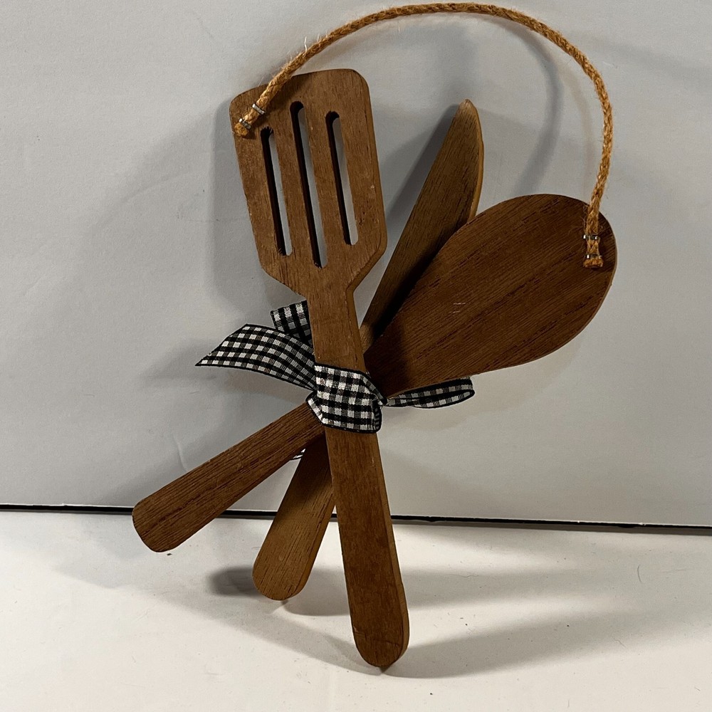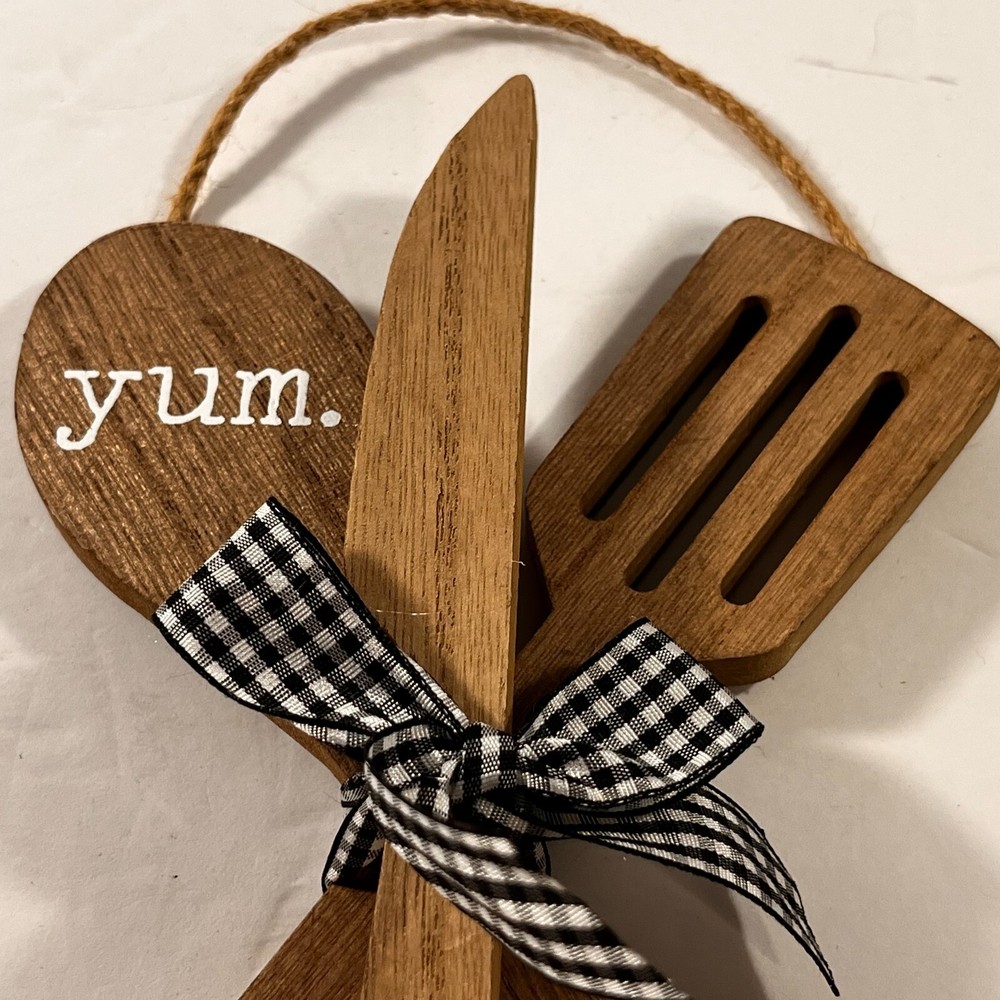 "YUM" Spoon Fork Knife Wall Decor Made of Wood with a black and white Gingham Bow and a Jute Hanger Measures 7" x 5" Preowned - Excellent Condition