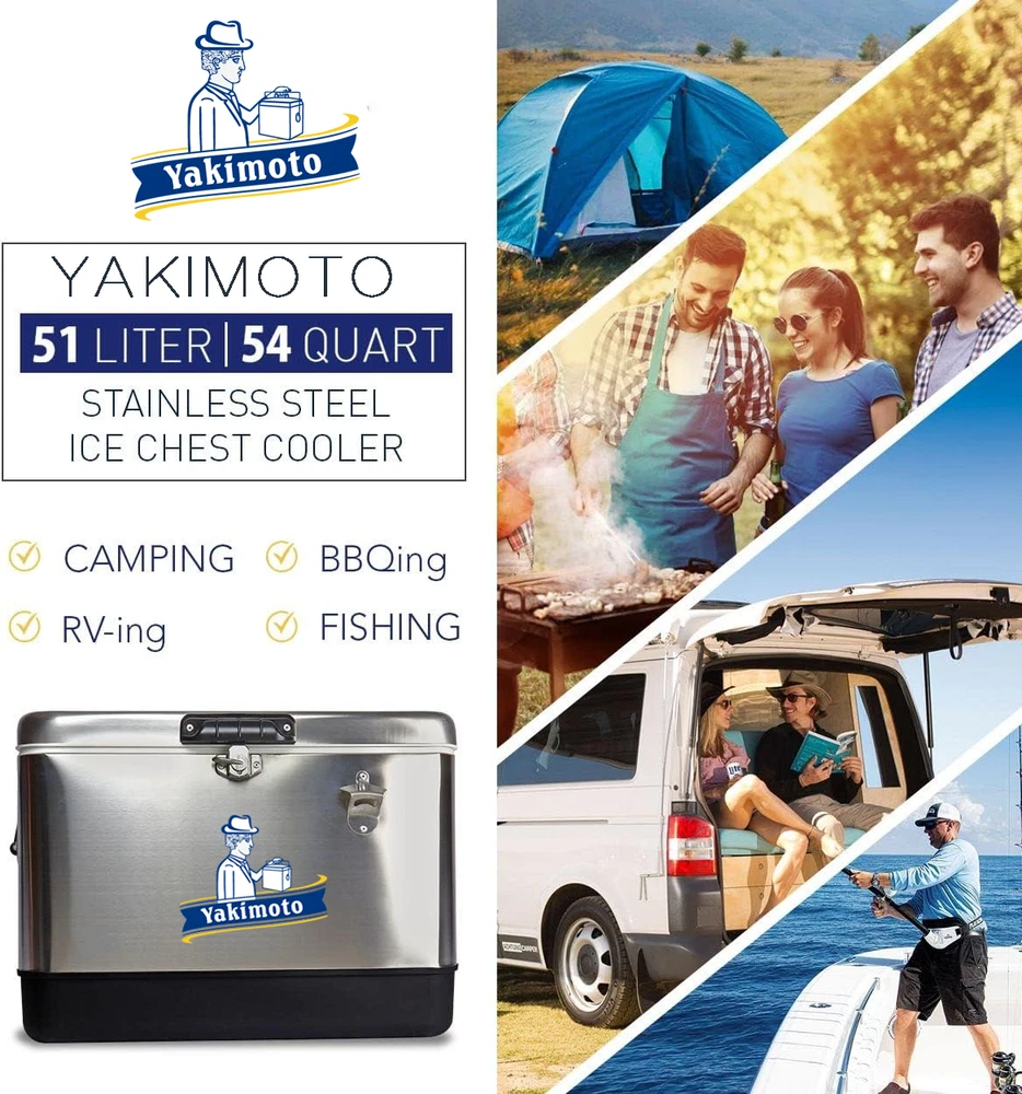 How does the cooler work? Our cooling technology is not comparable with other cool boxes. If you combine the Cooler Box Correct use, the temperature inside can be kept constant for many days - without power supply, in any climate zone, anywhere in the world. Product Information: Product Name: Waterproof Metal Ice Cooler 54 QT Yakimoto Vintage Stainles Steel Ice Chest Product Model: 2024JHH001 6 Capacity: 51 Liter Material: Stainless Steel+PU+Aluminium Size(Inch): 23.6 " x16. 5 " x16.3 ", Size(Cm); 60x42x41.5 cm Packing: Each piece in a carton Meas.: 62x43x47.5 cm G.W/N.W: 7.3/8.5 KG S · Huge 51 L (54 qt) Capacity: Portable ice chest features a generous 51 liter (54 quart) capacity that can hold up to 85 standard soft drink cans so you have room for whatever you need · Built-In Bottle Opener: This cooler features a bottle opener conveniently attached to the outside so you don?t have to scramble or search when you want a cold one · Eco-Friendly Cooling On the Go: Environmentally-friendly cooler features premium insulation and a securely locking steel latch to keep your drinks and snacks cool without electricity · Durable Construction: Expert craftsmanship and quality materials including rustproof stainless steel exterior and a rugged plastic base mean this ice chest is in it for the long haul · Easy to Clean: Stain-resistant food-grade plastic lining and leak-proof channel drain for no-tilt draining make emptying and cleaning your cooler a breeze Product Description This durable 51L / 54 Quart stainless steel ice chest is the ideal personal cooler to keep your favorite foods and beverages chilled and ready to drink. Fill this insulated cooler with ice and pre-chilled drinks and snacks for environmentally safe storage without the need for electricity. The solid steel latch and non-toxic plastic liner trap cold air inside for maximum efficiency, and the leak-proof channel drain makes cleanup a breeze. With its durable stainless steel finish, easy-to-carry rubberized handles and built-in bottle opener, this ice chest is the perfect accessory for day trips, tailgating, boating, fishing, hunting, camping or your next backyard BBQ. Good helper for you when go outside. Featuring portable, it can be applied in various situations, when you go for a long-distance self-drive travel, or you go out for a picnic and camping, or you use it as a moveable medical cooler box, etc. There is no doubt it plays an important role in outside activities. Our high-quality cool boxes offer you maximum independence and optimum cooling without electricity. Thanks to innovative high-performance insulation and special temperature elements, food and drinks stay fresh or frozen for days. Perfect for camping, outdoor adventures and everyday use, our robust, easily transportable cool boxes combine sustainability and efficiency. Don’t hesitate to Choose This Cooler!