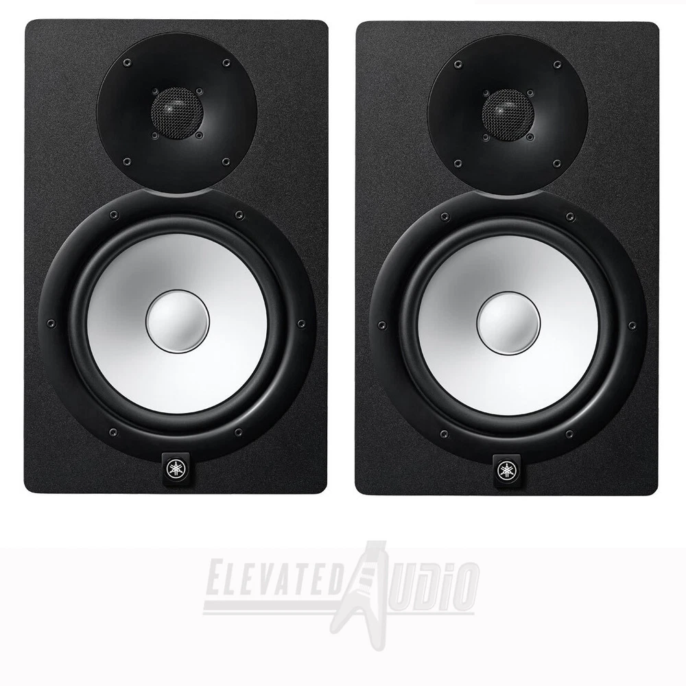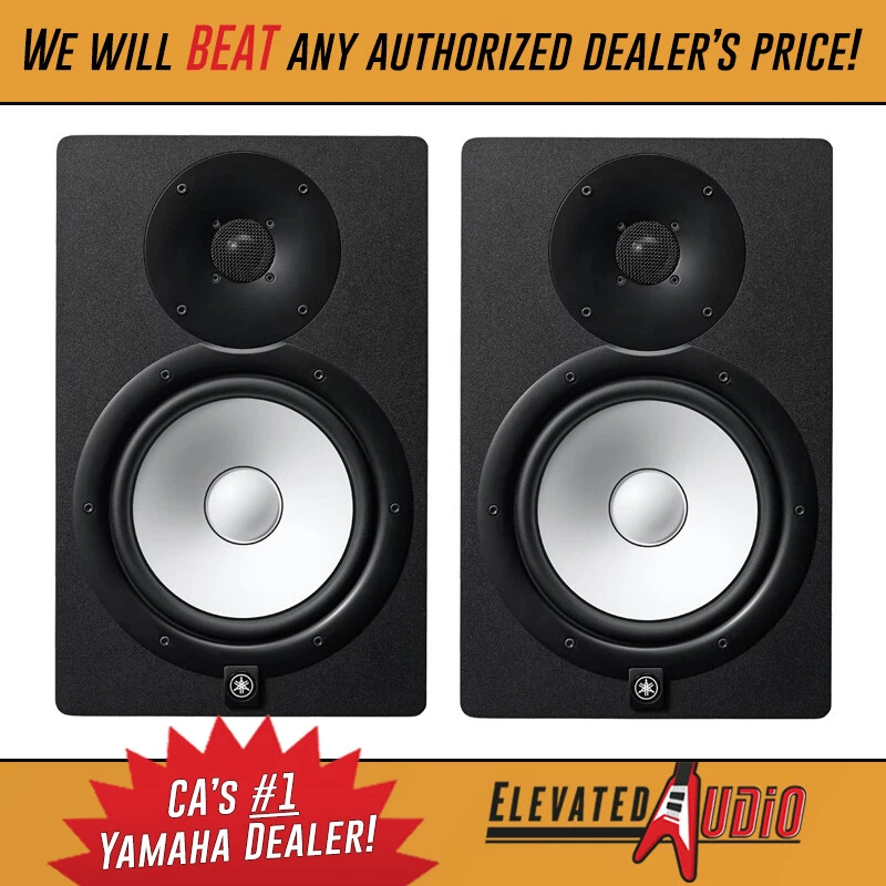 This sale is for one brand new pair of Yamaha HS8 Monitors (2 monitors total) that come with the Full Manufacturer's Warranty and are in sealed boxes .The Yamaha HS8 Monitors are of course BEST in Class in this price range and no other reference monitor comes close to the flat and accurate response that these monitors have. There has never been a better time to own a set of these Fantastic Monitors than now. We also sell sound cards, cables, stands and foam pads, message us if you need to add anything else on to your purchase. Buy Confidently from Elevated Audio, CA's #1 Dealer !! Sound Philosophy of HS Series Studio Monitors When selecting studio reference monitors for mixing and music production, one consideration takes precedence above all others - accuracy. Beginning with the legendary NS-10M, and continuing with the MSP and previous HS Series, this new lineup shares a design philosophy that emphasizes sonic purity without any coloring or alternation of the original sound. While many manufacturers seek to enhance the sound of their monitors to make them sound impressive, Yamaha studio monitors are designed to achieve the best possible mix by ensuring that the sound from your speakers is true to the original. HS Series nearfield reference monitors are the embodiment of this philosophy, delivering a concise sound image, high resolution, and flat response. Newly Developed Transducers The HS Series features newly developed transducers that achieve astonishingly smooth response over a wide range of bandwidth. These transducers utilize an advanced magnetic field design that regulates the flow of magnetic response to provide seamless, natural sonic transitions. Each component's materials and design were carefully re-examined, then optimized, to drastically improve the accuracy of signal reproduction throughout the audio spectrum. - Twetter The HS Series features a newly designed, highly efficient 1" dome tweeter that extends the usable frequency range considerably and delivers superb high-resolution sound. Utilizing a thick wave guide designed to minimize vibration the new tweeter is able to deliver smooth, distortion-free high end up to 30 kHz. - Woofer With newly designed, ultra-responsive woofers that utilize large, carefully selected magnets, HS Series monitors produce low distortion sound with a well-defined bottom end at any output level. All of the components in these high-power woofers, including the woofer ring and the basket further contribute to the HS Series' stunning bass while providing clear, accurate mids. High Performance Amp Unit HS Series speakers employ an amplifier unit perfectly matched to the transducers utilized in each model of the series. Featuring a bi-amp design with a separate dedicated amp for both the woofer and the tweeter, this amplifier unit ensures that each HS Series speaker consistently delivers high-resolution sound with exceptionally flat response across the sound spectrum. Low Resonance Enclosure Design HS Series cabinets are designed to eliminate unwanted resonance and increase the accuracy of sound reproduction to their extreme limit. The enclosures are constructed from a very dense and resilient MDF with a damped acoustic response that is perfectly suited for reference monitors. Drawing from Yamaha's over 100 years of piano design experience, HS Series engineers also employed a traditional three-way mitered-joint technique. Common to architectural design this construction firmly anchors the corners of the enclosure to dramatically improve durability and eliminate unwanted resonance that can influence overall sound. Cutting Edge Noise Reduction Technology Speaker port design can greatly influence the clarity of overall sound. Often a vortex at the either end of the port can generate air vibrations inside of the port, causing unwanted noise. By adopting an advanced noise reduction technology that incorporates a thorough analysis of a visual representation of the sound, Yamaha's engineers are able to control and reduce the vortex. Through this in-depth analysis we have arrived at the ideal port design, resulting in a reduction of audible noise up to 6dB. The utilization of this state-of-the-art technology allows HS Series studio monitors to meet the demands of more strict professional production environments. Controls and Connectivity HS Series full-range models feature two response controls with detailed settings that allow them to adapt to the surface acoustics of rooms of varying shape and size. ROOM CONTROL allows you to attenuate the unnatural, exaggerated low-end that can often occur when speakers are placed next to walls, while HIGH TRIM allows for more flexible control of high frequency response. For inputs, HS full-range speakers can accommodate a wide range of balanced and unbalanced sources such as mixers, keyboards and audio interfaces with XLR and TRS phone jacks. With the HS8S subwoofer, HIGH CUT control sets the cutoff frequency of subwoofer output high-frequency attenuation from 80Hz to 120Hz, while PHASE switch adjusts the phase of the subwoofer output. The LOW CUT switch and LOW CUT controls enables attenuation of low frequencies for output between 80Hz and 120Hz. The HS8S subwoofer is equipped with XLR and TRS phone jack inputs and for outputs XLR for L and R and EXT SUB out.