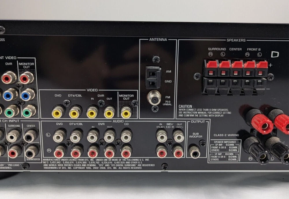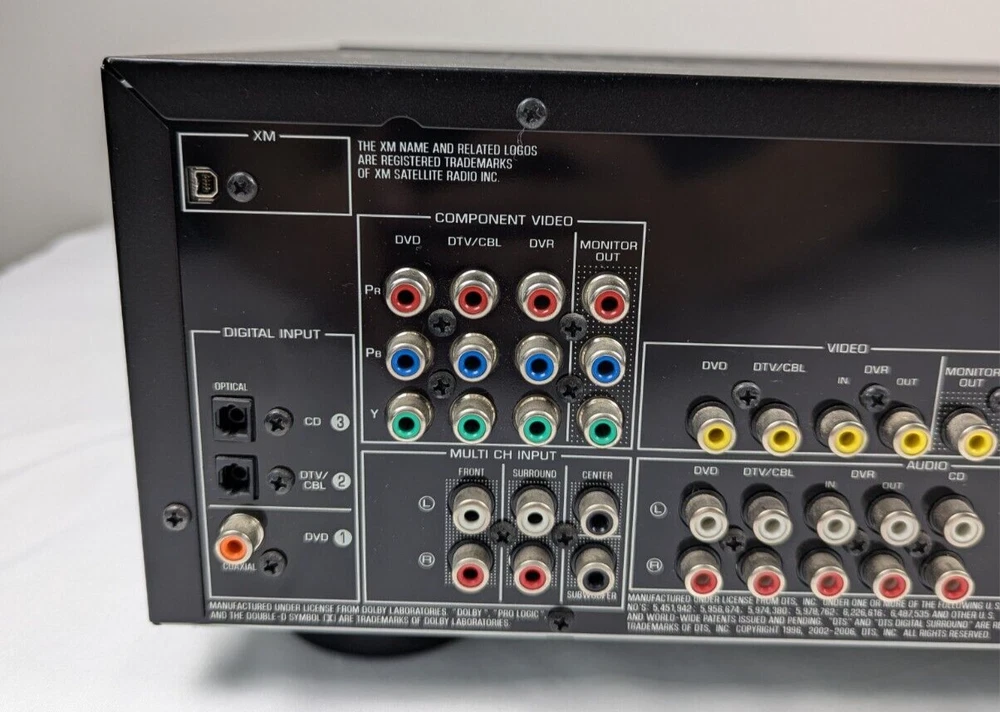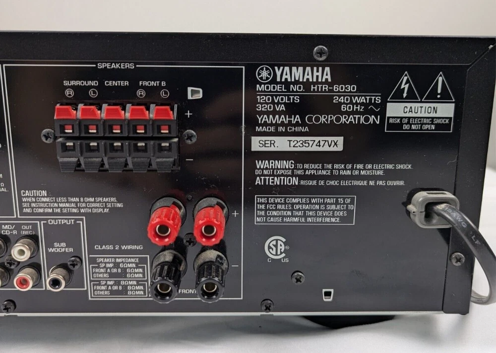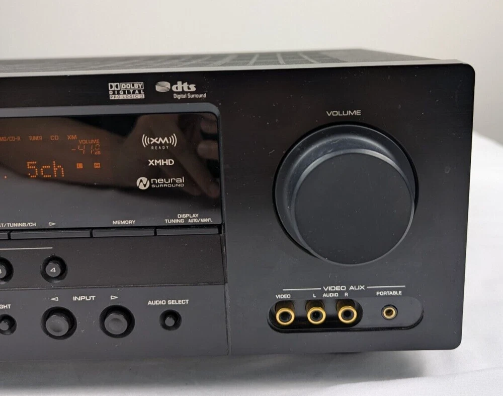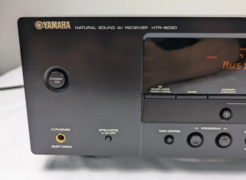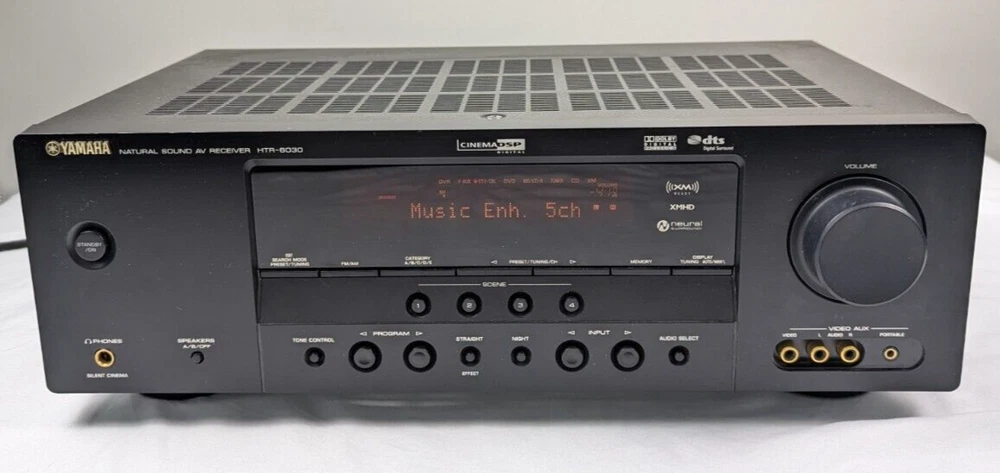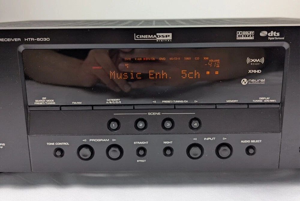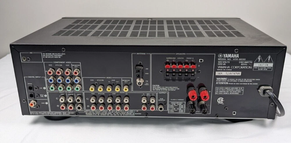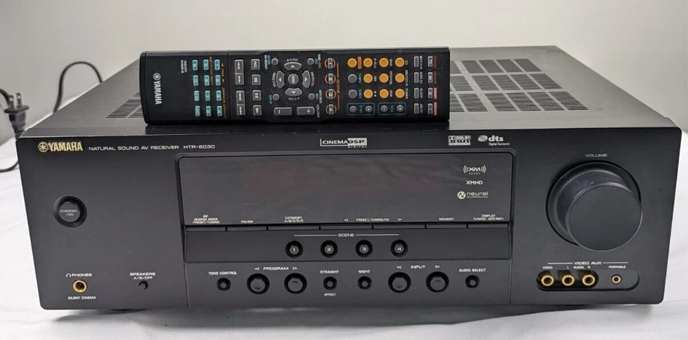 Yamaha HTR-6030 Receiver Amplifier Tuner Dolby Digital DTS XM HD - with Remote Tuning range: FM, MW Power output: 100 watts per channel into 8Ω (stereo) Surround output: 100W (front), 100W (center), 100W (rear) Frequency response: 10Hz to 100kHz Total harmonic distortion: 0.9% Input sensitivity: 200mV (line) Signal to noise ratio: 100dB (line) Channel separation: 45dB (line) Output: 200mV (line) Digital inputs: coaxial, optical Video Connections: component, composite