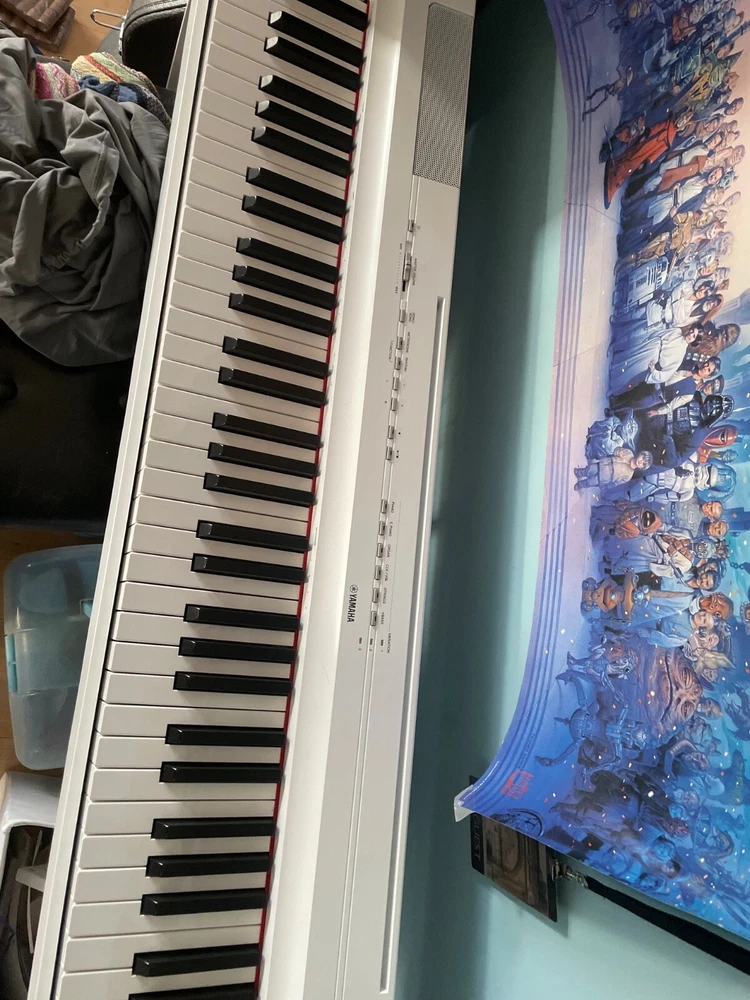 Very slightly used but a bit older. Missing the thing that props up the music sheets