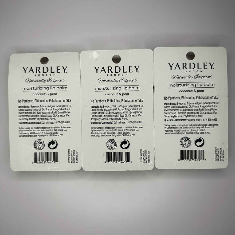 Yardley London 3 Pack Lot Moisturizing Lip Balm Coconut & Pear Paraben Free Please see the pictures for the ingredients of the item No Parabens, Phthalates, Petrolatum or SLS Two lip balms in each pack for a total of 6 LOT CODE:001323273A MFG DATE:09/30/2023 EXP DATE:09/30/2026 ITEM#YD254631