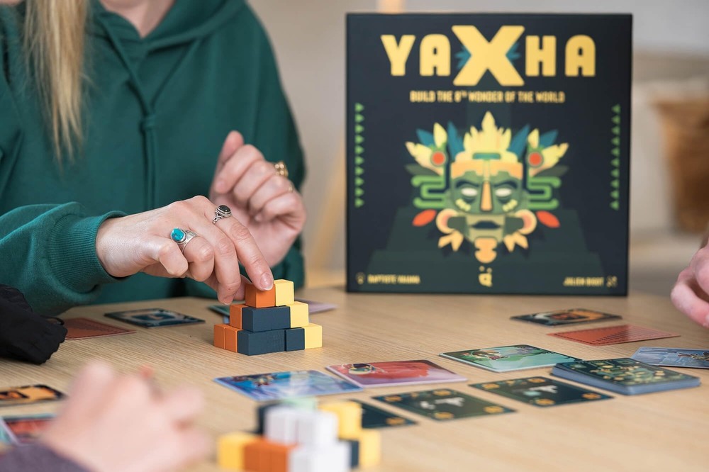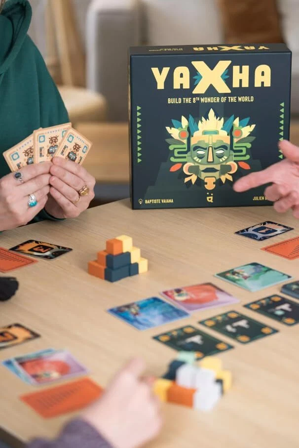 In Yaxha, you’re competing to build the most beautiful Mayan temple amongst all the players. Try to get the best sets of stones from the markets and to place them in the best way to win the game. Be careful, your opponents are likely to steal the stones you yearn for… Yaxha is a game with simple rules, but which requires strategy and a good sense of timing! How to play: The game is played over 10 rounds. Each round has stages: Buying resources and Building your Temple. At each turn, sets of 3 stone blocks become available at the markets (stone blocks come in 5 different colors). All the players choose simultaneously the set they would like to get from the markets. If a player is alone at the market, they will get the corresponding set. If several players are competing for the same set, turn order tiles will define who picks a set first. (Turn order tiles are swapped between players in case of a tie, after collecting the stones.) Then, all the players assemble their temple with the purchased stones to make the longest color series. There are few constraints to build the most beautiful Mayan pyramid and win the game. Place the stones wisely to get the most victory points and don’t forget the common objectives, as they can make all the difference. So look out for the most yellow, the most eclectic or the longest series of all colors.0 MASTER MAYAN STRATEGY: Compete to construct the most powerful Mayan pyramid. Guess your opponents' moves and strategically select stones from the market. DYNAMIC GAMEPLAY: Fast and fluid turns ensure an engaging experience, while robust player interaction and strategic depth challenge your decision-making skills. EDUCATIONAL AND FUN: Not only is Yaxha a thrilling game, but it also offers a cultural journey into Mayan history, making it educational for children and adults alike. PERFECT FOR FAMILY GAME NIGHT: Designed for 2-4 players aged 8 to 99, enjoy a 20-minute game that’s perfect for family gatherings and social game nights. QUALITY COMPONENTS: Includes 120 high-quality wooden stones, a durable cloth bag for stone drawing, 8 unique market tiles, and 44 insightful game cards.