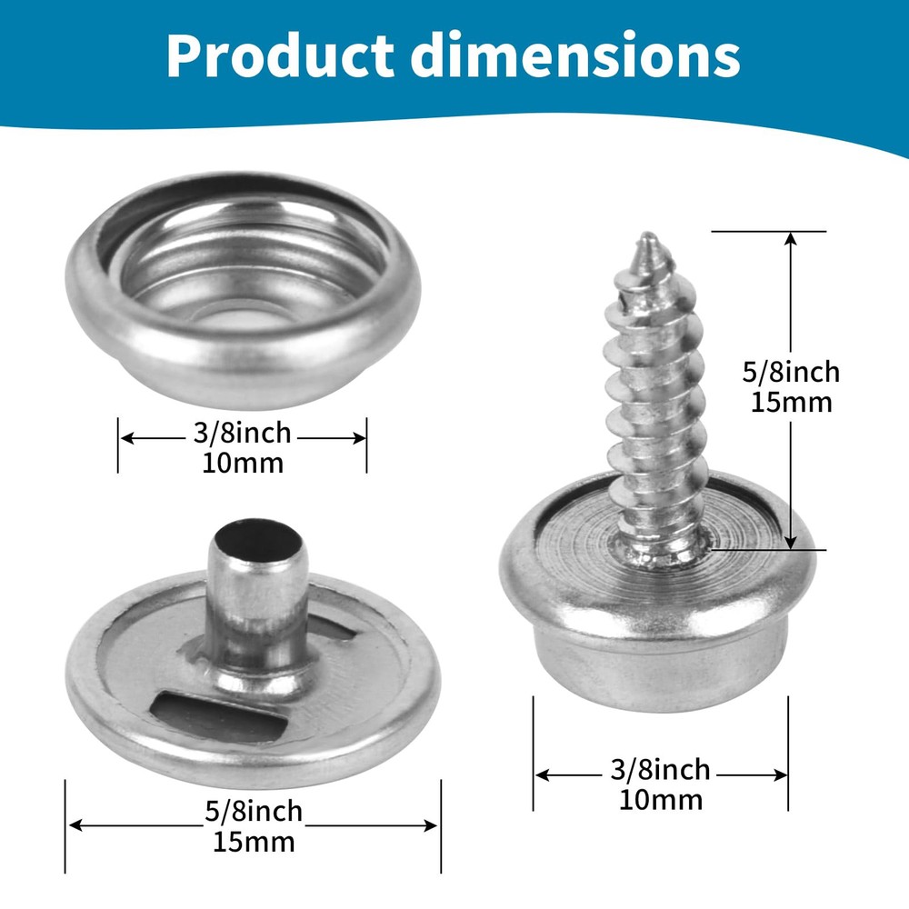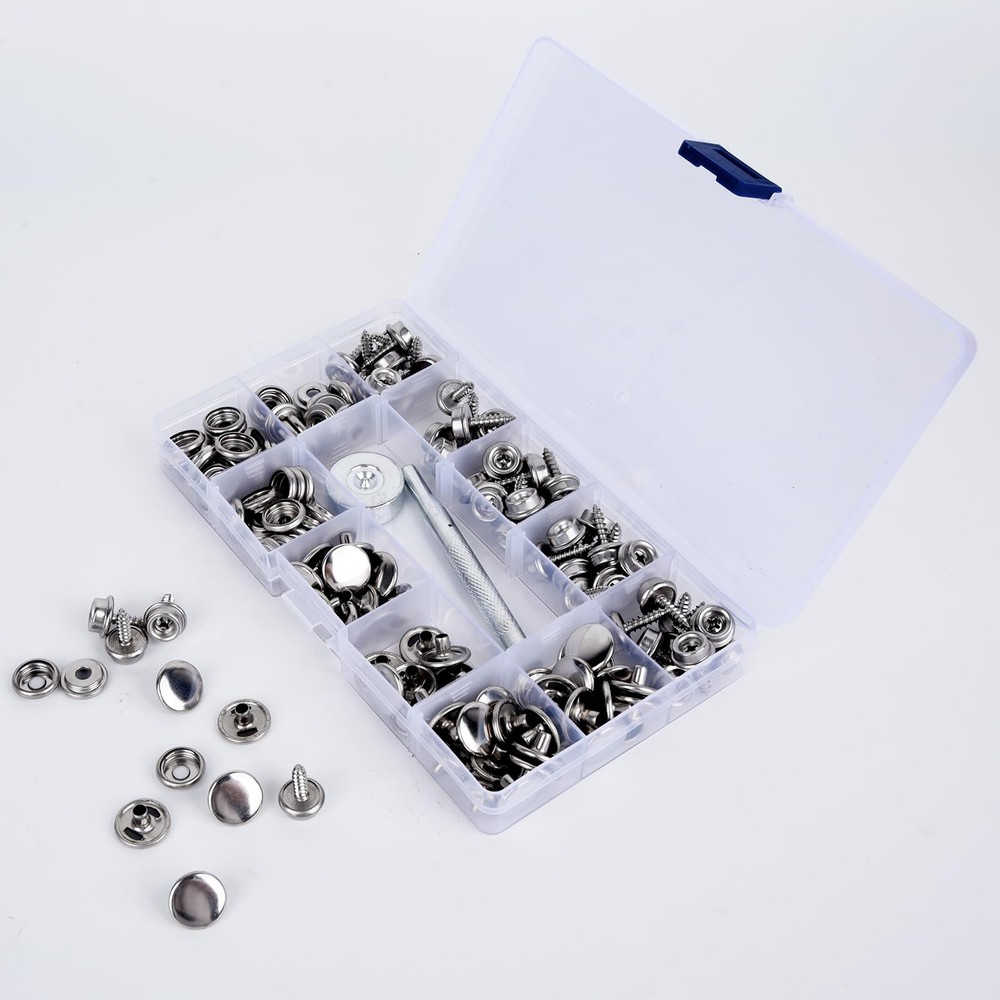 Package 50 pieces x socket 50 pieces x hats 50 pieces x screws (10mm) 20 screws (15mm) 1 x anvil 1 x expanding tool 1 x storage box Features 1.Material: stainless steel 2.Color: black 3. Scope of application Metal snaps are widely used on canvas, carpet, leather, tent repair kits, awnings, canvas, lawn furniture, boat accessories, etc. It's a useful snap tool for your house, boat, tent or even camper. Can be used indoors and outdoors to meet your needs 4. As long as it is installed, it can be used for a long time and should not be dropped. It is sturdy and durable. When you purchase this product, you will receive 50 5/8-inch screws, 50 sockets, 50 covers, 1 x expanding tool and1 x anvil, stored in a plastic box for easy identification and storage. The snap repair kit is made of 100% new -high-quality stainless steel, which can prevent corrosion even in salt water and humid environments. The material is strong and durable, not easily damaged, and has a long service life. Suitable for construction in various environments. Metal snaps are widely used on canvas, carpet, leather, tent repair kits, awnings, canvas, lawn furniture, boat accessories, etc. It's a useful snap tool for your house, boat, tent or even camper. Can be used indoors and outdoors to meet your needs Easy to use: snaps for boat covers come in sets and are equipped with installation tools. The quantity is sufficient to meet the installation needs of any place. There is no need to worry about quantity issues. Not easy to fall: Just fix the mounting screws and caps on the items you need, use the mounting tools to fix them again, it will be very strong even if time passes, if you have any questions you can us