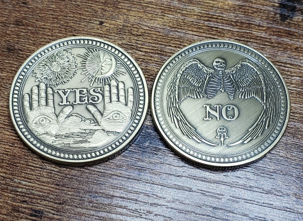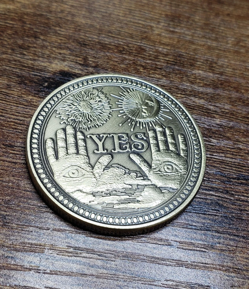 One new Yes or No Decision-Making coin in a dark bronze color. This large coin is 1.5" in diameter and weighs one ounce. Features spiritual and occult symbols.
