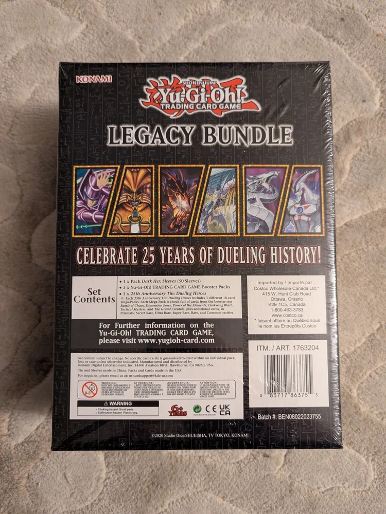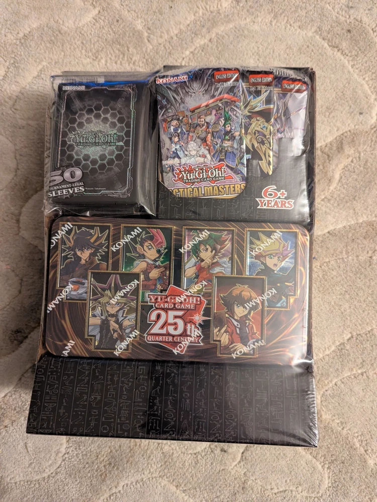 The "Yu-Gi-Oh! 25th Anniversary Legacy Bundle Trading Card Game" is a special Anniversary Pack series released in 2023. This pack features cards from the popular Yu-Gi-Oh! TCG franchise, designed to commemorate the 25th anniversary of the game. Suitable for ages 6 and up, this bundle offers a unique and collectible set of cards for fans and collectors alike. Contains: 1 x Pack Dark Hex Sleeves (50 sleeves) 3 x Yu-Gi-Oh! Trading Card Game Booster Packs 1 x 25th Anniversary Tin: Dueling Heroes Each 25th Anniversary Tin includes 3 different 18-card Mega-Packs. Each Mega-Pack is chock full of cards from the booster sets Battle of Chaos, Dimension Force, Power of the Elements, Darkwing Blast, Tactical Masters, and The Grand Creators, plus additional cards, in Prismatic Secret Rare, Ultra Rare, Super Rare and Common rarities. No specific card rarity is guaranteed to exist within an individual pack, box or case unless otherwise indicated.