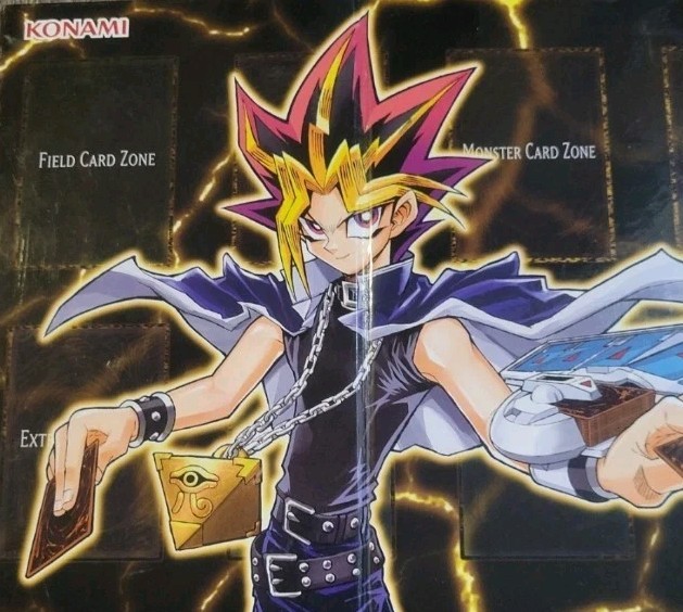 The product is a Yu-Gi-Oh! trading card game mat board manufactured by Konami in 1996. It is a standard playmat featuring the character Yugi Muto from the popular anime series. The double-sided design includes artwork from the Yu-Gi-Oh! franchise, making it a must-have accessory for fans of the card game. This collectible item is perfect for enhancing gameplay and displaying as a collectible piece for any Yu-Gi-Oh! enthusiast.