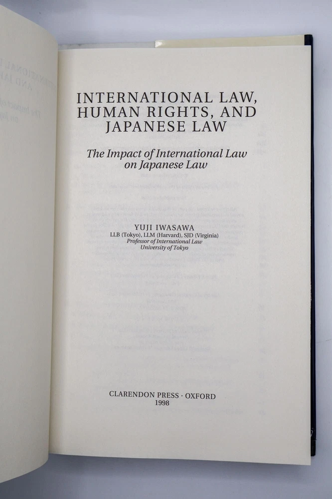 INTERNATIONAL LAW, HUMAN RIGHTS, AND JAPANESE LAW: THE IMPACT OF INTERNATIONAL LAW ON JAPANESE LAW Author: Iwasawa, Yuji Title: INTERNATIONAL LAW, HUMAN RIGHTS, AND JAPANESE LAW: THE IMPACT OF INTERNATIONAL LAW ON JAPANESE LAW Publication: Oxford: Clarendon Press, 1998 Edition: First Edition, First Printing Description: Octavo, 355 pages. In Very Good minus condition with a Very Good dust jacket. Spine navy blue with white lettering. Dust jacket protected with mylar covering. Slight warping to text block. Interior pages clean. Shelved Case 8 1/2. Seller ID: 1392453 Subject: Asian History & Culture, Dupont Circle, Politics, Government, and Law Welcome to the eBay store of Second Story Books! DC's Oldest Rare and Used Bookstore, Second Story Books operates two open shops in the Washington D.C. metropolitan area. We have an extensive internet presence and provide accredited appraisals member ASA. This listing was created by Bibliopolis.