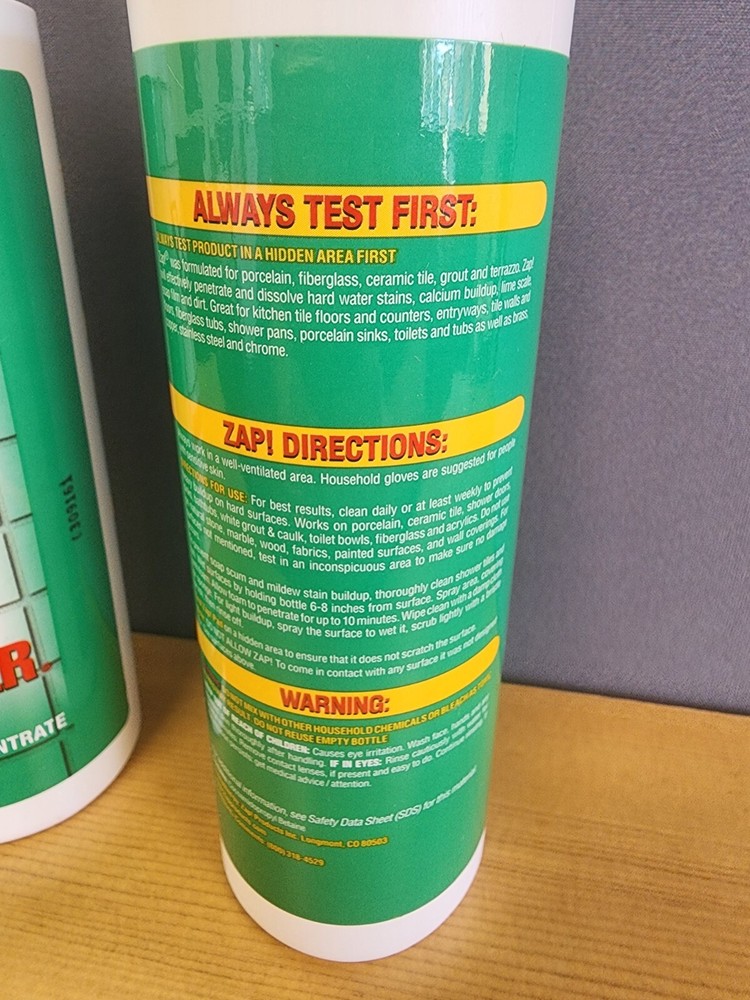 ZAP! 2 - 10 oz Professional Maintainer Tile & Grout Cleaner NEW! Sealed . Two Brand New and Sealed. Detail pictures are attached. Sold as is as pictured in the listing.