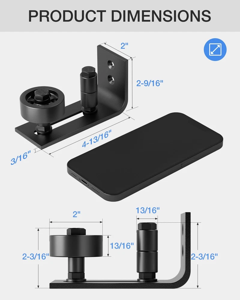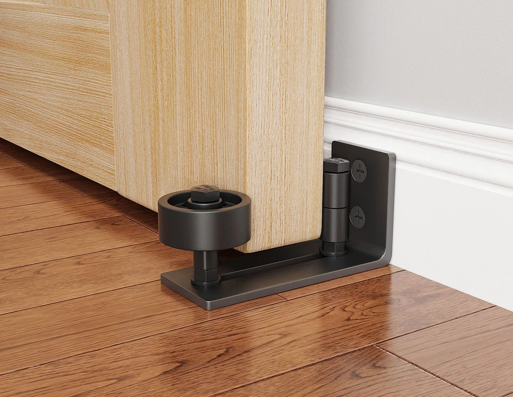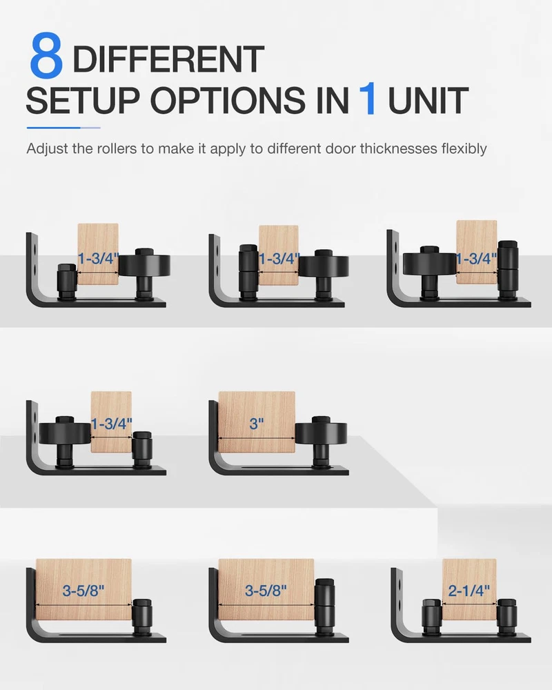 WHAT WE USE: Our barn door floor guide is made of solid carbon steel with a fine black powder-coated surface for anti-corrosion, rust, scratch, and long-last. The roller is made of excellent POM nylon, allowing you to enjoy every quiet and smooth slide FUNCTIONAL DESIGN: 8 setup options combined in 1 barn door floor guide, can accommodate different thickness doors flexibly, thickest to 3-3/8 inch, also good with thinner doors. The adjustable roller allows our barn door guide to fit almost any barn door AETHETIC LOOK: Our barn door floor guide fits for ungrooved doors, no need to drill holes, perfect for carpeted or tiled floor. This barn door floor guide has a flat bottom that is fully flush with floor, with no gaps between them so won't ruin your floor WIDE APPLICATION: Our barn door floor guide can be widely used for bedrooms, cabinets, windows, closets, farm doors, and more, also not limited to interior and exterior use. This barn door floor guide will be your barn door hardware kit's best helper WARM TIPS: Our barn door floor guide will come with user-friendly instructions and all needed hardware. 2 sizes of wrenches help you adjust the small and big rollers. Any questions or concerns, our customer service team is more than happy to assist you