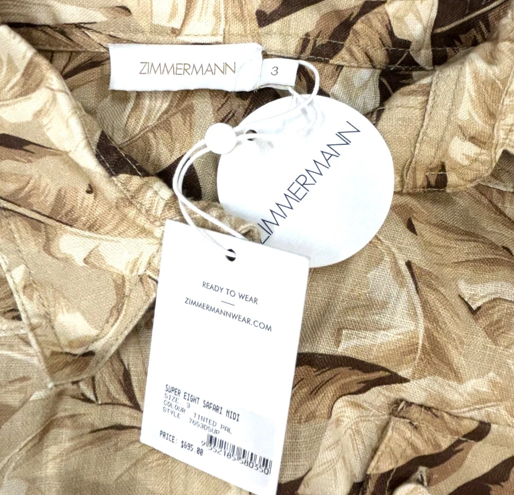 ZIMMERMANN SUPER EIGHT PALM TREE PRINT LINEN BELTED SAFARI SHIRT DRESS IN NEUTRALS Size 3 (AU/UK 14, US 10) Pls refer to brand website for more specific info re sizing Brand new with tags Safari style shirt dress Printed 100% Linen Pleated back Short sleeves with Buttoned tabs Detachable belt with bamboo circle buckle detail Folded cuffs Two side slit pockets Breast pockets Button fastenings through front Curved hem Non-stretchy fabric Mid-weight fabric Delicate dry clean 100% Linen ***pls note this is a brand new dress and condition is as such - however there is a tiny mark on the back of belt, if you refer to last pic & zoom in you might be able to see it, however due to the nature of the busy print its really not noticeable but wanted to disclose*** If you have any questions or require more details, photos ect pls don’t hesitate to msg me Pls check out my other listings - am open to reasonable offers (no low balls pls) and happy to combine postage #designer #australian #alemais shona joy alice mccall acler aje spell tropical safari African Safari Holiday
