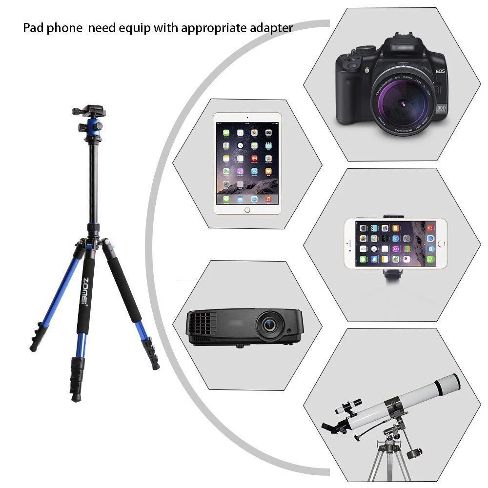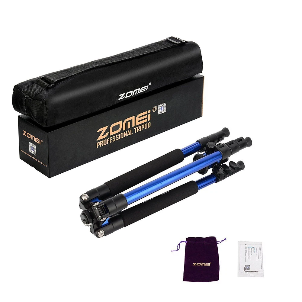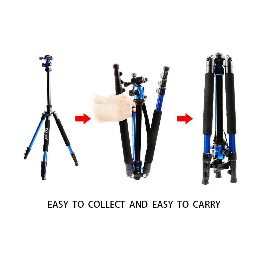 ZOMEi Q555 62.5Inch Lightweight Tripod with Carrying Case Q555 is lightweight and portable, a high quality tripod that fits into carry-on luggage and backpacks, ideal for travel companion. Lightweight and Compact Weights only 2.9lbs, making it perfect for all events, such as sports activities, camping, family gatherings and much more. The tripod legs can be inverted and folded back 180 degree, giving it a compact size of 17.5". Ball Head Universal ball head design with 3 lock knobs and 360 degree panoramic panning dial,suitable for horizontal panoramic shooting. Quick-Release Plate The qucik release mounting plate enables you to attach and detach your camera in seconds. 4-Section Legs, Quick Flip Leg Locks 4-section aluminum alloy tubes with Quick Flip Locks glide in and out with ease, offers a height range of 22.7" to 62.5". It's legs are also individually adjustable to 25, 50 and 80-degree angles. Center Column For lowe-angle shots, it's a snap to invert the center column and put your camera below the tripod. Technical Specifications: Model: Q555 Material: Aluminum Alloy Head Type: 360 degree Ball Head Maximum Height: 62.5" / 160cm Minimum Height: 22.7" / 58cm Folded Length: 17.5" / 45cm Leg Sections: 4 Standard National Screw: 1/4" Ball Head Weight: 0.26kg / 0.57lbs Tripod Net Weight: 1.32kg / 2.9lbs Loading capacity: 8kg / 17.6lbs Color: Black Package Includes: 1x Q555 Tripod(with ball head) 1x Ball Head Bag 1x Carrying Case