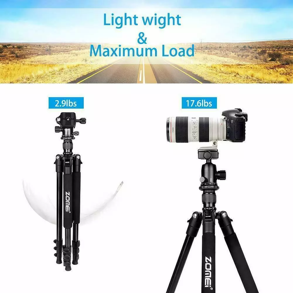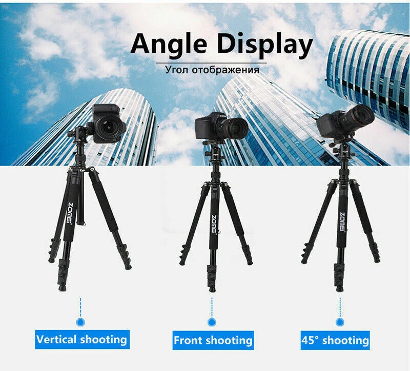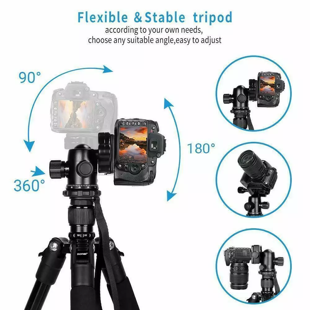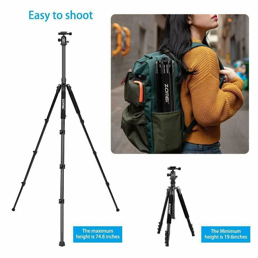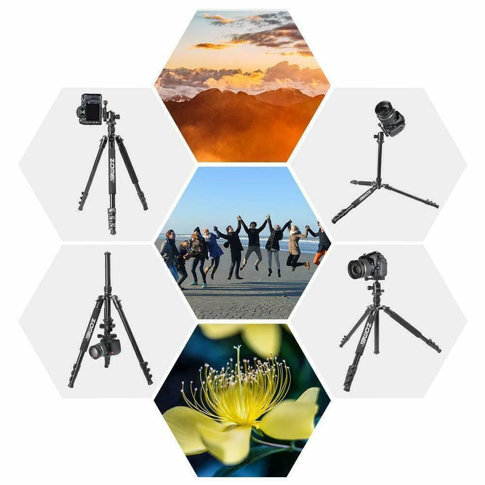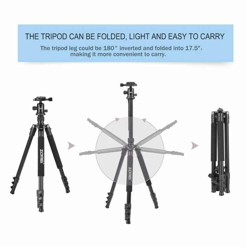ZOMEI Q555 Professional Aluminium Tripod&Ball Head Travel for Canon Nikon Camera ZOMEi 62.5” Camera Tripod Lightweight Compact Aluminum Alloy Tripod Stand with 360 Degree Ball Head as Panoramic Shooting for Various Cameras Canon Nikon 【TRAVEL TRIPOD】Weights just 2.89Lbs, lightweight for carrying around with ease. This tripod can be folded down to 17.5" for convenient portability and space-saving storage. Portable for travel and work 【USE FOR】Support camera DSLR,SLR, action camera, video and so on. Built from high-end ultra-precise CNC technology that reinforces its durability and makes every photo shoot perfect 【EASY SET UP】With the quick-release plate you can mount your camera on the tripod with seconds. 3 leg angle positions provide flexibility and enable shooting in cramped quarters or on irregular surface areas. Flip-up Leg locks control allows you a height range of 18" to 65" 【360°ROTATION BALL HEAD】360 degree swivel ball head allows panoramic and 3 knobs on the head for different shooting angles adjustment enables safe and precise shooting 【STABLE TRIPOD】 The central Column Hook allows you to hang additional weight from the tripod's center of gravity for increased stability. Separate Head and Pan Lock: Individual head tension and lock knob as well as pan lock help make the right adjustment ZOMEi Q555 62.5Inch Lightweight Tripod with Carrying Case Q555 is lightweight and portable, a high quality tripod that fits into carry-on luggage and backpacks, ideal for travel companion. Lightweight and Compact Weights only 2.9lbs, making it perfect for all events, such as sports activities, camping, family gatherings and much more. The tripod legs can be inverted and folded back 180 degree, giving it a compact size of 17.5". Ball Head Universal ball head design with 3 lock knobs and 360 degree panoramic panning dial,suitable for horizontal panoramic shooting. Quick-Release Plate The qucik release mounting plate enables you to attach and detach your camera in seconds. 4-Section Legs, Quick Flip Leg Locks 4-section aluminum alloy tubes with Quick Flip Locks glide in and out with ease, offers a height range of 22.7" to 62.5". It's legs are also individually adjustable to 25, 50 and 80-degree angles. Center Column For lowe-angle shots, it's a snap to invert the center column and put your camera below the tripod. Features: Technical Specifications: Model: Q555 Material: Aluminum Alloy Head Type: 360 degree Ball Head Maximum Height: 62.5" / 160cm Minimum Height: 22.7" / 58cm Folded Length: 17.5" / 45cm Leg Sections: 4 Standard National Screw: 1/4" Ball Head Weight: 0.26kg / 0.57lbs Tripod Net Weight: 1.32kg / 2.9lbs Loading capacity: 8kg / 17.6lbs Color: orange Center Column Shots The Tripod Legs Can Be Inverted And Folded Back 180 Degree, Giving It A Compact Size Of 17.5". Ball Head Universal Ball Head Design With 3 Lock Knobs And 360 Degree Panoramic Panning Dial, Suitable For Horizontal Panoramic Shooting. The Quick Release Mounting Plate Enables You To Attach And Detach Your Camera In Seconds. 4-Section Aluminum Alloy Tubes With Quick Flip Locks Glide In And Out With Ease, Offers A Height Range Of 22.7" To 62.5". Center Column For lower-angle shots. 180 degree Adjustment 4-section aluminum&alloy tubes with quick flip locks glide in&out, offers a height range of 22.7" to 62.5". It's legs are individually adjustable to 25, 50 and 80-degree angles. The tripod legs can be inverted and folded back 180 degree, giving it a compact size of 17.5". Tripod Package: 1 x Zomei Tripod with ball head and quick release plate 1 x Ball Head Bag 1 x Carry Case 1 x Instruction manual