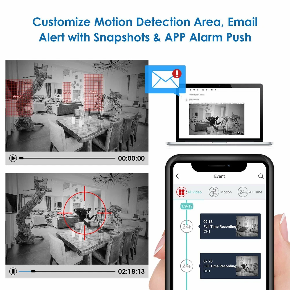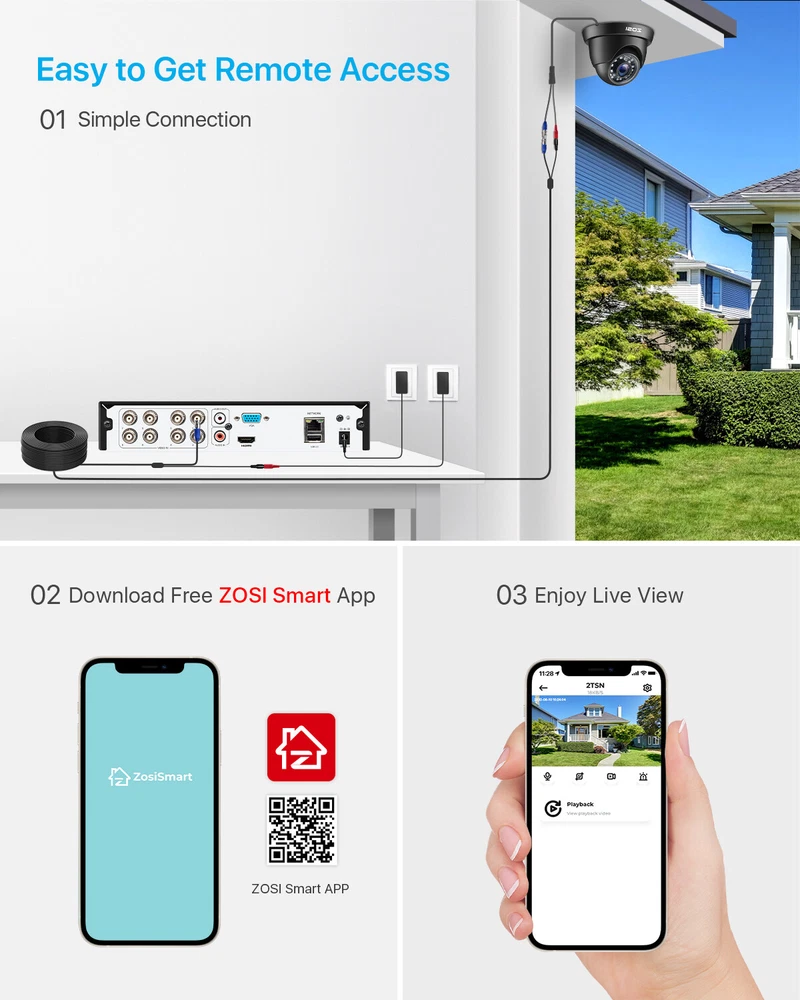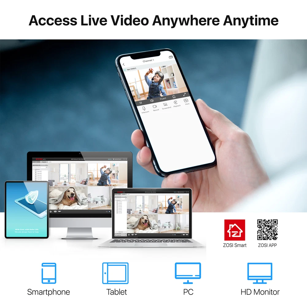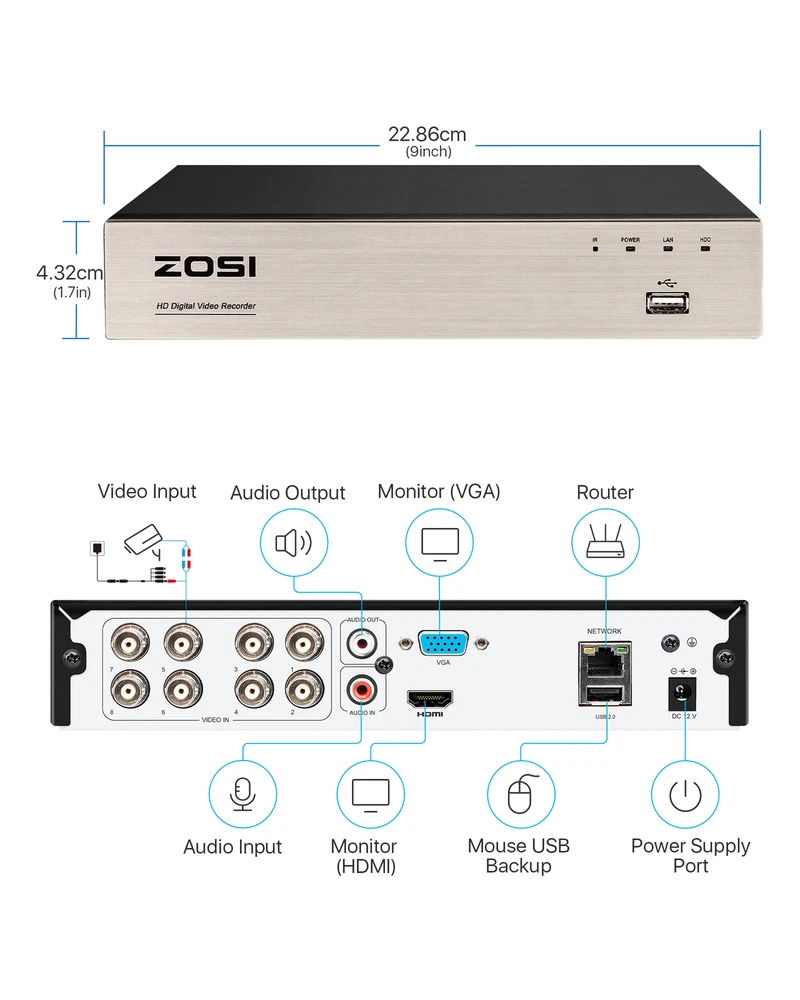 Please noted: This DVR comes with NO Hard Drive.(can view, but not record) . DVR Specification Compression Tech: H.265+ System Resources: Pentaplex function: live, recording, playback, backup & remote access. Recording Mode: Manual>Motion Detection>Continuous. Search Mode: Time/Date/Motion Detection & exact search. Video Outputs: HDMI / VGA . Video Inputs: 8 channel Audio Inputs/Outputs: 1CH/1CH. PTZ Control: Support. Hard Disk: 1 SATA ports(Max 8TB). USB back up: Support. Features: 1. Super Video Quality and Clarity: Supports 8-Channel 1080p Resolution 2. Multiple Trigger,Alarm Events: Recording, Tour, Video Push, Email, FTP, and Buzzer 3. Custom Record Modes (e.g. Manual, Scheduled, Motion Detection) and Record Intervals (1-120min) 4. USB Backup. you can transfer video files to back-up media via USB port . 5. View Your Home on Your Phone anytime anywhere. Remote Access in Minutes 1.Quick & Easy Connection 2.Download Free ZOSI Smart APP 3.Enjoy Live View Advanced H.265+ Video Compression Lower Bandwidth Less Storage Space Better Image Quality Customize Each Camera with Different Record Modes ZOSI DVR offers 4 kinds recording modes to meet your needs: Continuous Record ; Scheduled Record; Motion Detect Record; Recycle Record. Record Continuous: Your DVR will continuously record regardless of what is Happening Schedule Record: Record based on your own custom schedule time. Motion Dection Record: The DVR will only record when the motion is detected. Recycle Record: This allows your DVR to overwrite the oldest video files on the hard drive. You can customize each camera with different recording modes, which allows you to save spaceon the hard drive Reliable Video Playback Playback the crucial evidence or funny video records by time search. The ZOSI Smart free app lets you see all of your cameras in one place. Check-in on your home or business wherever you have an internet connection. Free ZOSI Smart App for Live View & Playback on Smart Devices with Wi-Fi or 2G/3G/4G Anywhere Anytime. Local View or Remote View from multiple devices Expandable Camera System 4-IN-1 security DVR: This 4-in-1 DVR supports Analog, TVI, CVI ,AHD security cameras. High compatibility could be easy to connect different cameras. 8 channel DVR: This dvr supports up to 8pcs cameras, so you could choose different cameras as your security need. Zosi have bullet camera, dome camera, black camera, white camera which is compatible for this system. Customizable Motion Detection Zones & Alert Reduce false and uselessmotion alerts Package Contents 1 x 8CH 1080p HD-TVI Digital Video Recorder 1 x 12V/2000mA Power Supply for DVR 1 x Mouse for DVR 1 x User guide for DVR NO Hard Drive
