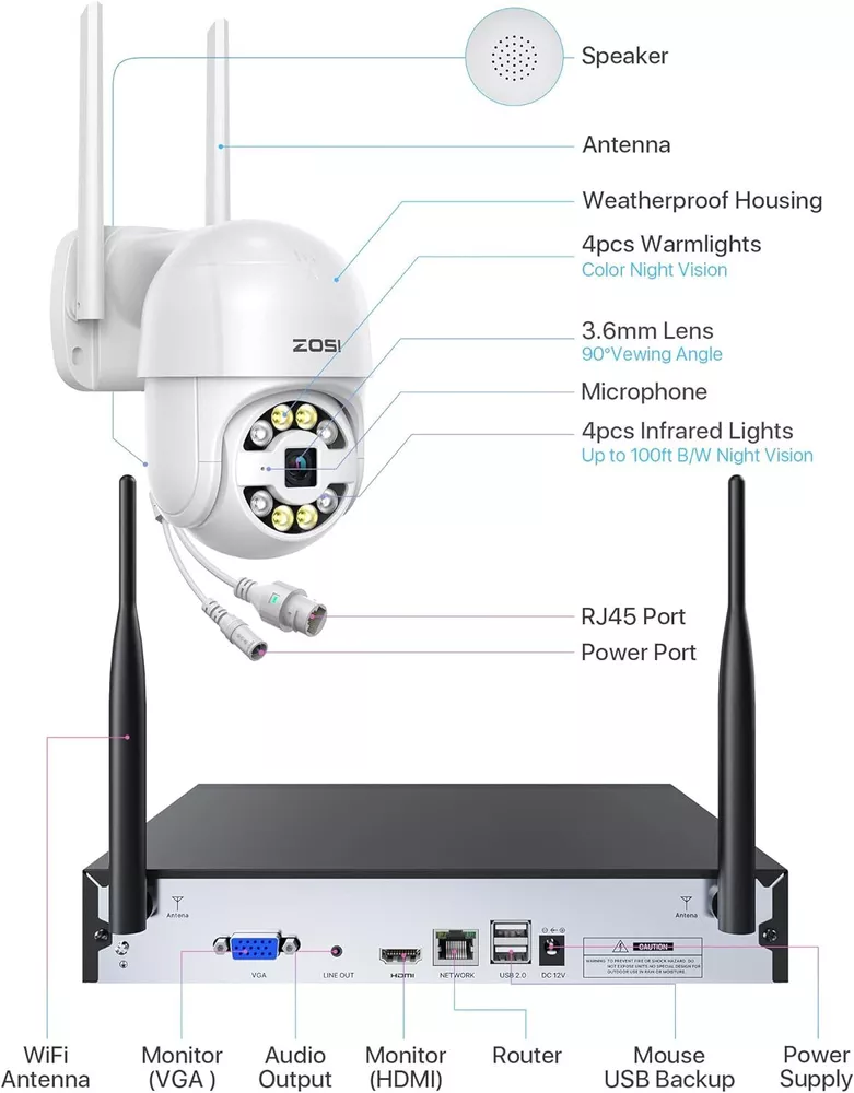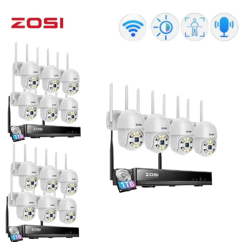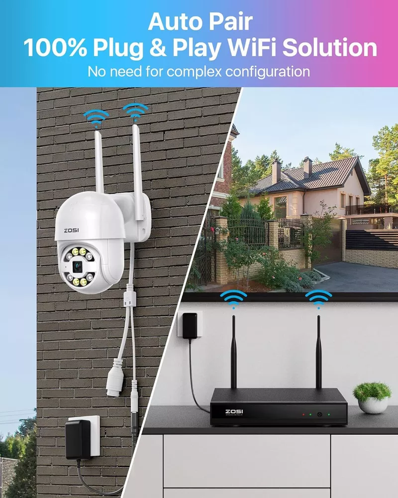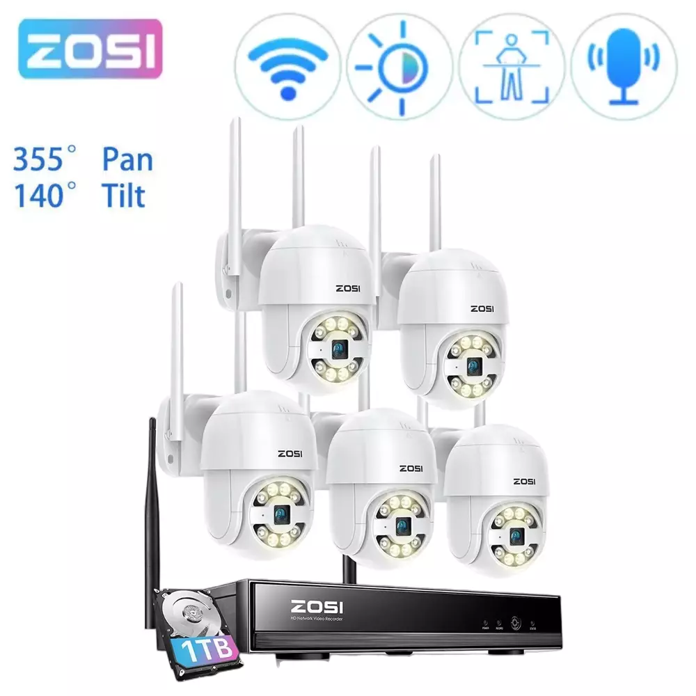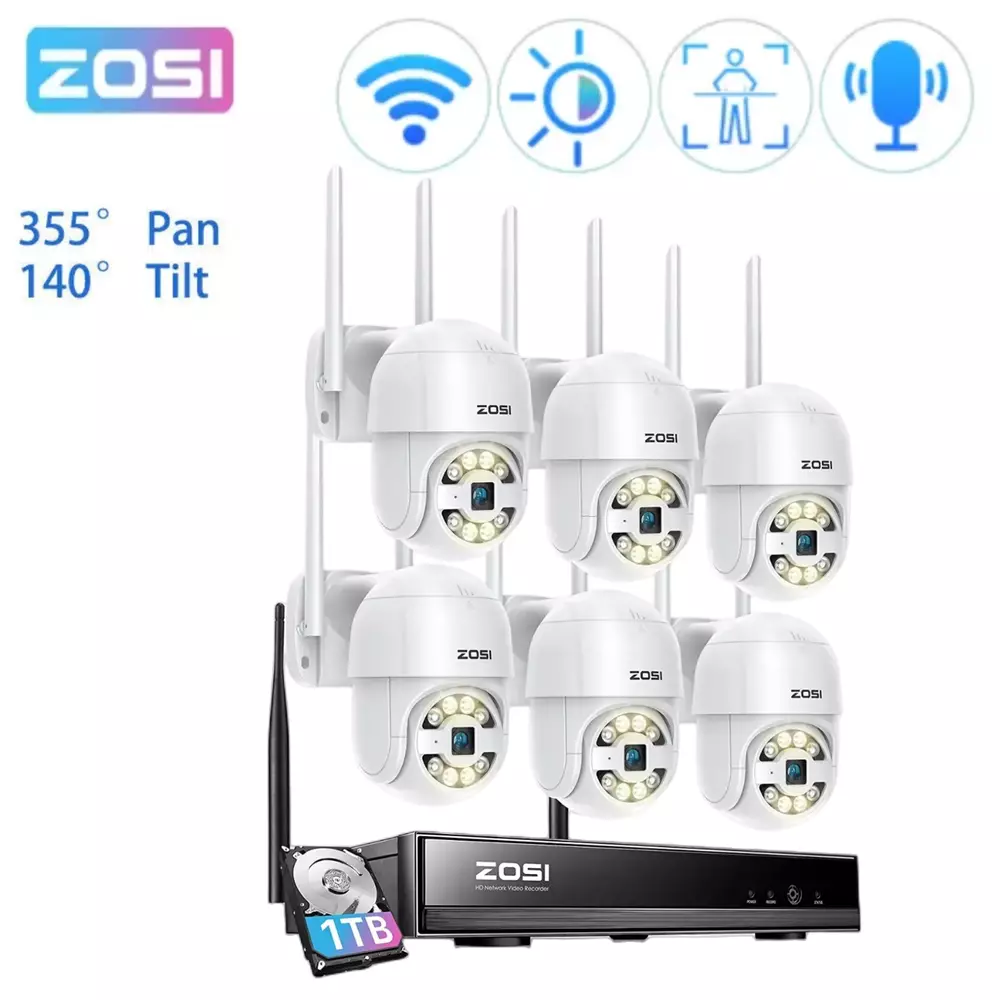 2K Super HD,See Things Clearly 3MP Resolution camera,super HD image,let you see the every details of the monitoring clearly on the ZOSI Smart Phone APP. Smart & Active Deterrence The camera detects humans and activates spotlight and siren alerts to send strangers running. See, Hear and Talk Remotely Use two-way audio to respond to guests or warn off the unwanted from anywhere. On Guard Rain or Shine IP66 weatherproof casing makes it tough enough to withstand harsh weather conditions. Easy Live View & Playback Get instant access and control to your cameras via the free Zosi Smart App/AVSS Client any time, anywhere, from any device. Secure Storage & Reliable Recording With built-in 1TB HDD and expandable storage up to 8TB, you can have all the critical moments stored securely for later playback. Customize Your Security System This camera system can be expanded to 8-camera kit, so you can add more compatible ZOSI WiFi cameras (ZG2893M/ZG3063M) to meet your security needs. High-Gain 5dBi Dual Antenna The 5dBi dual antenna can effectively enhance wall penetration and anti-interference performance, providing strong and stable WiFi signal. Over-the-Air Technology OTA Technology supports directly upgrading the NVR system through the server, one click to realize the program upgrade. Save Storage Space H.265+ plus AVBR video coding compresses video file sizes 50% more efficiently than H.264, saving you lots of hard drive space. On Mar 21, 2023 at 02:32:13 PDT, seller added the following information: