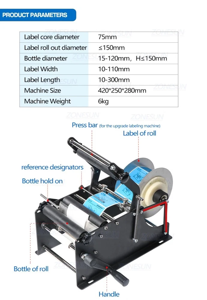 Item specifics Condition New: A brand-new, unused, unopened, undamaged item in its original packaging (where packaging is applicable). Packaging should be the same as what is found in a retail store, unless the item was packaged by the manufacturer in non-retail packaging, such as an unprinted box or plastic bag. See the seller's listing for full details. See all condition definitionsopens in a new window or tab Brand Unbranded is_customized No Origin Mainland China Model ZS-50 LABELING MACHINE MPN Does not apply Model Number ZS-50 LABELING MACHINE Type Hand Tool Parts UPC Does not apply Item description from the seller Desc ription : s pray bo ttle cosmetic packaging shampoo bottle lotion bottle glass bottle It can help you remove a label from its liner or backing paper easily. This machine is widely used in manufacturing, bulk mailing, packaging, and the food and beverage industry. Manual labeling machine are useful for small jobs. Main Parameter: Speed:30times/min Accuracy:+/-0.5mm Label Roll inner diameter: ≥75mm Label Roll Out diameter: ≤150mm Bottle diameter:15-120mm, height ≤150mm Label width:10-110mm Label Length:10-300mm Machine size:420*250*280mm Machine weight:6kg Application: This machine is Suitable for round bottles like PET bottle, plastic bottle, glass bottle, metal bottle, etc.Widely used in cosmetics, beverage, foodstuff, food, medical industries. Rapidly raise the production efficiency, and the label quality.