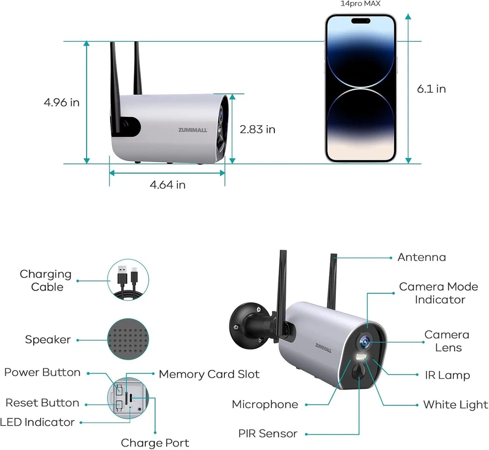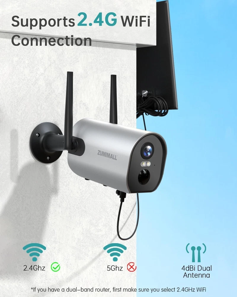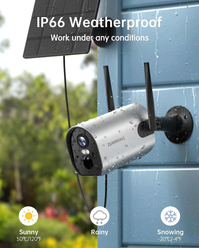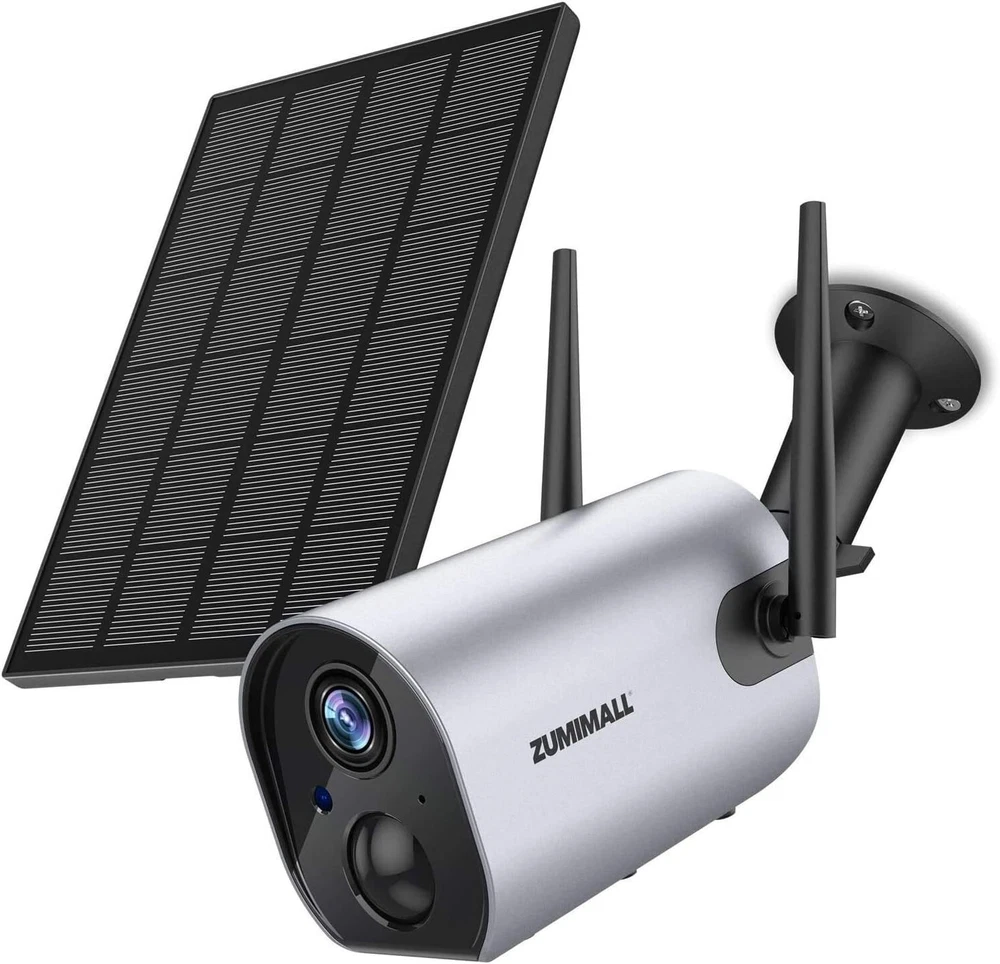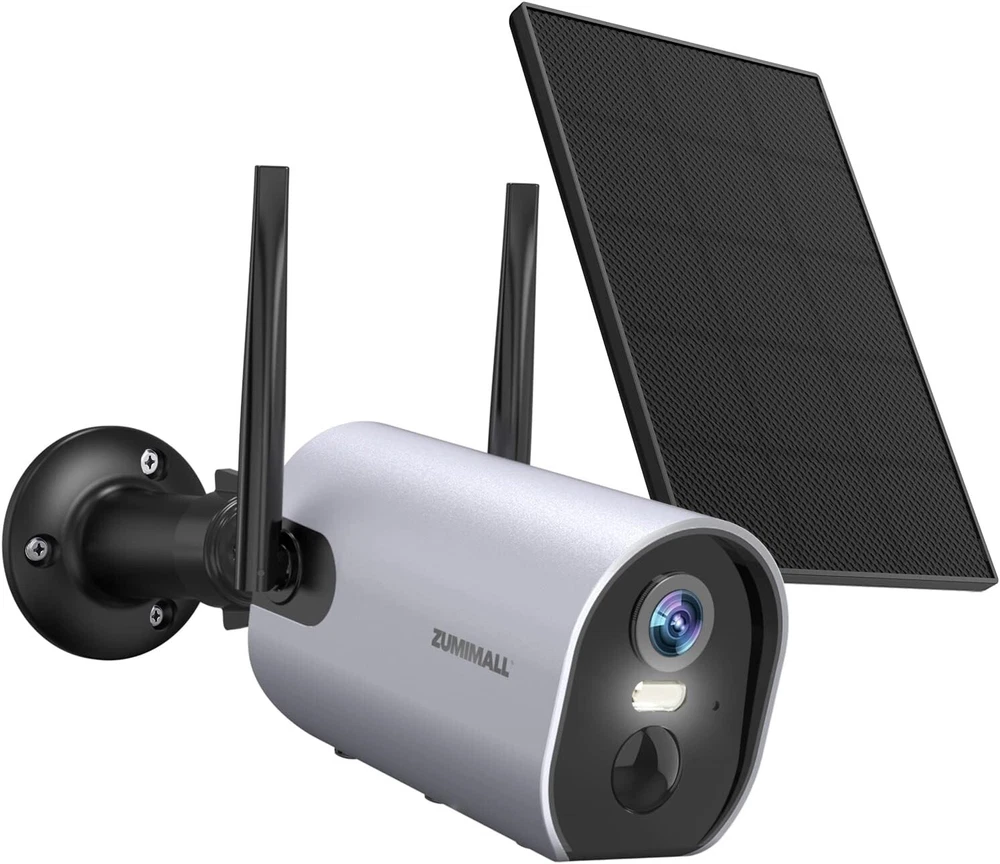 ZUMIMALL Security Cameras Wireless Outdoor, 2K Solar Powered Security Camera with 3MP Color Night Vision, Outdoor WiFi Surveillance Camera/2 Way Talk Brand ZUMIMALL Connectivity Technology Wireless Special Feature Easy to Install Indoor/Outdoor Usage Outdoor Features 【365 Day Solar Power Supply & Rechargeable Battery】- Security Cameras Wireless Outdoor ,Solar powered, plugged, and powerful rechargeable battery, this wireless outdoor camera can keep running with non-stop power. No worries to take off the camera to charge. 【Upgraded PIR Motion Detection & Real-time Alerts】- Security camera solar powered with improved PIR sensor and adjustable sensitivity allow ZUMIMALL outdoor security camera to capture human motion only. Spotlight and alarm will turn on automatically when motion is captured. When it is triggered, it will send instant alerts on your phone and automatically save videos to a memory card/cloud of your choice. Easy for you to check what is happening. 【2K FHD & IR Color Night Vision 】Security cameras wireless outdoor equipped with 4 infrared LEDs, Zumimall solar powered outdoor camera Wireless ensures you sharp images up to 33ft even in darkness. See everything detailed via a 120°wide view of full HD. Much Wider Angle, 4 Times Clearer Than 1080P. 【2-way Audio & Multiple Remote Access】- Outdoor camera wireless battery powered with Noise cancellation speaker & MIC makes interactively communication possible: talk with your elders, kids, postman or warm uninvited people while not at home. Multiple account sharing allows you share this WiFi camera with your family members to view it simultaneously. 【Totally Wireless Security Camera System】- Totally wire-free with 2 enhanced 4dBi antennas, this wireless outdoor security camera provides a stronger connection on 2.4Ghz WiFi, covering more areas in your house. (not compatible with 5G WiFi)