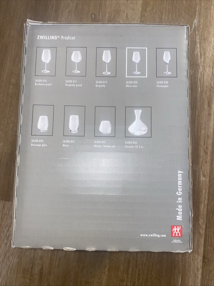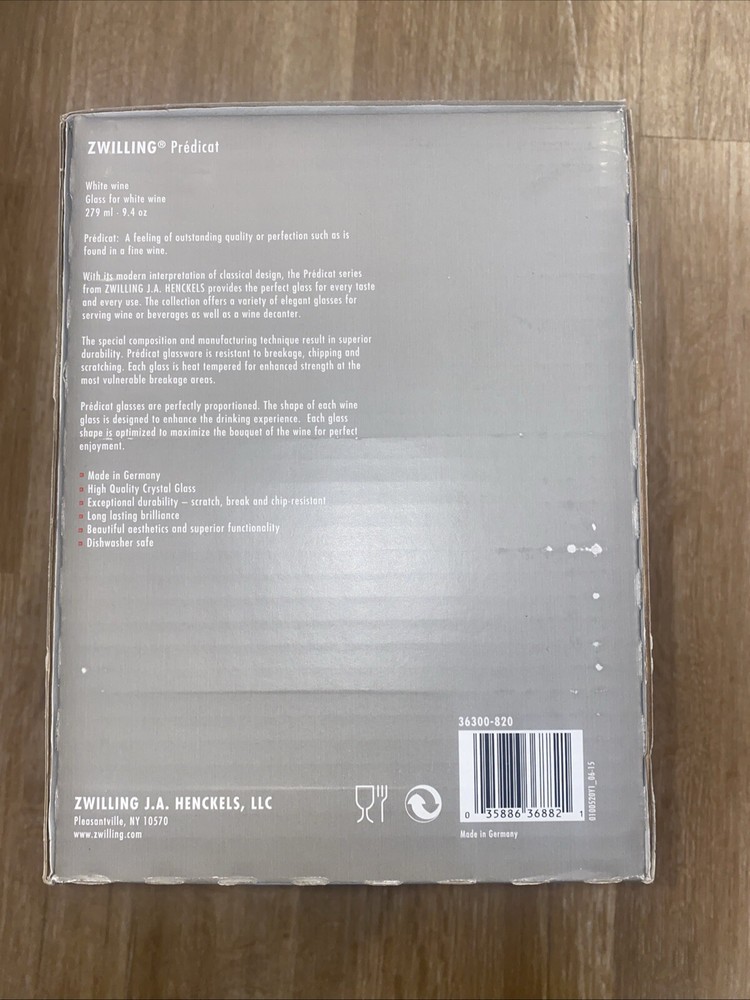 Item Height:2.75Country/Region of Manufacture:GermanyType:White Wine GlassNumber of Items in Set:6Size:9.4-ozMPN:36300-820Glassware Type:Wine GlassColor:ClearItem Width:2.75gtin13:035886368821Material:Crystal, GlassSet Includes:White Wine GlassUPC:035886368821Brand:ZWILLING J.A. HENCKELSModel:Predicat