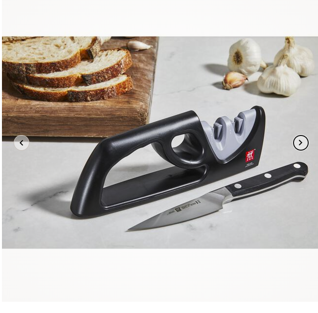 ZWILLING TWO-STAGE PULL-THROUGH SHARPENER-GRAY Safely and easily keep your knives razor sharp with the 2-Stage Pull Through Knife Sharpener. Ceramic rods in both coarse and fine grits will put an edge on even the dullest knife with only a few strokes. The protected safety grip keeps your fingers out of harms way while allowing the sharpener to stay firmly on a surface. Suitable for all western-style blades. Quickly and safely sharpens your blades Non-slip bottom Comfortable handle also protects fingers Two stages, coarse and fine Easy to use, just pull through. Made in China TWO-STAGE PULL-THROUGH SHARPENER-GRAY