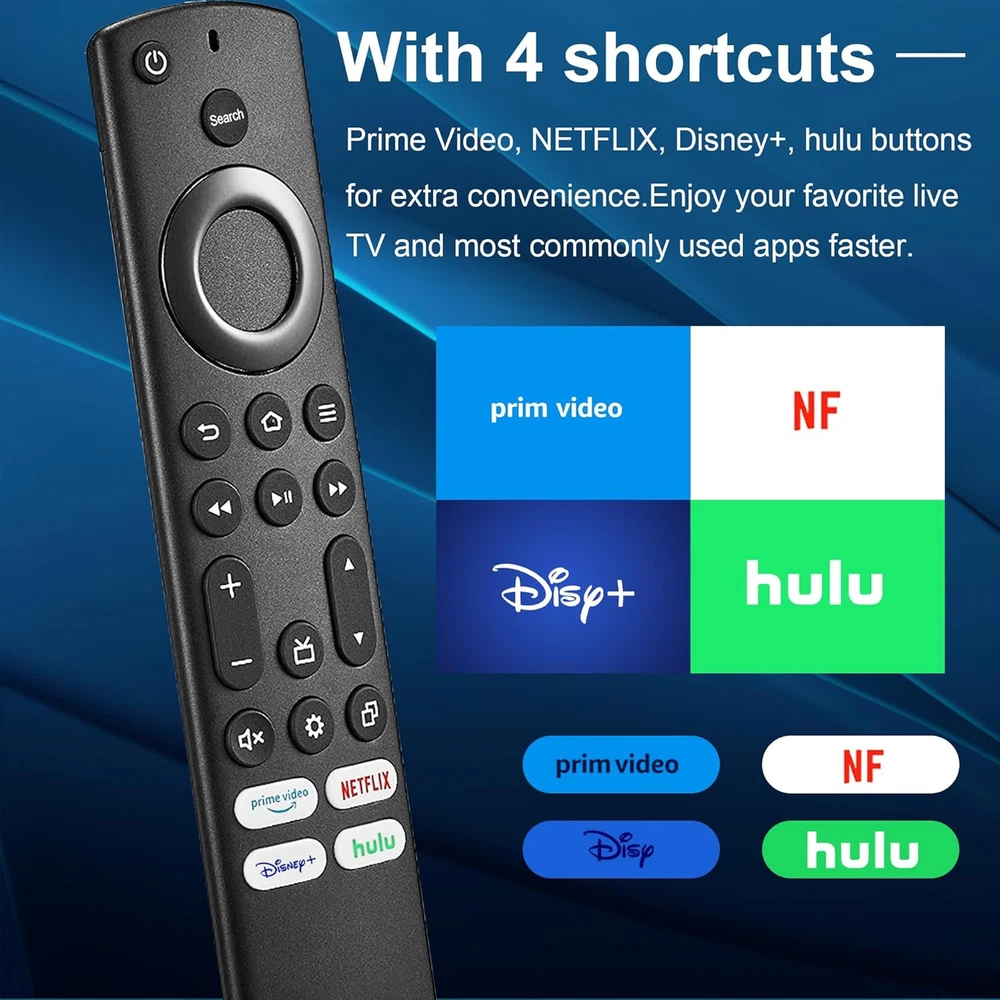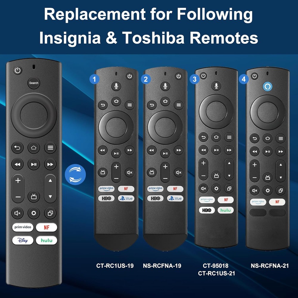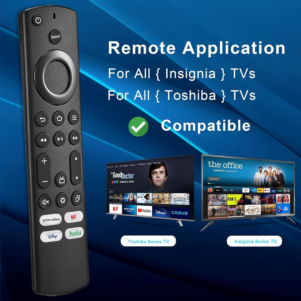 ZYK 2 Pack Replacement Universal Remote for All Insignia TV and Toshiba Black Product Details Product Dimensions: 5.9 x 1.5 x 0.38 inches Item Weight: 4.6 ounces Manufacturer: ZYK Brand: ZYK Special Feature: Ergonomic Color: Black Max Number of Supported Devices: 1 Compatible Devices: Television 【Applicable TV Series】Pack of 2 universal tv remote control fits for all Insignia smart TVs and Toshiba smart TVs, including Insignia TVs F30 / F20 / F50 / DF710 / DF711 / DF310 / DF510 / DF311 / DF620 series. Replacement smart tv remote for Toshiba TVs LF711 / LF621U / LF421U / LF221U / C350 / A810U / A710U / DF510 / DF711 series.Remote for Amz TV 4-Series / Omni Series / Omni QLED Series, and more.Also can compatible with Hisense Smart TV remote control. 【Remote Compatibility】This new upgraded universal remote for insignia-tv-remote can be compatible with many remote control models, including insignia, Toshiba and Hisense series remote, NS-RCFNA-21, CT-95018, CT-RC1US-21, NS-RCFNA-19,CT-RC1US-19, CP-RC1NA-22 etc. 【Accurate Control & Fast Response】New upgraded smart chip, feature with over 12 meters (40 feet) farther transmitting distance, stable performance, An outstanding response between TV and remotes, it will respond quickly in 0.5 seconds, easily replace missing or damaged remote,keep the same full control functionality of your original insignia and toshiba tv remote control.This for Insignia-smart-tv-remote control had also been successfully tested to click the buttons highly over 120,000 clicks. 【Key Features】 It's important to note that this is an infrared remote control, NO voice function, NOT support bluetooth pairing., NOT for tv stick. There is a text search function instead of voice function, you can input the keywords to search the needed content. It is designed with 4 shortcut buttons,including Prime Video, NF, Disny and hulu, one key access to your favorite applications, it could make your life easier! 【Package lncluded】 Packed with 2 remote. Two-pack remote control can solve your home backup remote control needs, Don't worry about losing the remote control or biten by your pets.Infrared remote no pairing or programming needed. Use it just right out of the box, just Insert 2 Pcs*AAA batteries to get it work(Note: Batteries are not included).