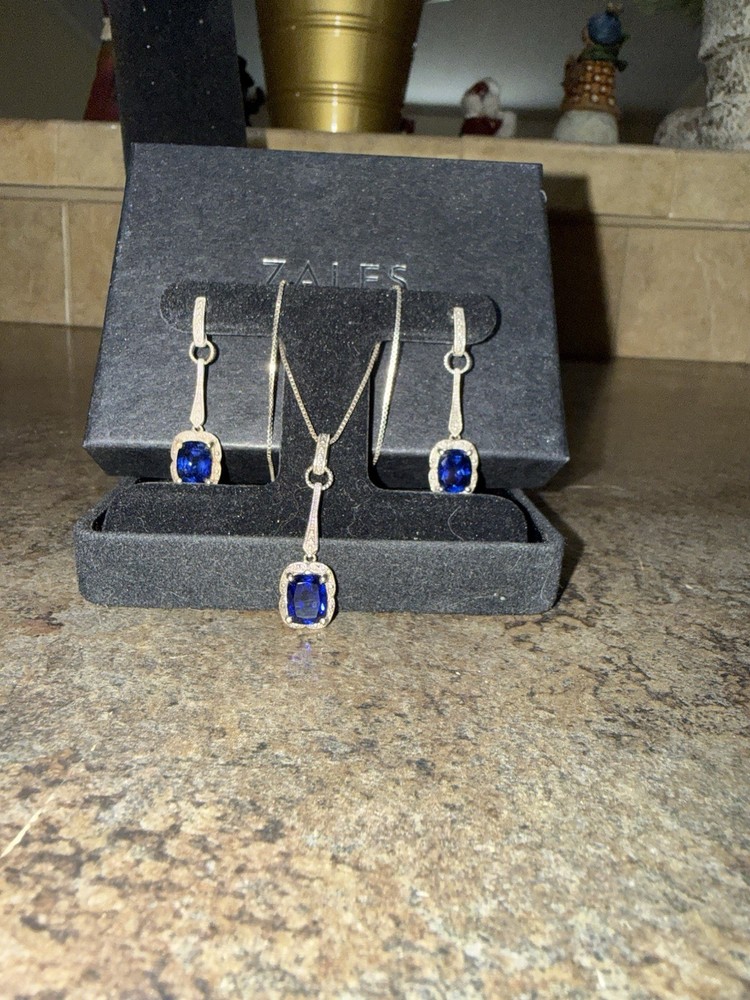 The Zales Sterling Silver Sapphire Necklace and Earrings Set is a stunning piece of fine jewelry featuring radiant cut blue sapphire stones. The set includes a necklace and earrings, all crafted with 925 sterling silver. The intricate design and high-quality materials make it a beautiful and luxurious addition to any jewelry collection. With a brand like Zales, you can trust in the quality and craftsmanship of this jewelry set. Perfect for a special occasion or as a gift for a loved one who appreciates elegant and timeless pieces.