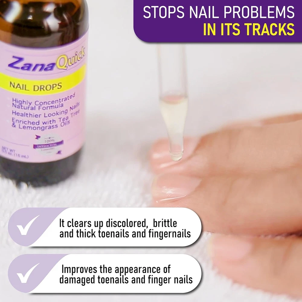 ZanaQuick Extra Strength Toenail & Fingernail Repair Drops - Nail Care Renewal for Thick, Damaged & Discolored Nails - 2 Pack Product Details Is Discontinued By Manufacturer : No Package Dimensions : 4.53 x 2.52 x 1.42 inches; 0.48 ounces Item model number : Nail Fungus Treatments Department : Nail Fungus Treatments Manufacturer : Prosolutions Center Brand: Zanaquick Item Form: Drop Item Weight: 13.61 g Liquid Volume: 1 Fluid Ounces Specialty: Growth, Healthier, Repair, Solution, Clear STOPS NAIL PROBLEMS IN ITS TRACKS: It clears up discolored, brittle and thick toenails and fingernails. Improves the appearance of damaged toenails and finger nails, as soon as possible, even when everything else has not worked. Plus it supports and protects the toenail and fingernail as it grows out looking normal and clear until the damaged part is totally gone. EXTRA-STRENGTH BIO-FORMULA: New and improved solution for optimum damaged toenail and fingernail recovery. Formulated with plant-based ingredients, selected with the highest purity, right potency, effective blend and the correct approach for maximum results. It helps the nail regain its natural color and prevents future recurrence. EXPECT RESULTS: It’s true, how fast the damaged toenail and fingernail will look completely normal and clear again, will depend on how damaged the nail is. For most people, the natural growth of a toenail takes more than 4 months. For a fingernail it's much less. For better results, ZanaQuick Nail Recovery Drops comes with an easy-to-follow steps Digital guide “How to Have Clear Healthier Nails Again Without Going to the Doctor.” with the exact process plus pro-tips. TRUSTED AND LOVED: ZanaQuick has been helping thousands of people with nail issues since 2010. It's made here in the USA under the highest quality standards. It's seen as the go-to solution and first option for many people wanting to have clear, normal and healthy looking nails. START YOUR NAIL RECOVERY: It's crucial to act quickly before the nail gets worse. And like with any treatment, patience and consistency with application is key. And do not stop applying the nail drops until the whole nail is fully recovered with its natural color. This is why ZanaQuick was made to easily fit into your daily routine.