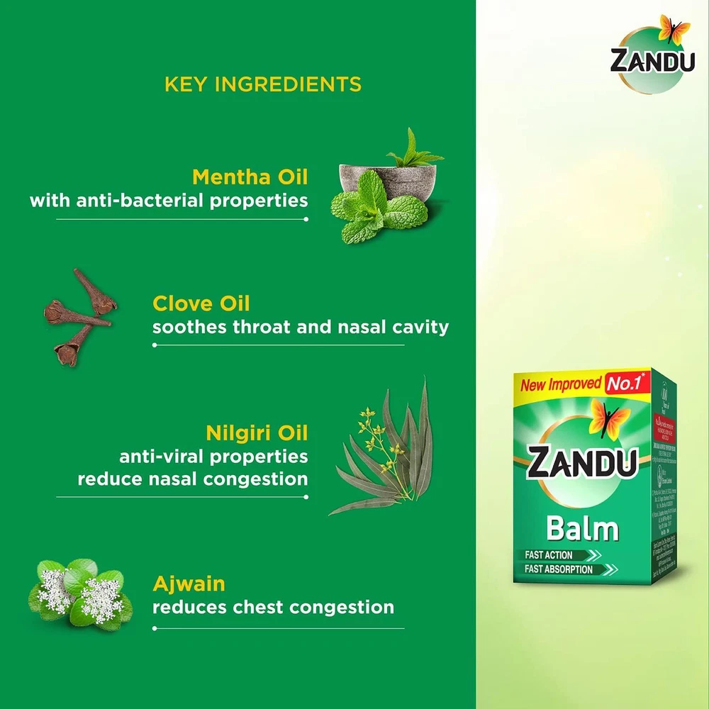 c l Zandu Balm is India's Largest Selling Multipurpose Pain Relief Solution that has effectively won the trust of generations. It is extracted from responsibly sourced pure Ayurvedic ingredients. The balm is non- greasy and penetrates swiftly into the affected areas to help deliver quick and long-lasting relief from pain. It’s analgesic properties help relieve the pain effectively. A pain can completely put you off focus for the entire day. Which is why you need a reliable solution that will relieve a pain in the most convenient manner. Powered by ayurvedic ingredients like menthasatva & eucalyptus helps treat different kinds of topical pains. Gaultheria oil acts as a counter-irritant to relieve muscle pain. Mentha present in the balm enhances the cooling effect and helps to soothe the affected area. So bank on the 100 years of trust of the new and improved Zandu Balm ,which spreads easily and absorbs faster on the skin. It gives instant & long-lasting relief from different kinds of pain. Ek Balm Teen Kaam Headache: Helps relieve headaches effectively. Cold: Effective relief from cold. Backache: Helps relieve lower backache easily. Ayurvedic Balm Zandu Balm An ayurvedic formulation of powerful essential oils and methol, aajwain & eucalyptus for quick relief from headache, backache and cold. Direction for use: For external use only. Apply on pain points and do not rub on the skin. Caution: For adults & children above 5 years. Keep out of reach of children below 5 years. Replace cap tightly. Avoid contact with eyes, nostrils, mucous membranes and broken or irritated skin. Consult a doctor if condition worsen. Do not apply on open wounds. Do not use if allergic to any ingredient. l Headache: Helps relieve headaches effectively. Cold: Effective relief from cold. Backache: Helps relieve lower backache easily. Ayurvedic Balm Zandu Balm An ayurvedic formulation of powerful essential oils and methol, aajwain & eucalyptus for quick relief from headache, backache and cold. Direction for use: For external use only. Apply on pain points and do not rub on the skin. Caution: For adults & children above 5 years. Keep out of reach of children below 5 years. Replace cap tightly. Avoid contact with eyes, nostrils, mucous membranes and broken or irritated skin. Consult a doctor if condition worsen. Do not apply on open wounds. Do not use if allergic to any ingredient.