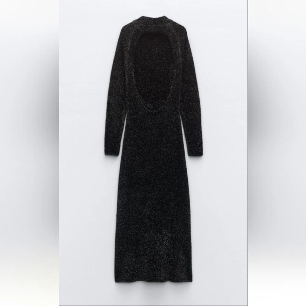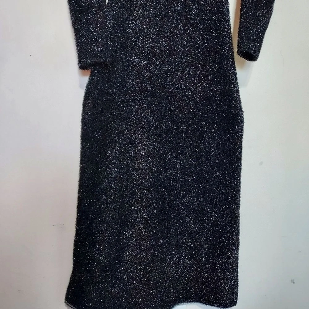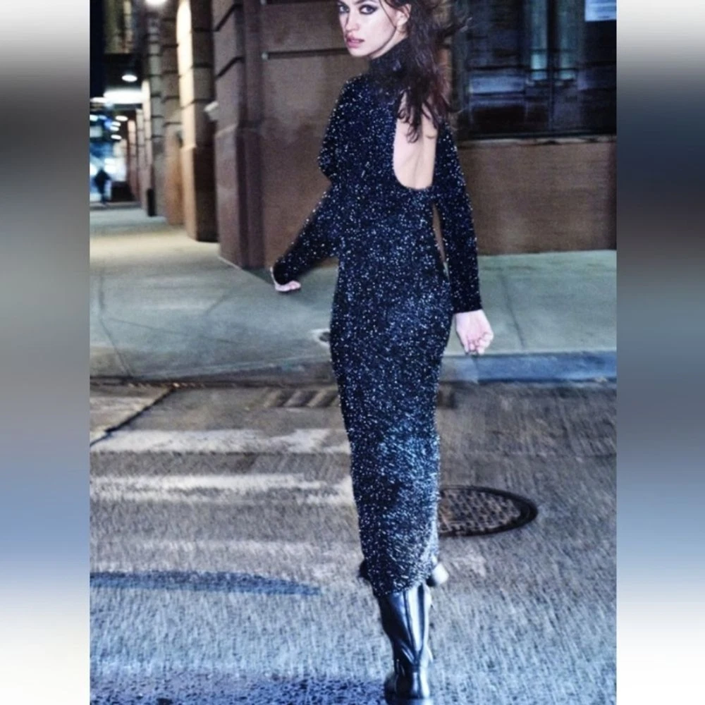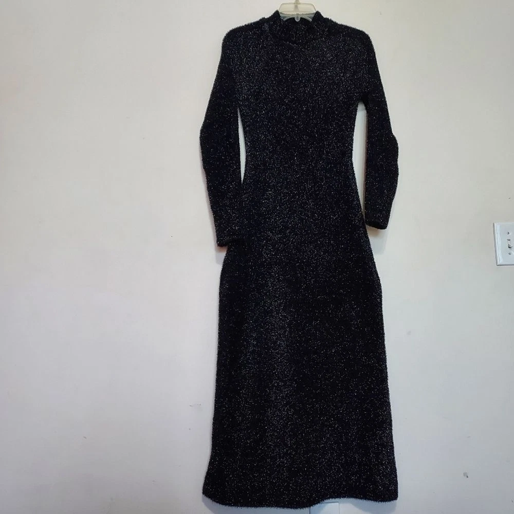 long dress with high collar and long sleeves, open back detail stretchy true to size with stretch M-pit to pit 18" length 54" L- pit to pit 19" length 54 shimery, metallic, classy, minimalist, contemporary, cruise vacation dress, or any special occasion events