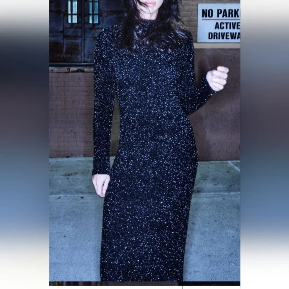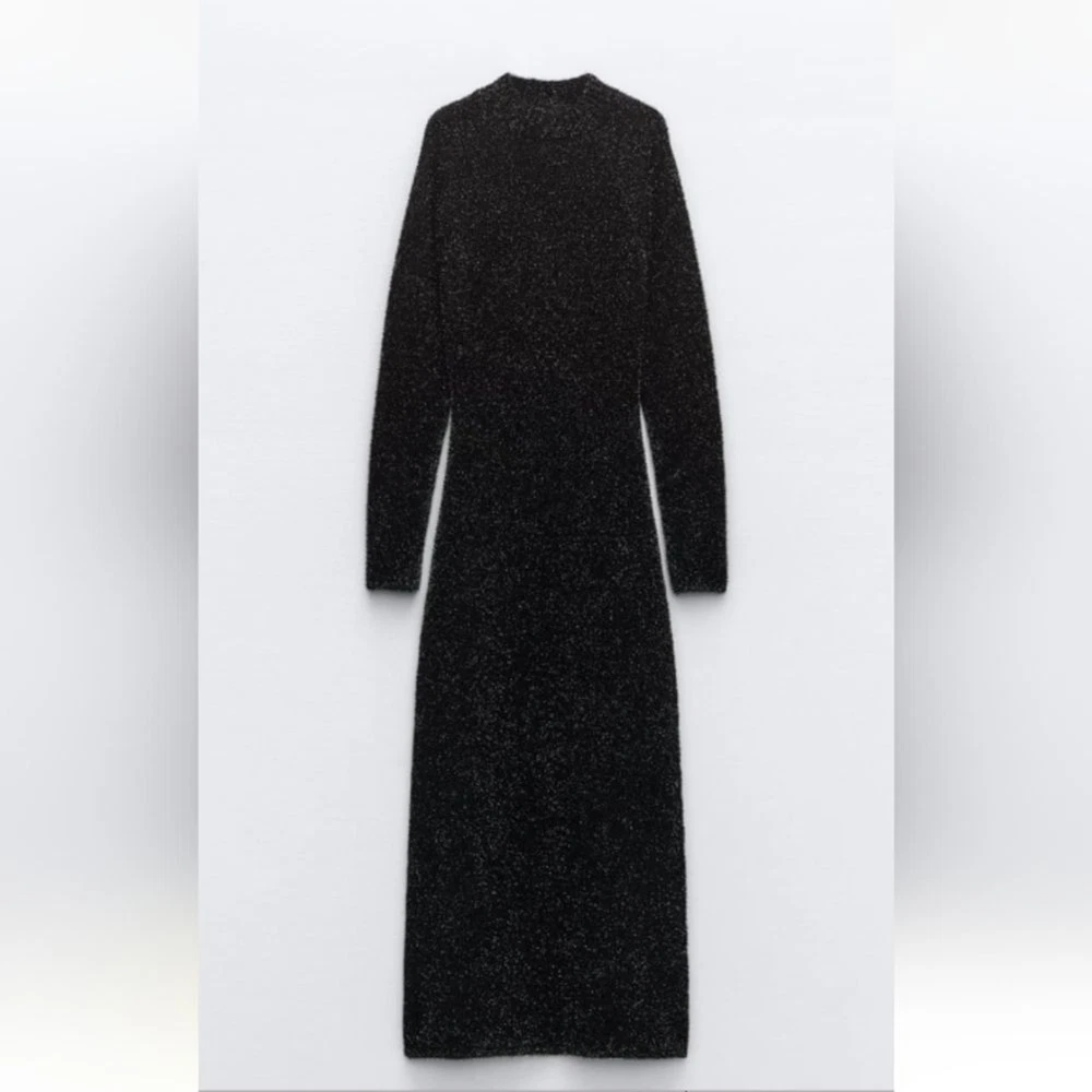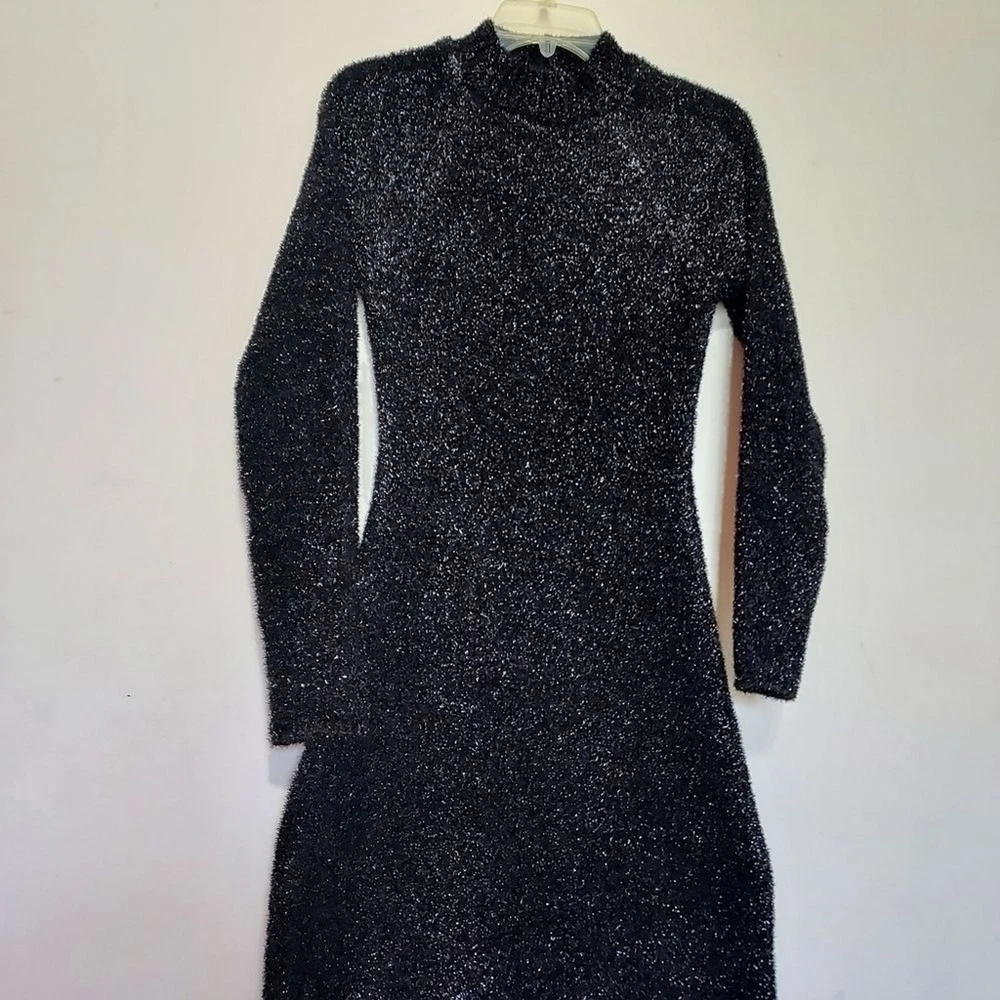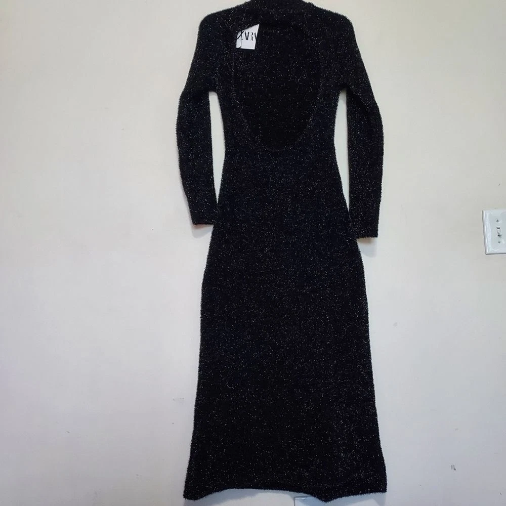 long dress with high collar and long sleeves, open back detail stretchy true to size with stretch M-pit to pit 18" length 54" L- pit to pit 19" length 54 shimery, metallic, classy, minimalist, contemporary, cruise vacation dress, or any special occasion events