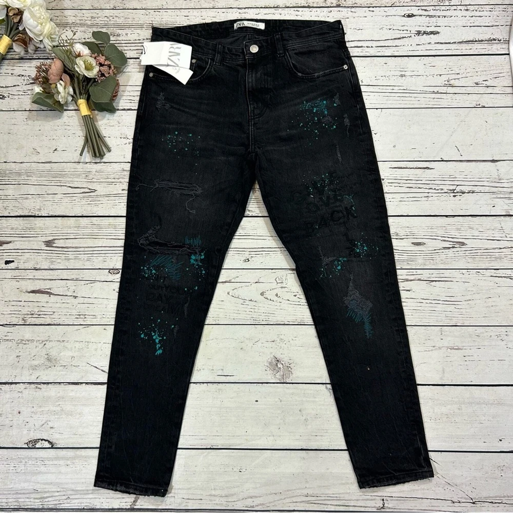 Zara paint splatter ripped distressed black denim skate slim jeans NWT . Super nice . Size 32 . Flat lay measurement waist 17 inch . Rise 10 inch . Inseam 29 inch . Shipped with USPS Priority Package, No returns but backed by ebay money back guarantee. If you have any other questions please contact seller . Please leave a wonderful feedback once you are satisfied with the purchase , Thank you . Custom charges may apply for international purchases .