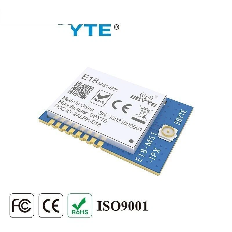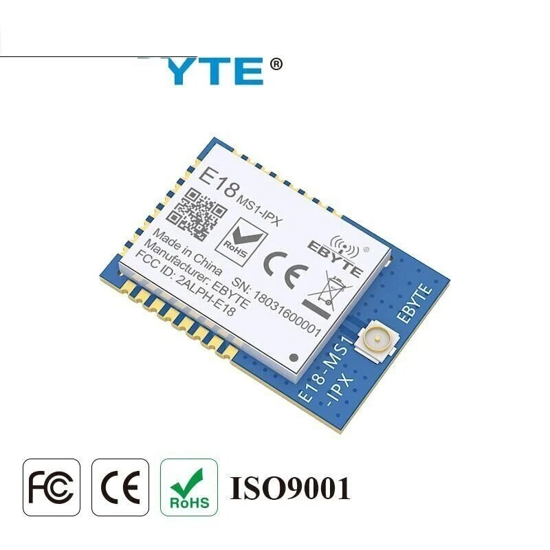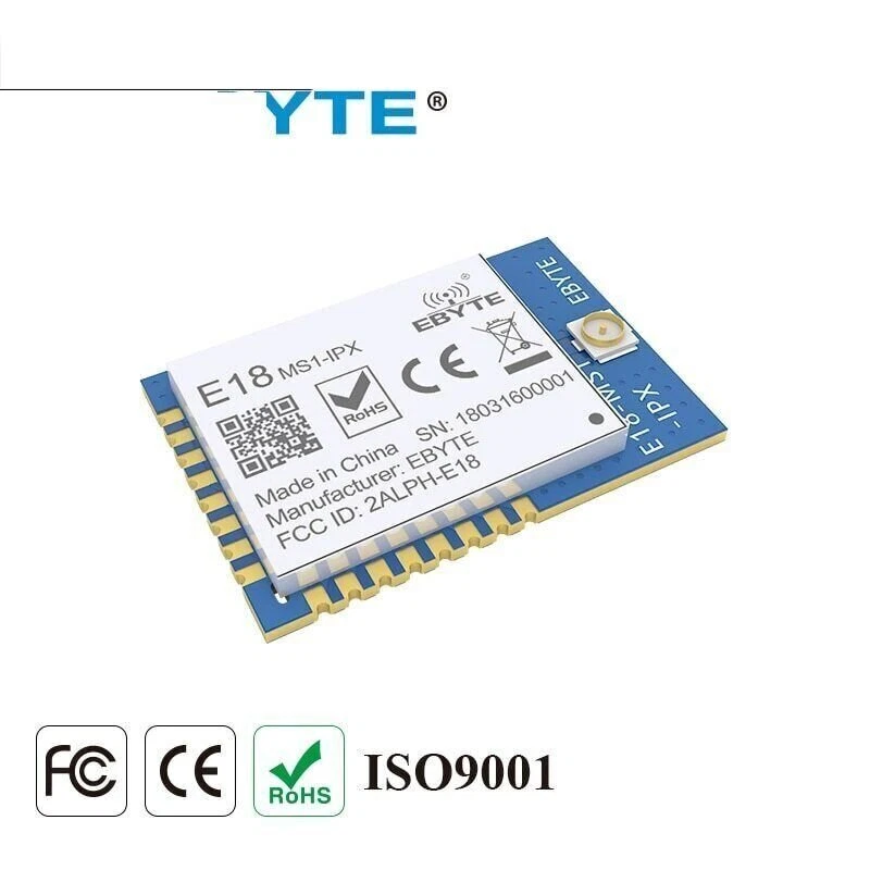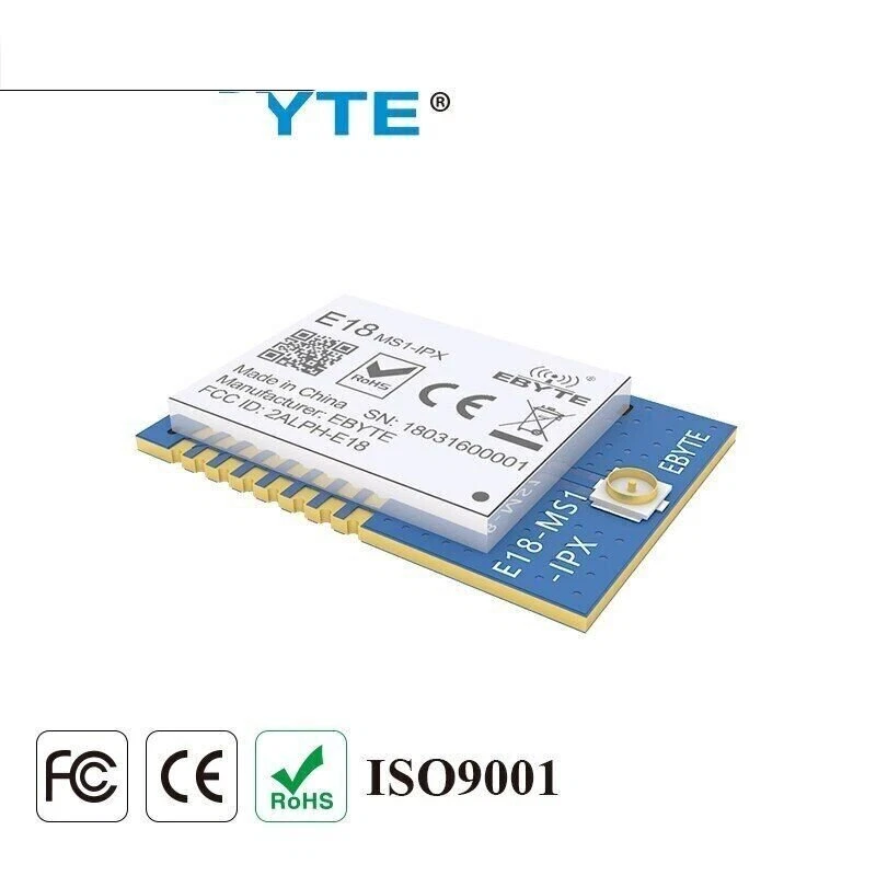 E18-MS1-IPX Zigbee IO CC2530 2.4Ghz 2.5mW IPX Antenna IoT uhf Mesh Network Wireless Transceiver Transmitter Receiver RF Module RF Parameter Value Remark Working frequency 2400~2480 MHz Default: 2.4GHz (32MHz oscillator) Transmitting power 4 dBm About 2.5mW Receiving sensitivity -96.4 dBm Air data rate: 250kbps Communication protocal ZigBee - Test distance 240m In open and clear air, with maximum power, 5dBi antenna gain, height of 2m, air data rate: 250kbps Hardware Parameter Value Remark IC CC2530F256RHAT/QFN40 - FLASH 256 KB - RAM 8 KB - Core Industry-standard enhanced 8051 MCU - Size 14.1 * 20.8 mm - Antenna type IPEX - Communication interface SoC - Package SMD - Electronic parameter Min. Typ. Max. Unit Condition Power supply 2.0 3.3 3.6 V Communication level 2.0 3.3 3.6 V Transmitting current 26 28 31 mA 4dBm(2.5mW) Receiving current 25 27 30 mA Sleep current 0.6 1.2 1.8 μA Operating temperature -40 20 +85 ℃ Operating humidity 10 60 90 % Storage temperature -40 20 +125 ℃