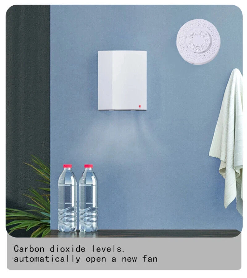 Zigbee Tuya 3.0 Air Quality Monitor Air Housekeeper 5 In 1 Formaldehyde VOC Co2 Temperature Humidity Detector Sensor Smart Home Description: 100% Brand New and High Quality! This product needs to be used with ZigBee 3.0 gateway! Smart air box is the home of intelligent device for remote monitoring of air environment,It can also detect formaldehyde, VOC of poisonous gas, CO2, temperature, humidity and so on 5 kinds of environmental parameters,In environmental parameters exceed bid automatically when the graffiti smart home air conditioning, new fan, humidifier, air purifier on household environment optimization. The detection range of the smart air box: formaldehyde, VOC gas, CO2, temperature, humidity Examination range: Formaldehyde: 0-10.0 (mg/m3) VOC: 0-99.9 (ppm) Carbon dioxide: 0-1000 (ppm) Temperature: 0-60 (℃) Humidity: 0-95 (%) After being paired to the APP, it can be linked with various smart home products. For example, when detecting excessive formaldehyde/VOC, the smart air purifier is automatically turned on; when the carbon dioxide is exceeded, the smart fresh air fan is automatically turned on; when the temperature is abnormal, the air conditioner temperature is automatically adjusted ; When the humidity is too low or too high, the smart humidifier will be turned on/off automatically; when a certain parameter is detected to exceed the standard, a message will be sent to the alarm (the above smart linkage function needs to be matched with the smart home product) Specifications: Working temperature: -20--85℃ Working voltage (rated): 4.8-12V Working current: 10-496ma Size: 90*90*35mm Power supply mode: USB 5V/1A Communication protocol: ZigBee3.0 color: White Shell material: PVC Package Included: smart air box X1 Instruction for use X1 Card pin X1 USB power supply cord X1 Notes: please do not put air box at lampblack is too big, strong convection air or in high concentration organic gas for a long time, otherwise it will damage the sensor. This product needs to be used with ZigBee 3.0 gateway!