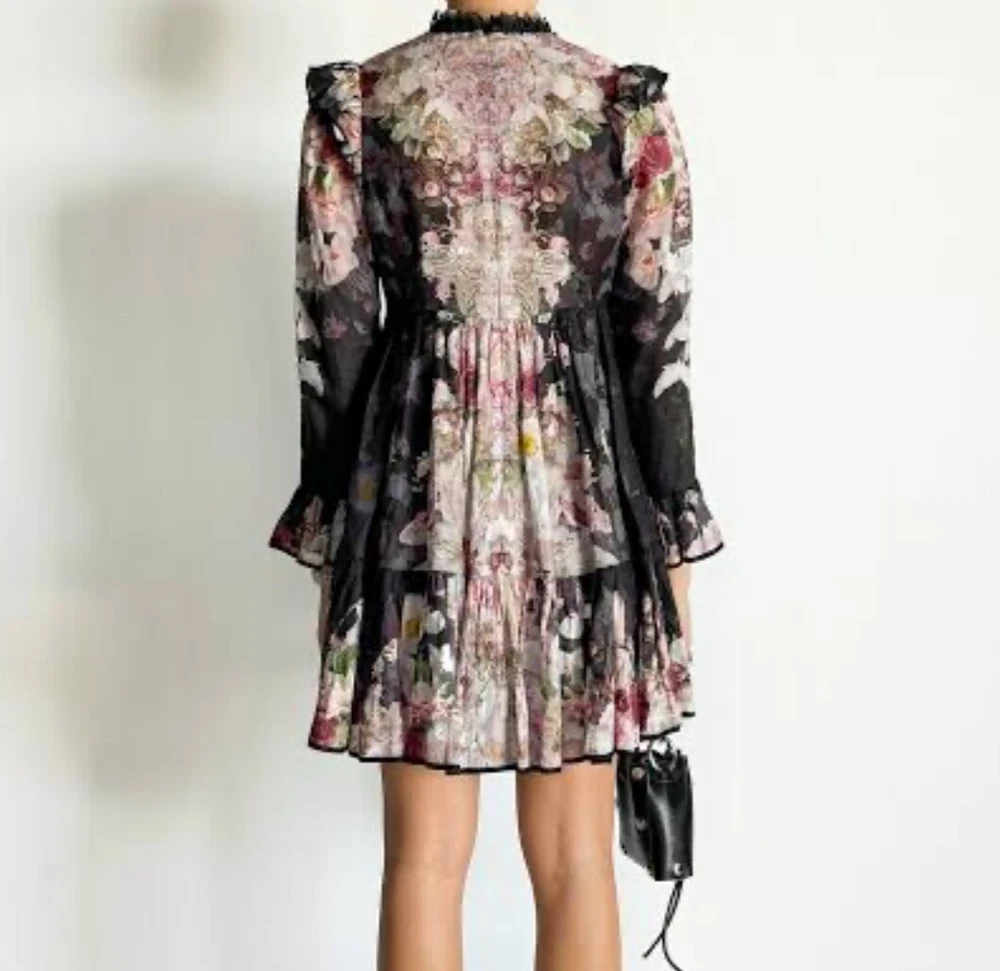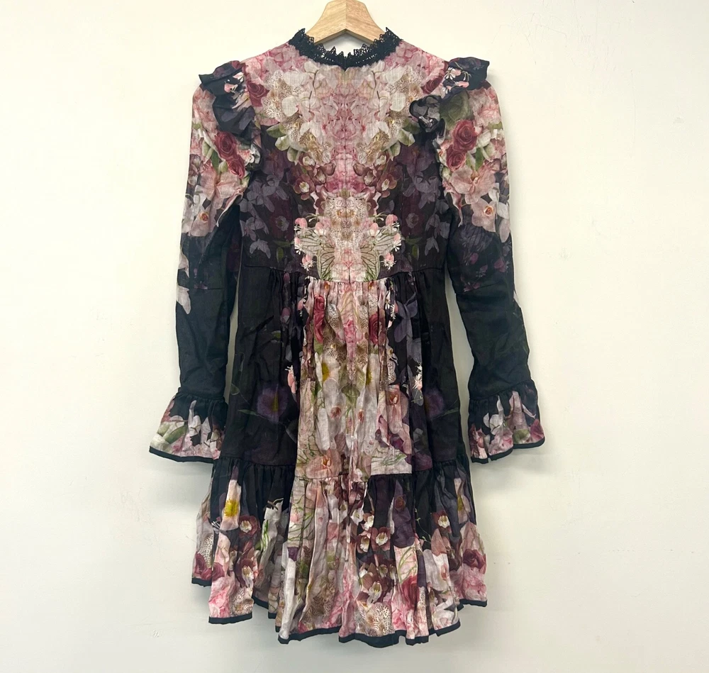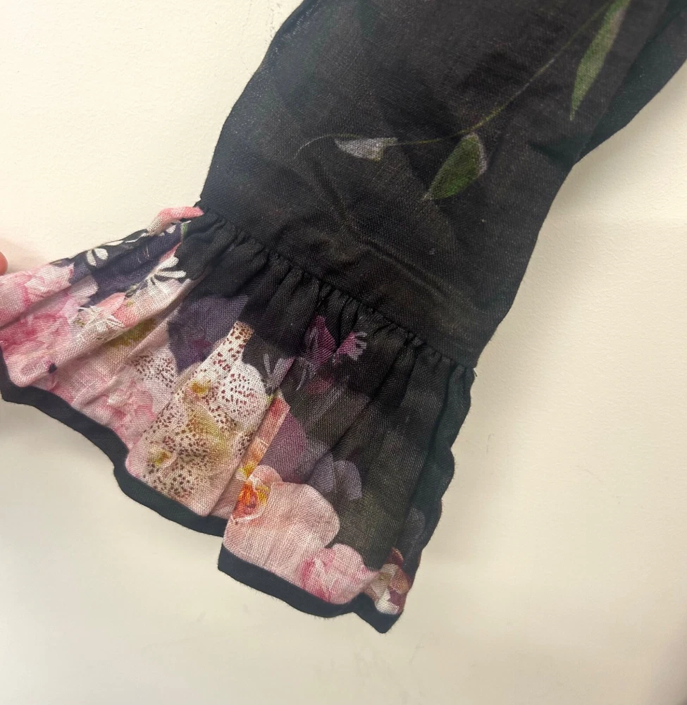 Zimmermann Black & Pink Floral Tie Neck Dancer Mini Linen Dress Size OP The Dancer Tie Neck Mini in Black Garden Floral A linen mini dress in a black with pink and cream garden motif, featuring an empire waist, straight sleeves with fluted cuffs, frills at collar shoulders and hem. Also features an adjustable velvet lace neck tie and a dropped hem 100% Linen Size OP Pls refer to brands offical website for more details on their sizing Fitted bodice Relaxed skirt with frill hem Frills throughout Flower studded button and loop closure down centre front Fabric covered buttons Black lace semi high neckline Velvet adjustable neck tie (can be tied in pussy bow) Contrast stitching throughout Pockets either side Fully lined Excellent condition If you have any questions or require more details, photos ect pls don’t hesitate to msg me Pls check out my other listings - am open to reasonable offers (no low balls pls) and happy to combine postage #designer #australian #alemais shona joy alice mccall acler aje spell