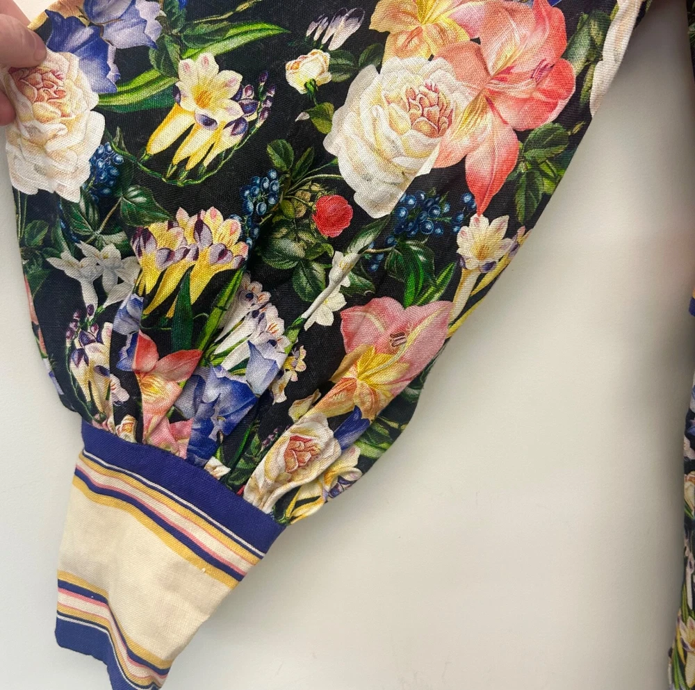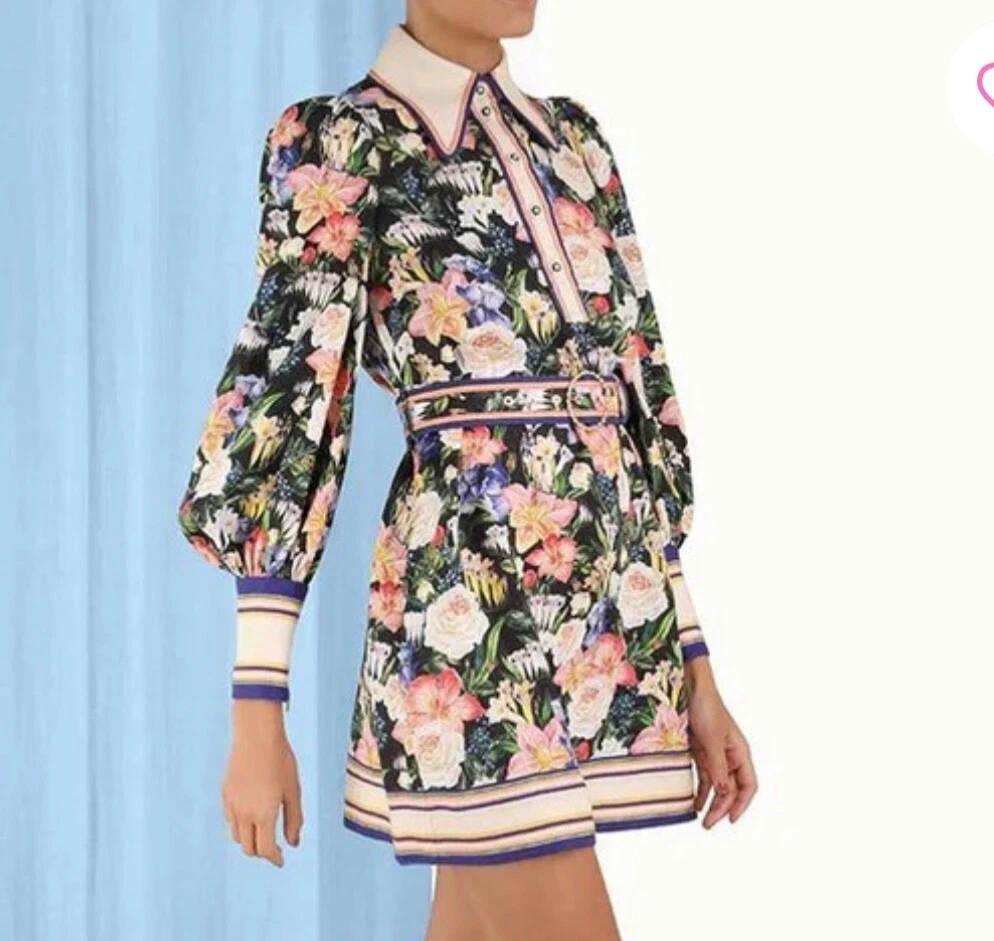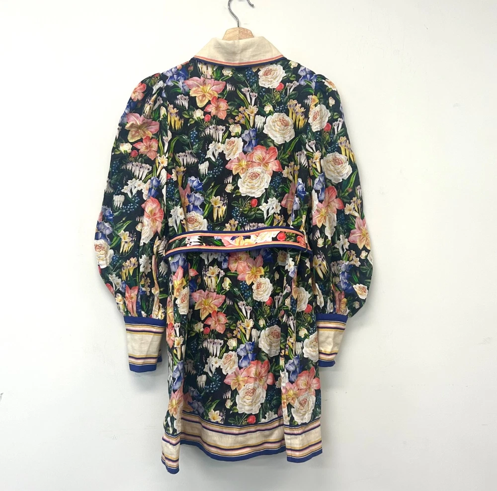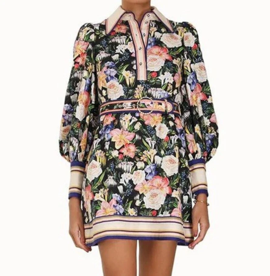 Zimmermann Coaster Long Sleeve Tunic Dress The Coaster Long Sleeve Tunic in Mayflower Black Print from the Spring 2023 Collection, Wonderland. A mini dress featuring a classic collar, blouson sleeves and a placement print throughout Size 2 (Aus/UK 12, US 8) Linen mini dress Floral tropical style print Contrast collar, hem and cuffs Elongated zip cuffs Removable self covered belt with gold circle buckle Excellent condition If you have any questions or require more details, photos ect pls don’t hesitate to msg me Having a MASSIVE clear out ATM so take a sec to check out my other listings - am open to reasonable offers (no low balls pls) and happy to combine postage #designer #australian #alemais shona joy alice mccall acler aje spell