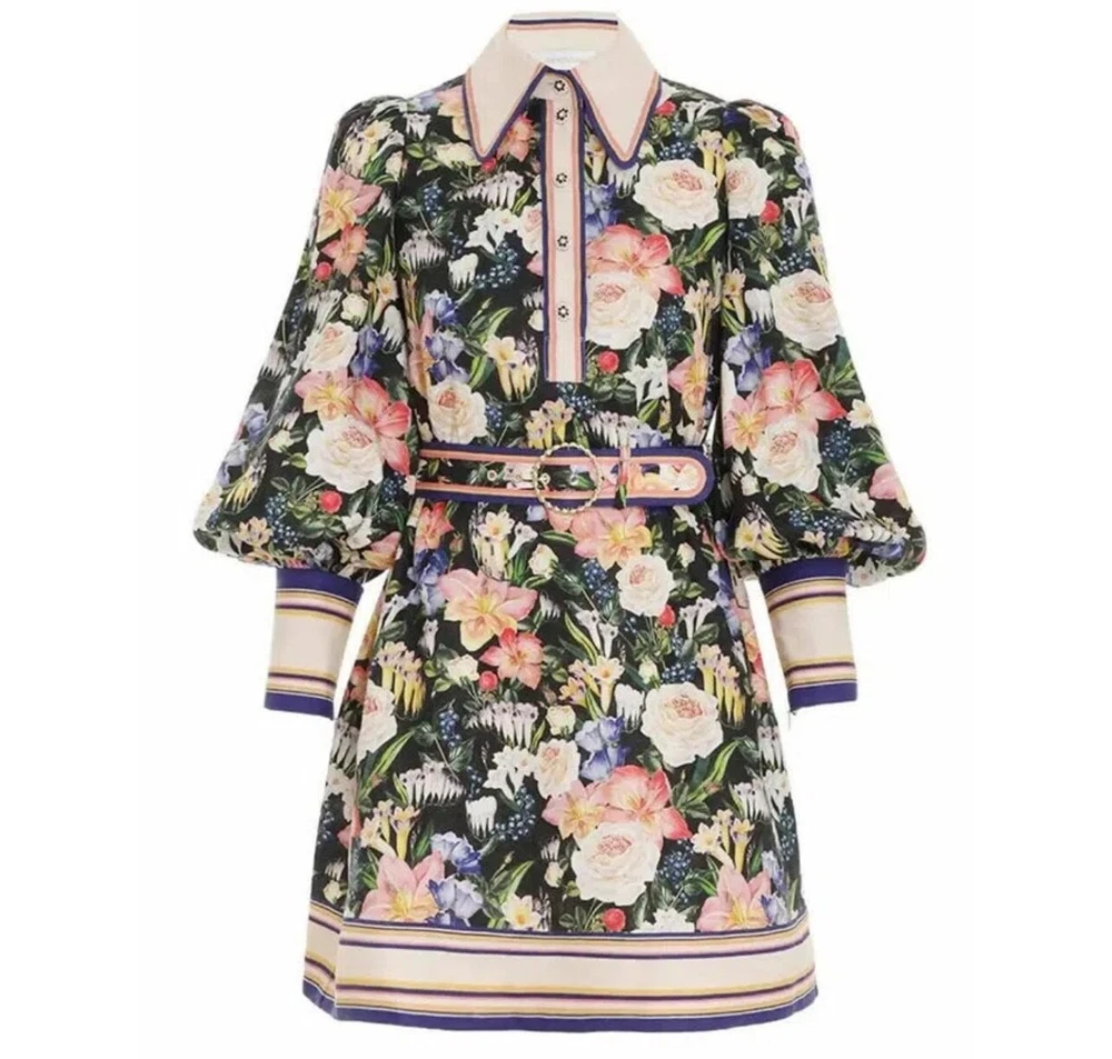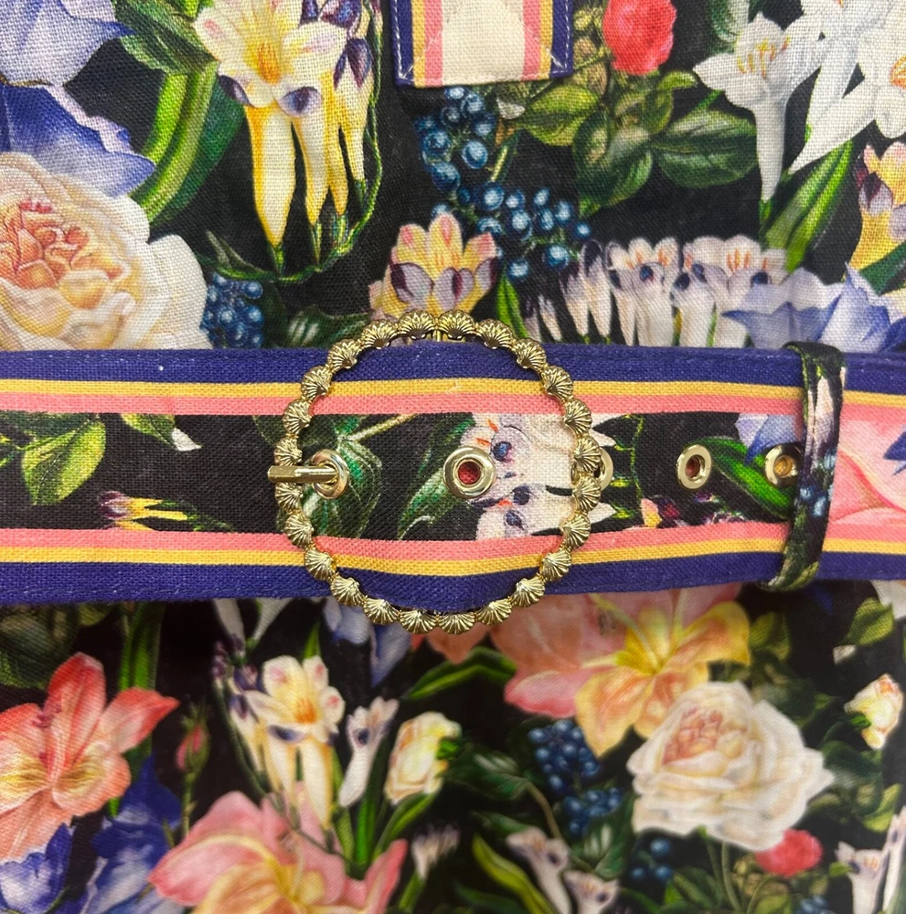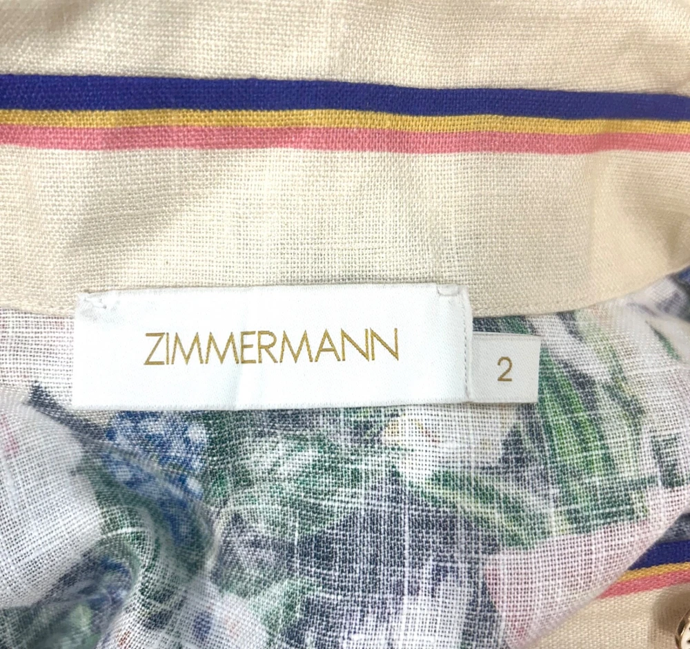 Zimmermann Coaster Long Sleeve Tunic Dress The Coaster Long Sleeve Tunic in Mayflower Black Print from the Spring 2023 Collection, Wonderland. A mini dress featuring a classic collar, blouson sleeves and a placement print throughout Size 2 (Aus/UK 12, US 8) Linen mini dress Floral tropical style print Contrast collar, hem and cuffs Elongated zip cuffs Removable self covered belt with gold circle buckle Excellent condition If you have any questions or require more details, photos ect pls don’t hesitate to msg me Having a MASSIVE clear out ATM so take a sec to check out my other listings - am open to reasonable offers (no low balls pls) and happy to combine postage #designer #australian #alemais shona joy alice mccall acler aje spell