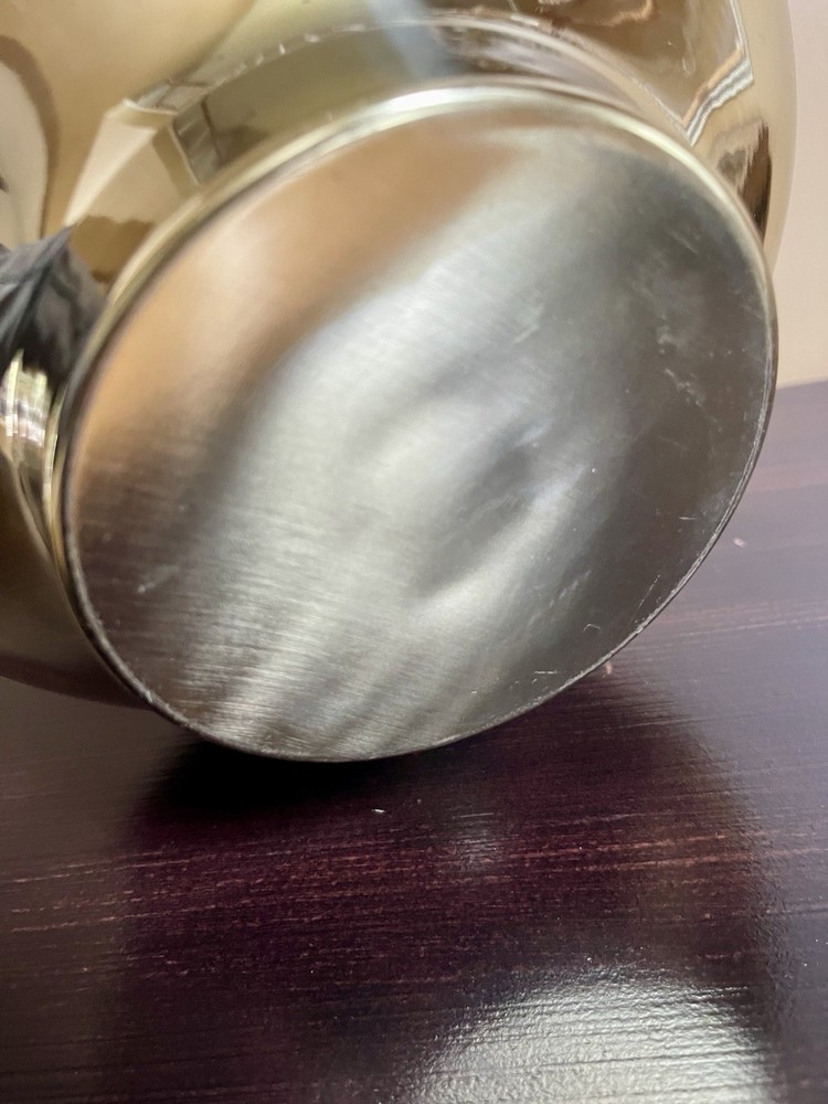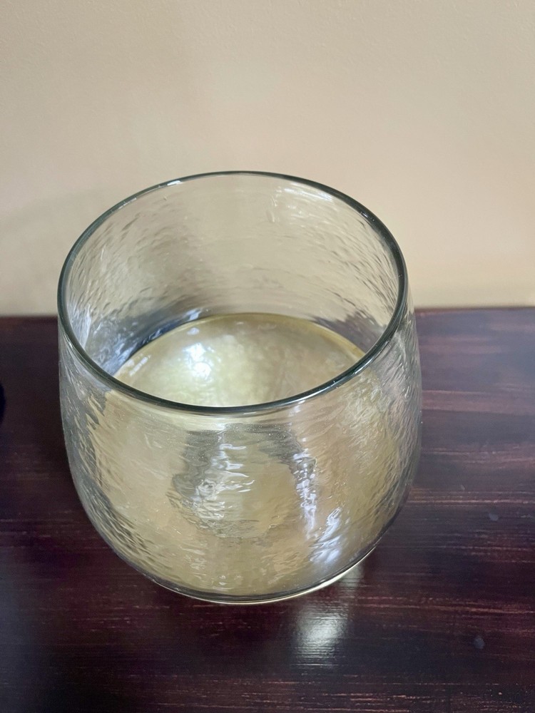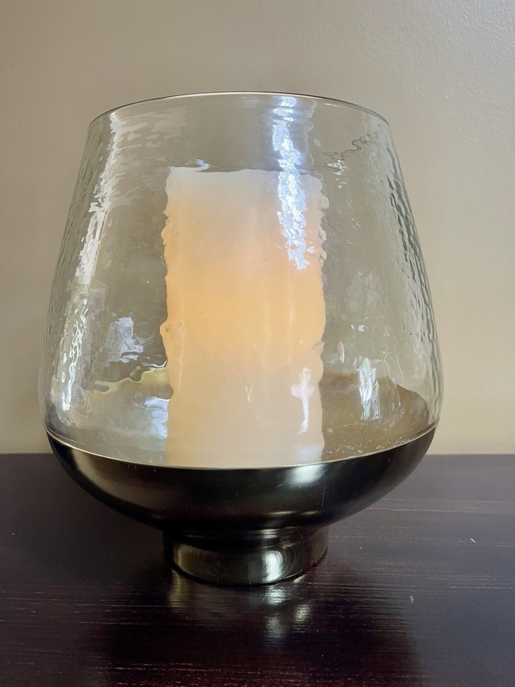 Clear glass with hammered texture Shiny gold color aluminum base 10” x 9” This piece can be used as both a vase and a candle holder