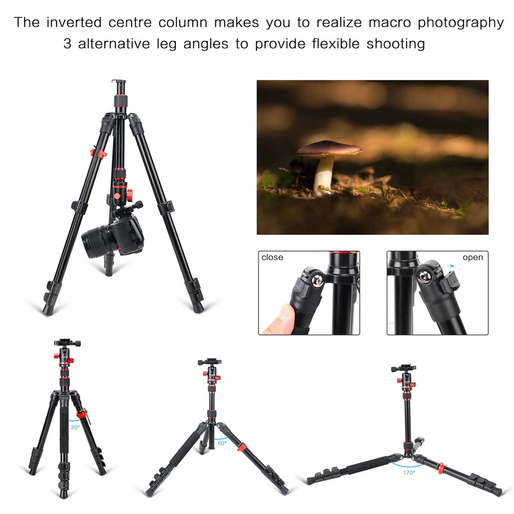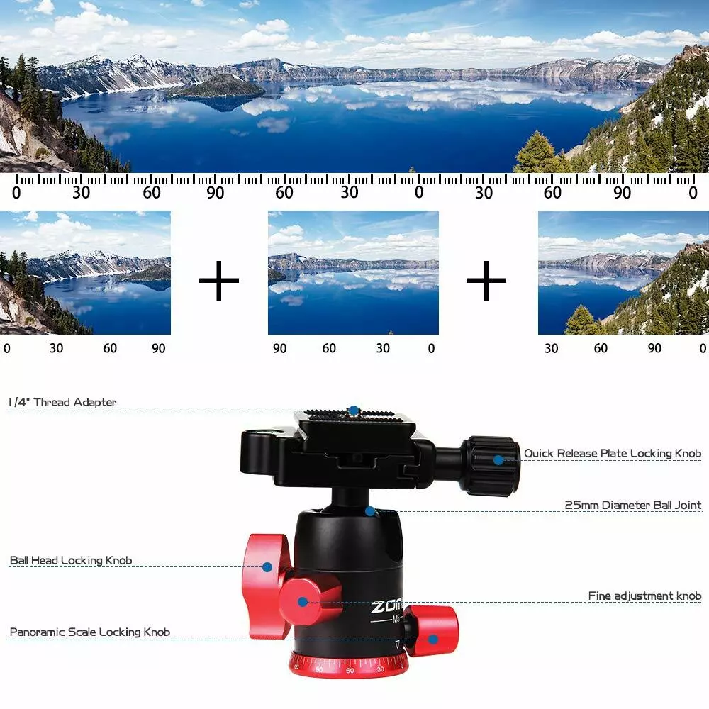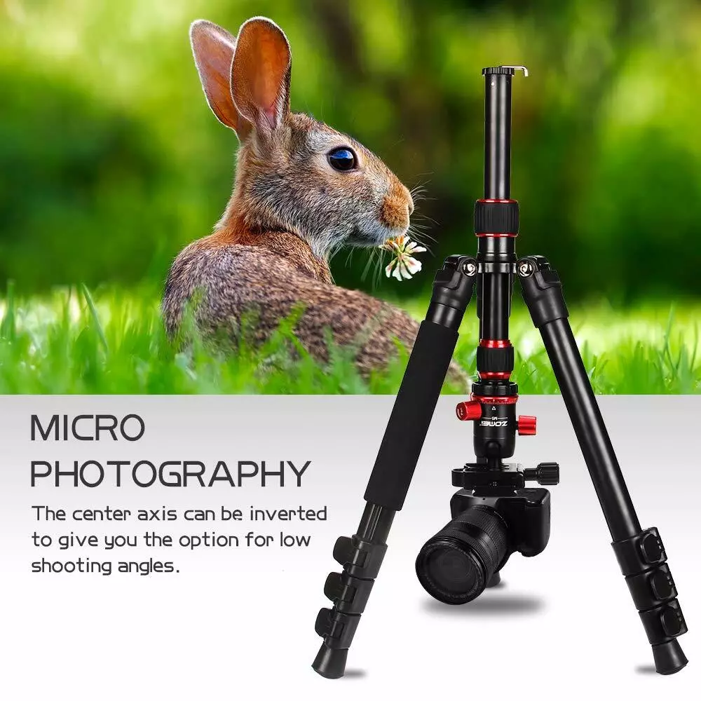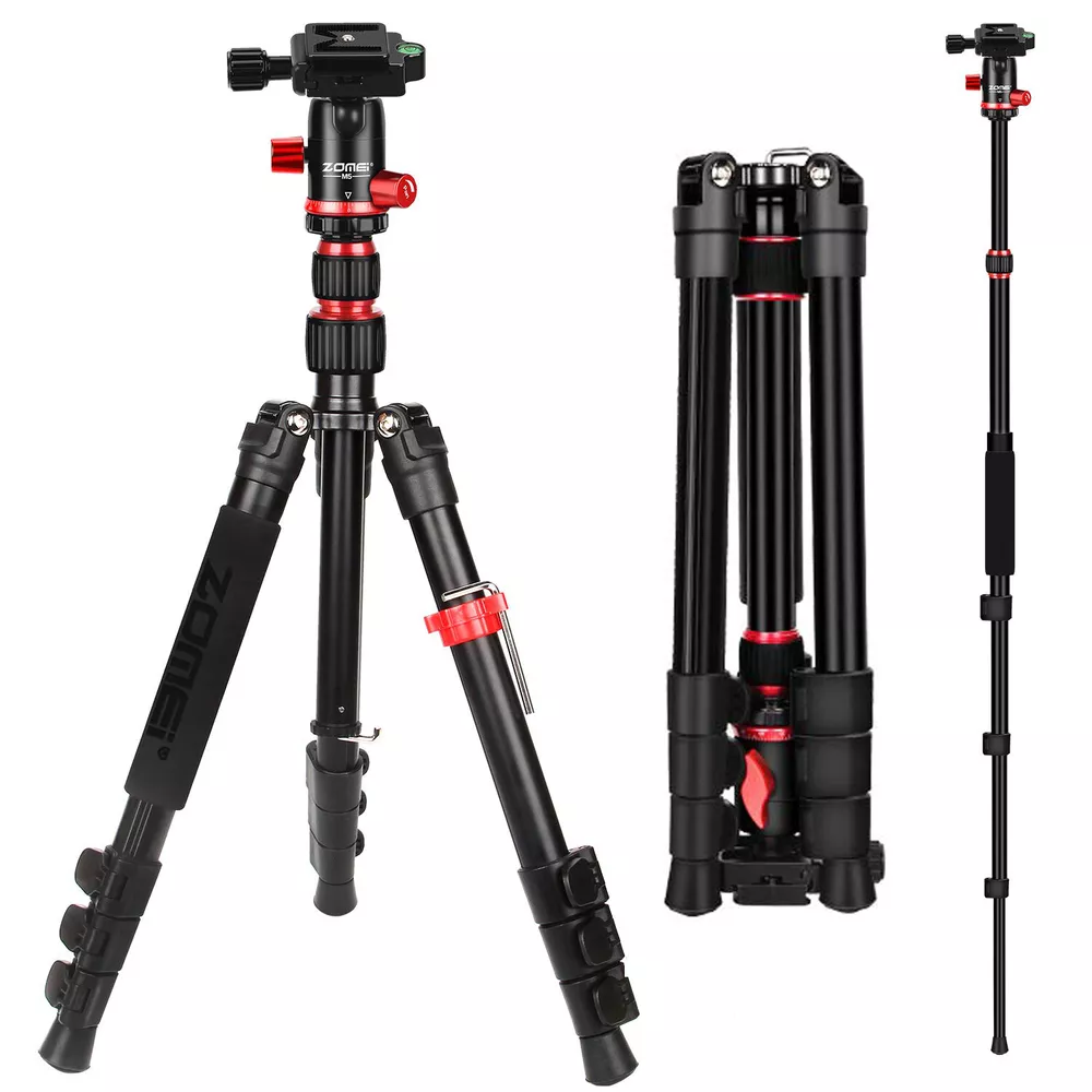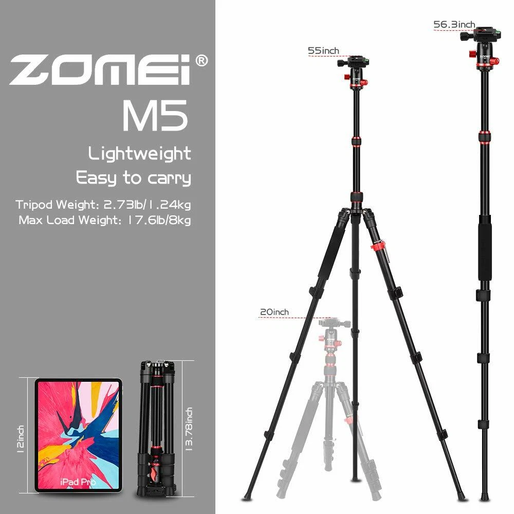 Package Includes 1 * M5 Tripod 1 * Carry Bag 1 * User Manual All necessary accessories ZOMEi Camera Tripod Lightweight Travel Tripod Monopod 2 in 1 Portable Camera Tripod Stand with 360 Degree Ball Head for Canon Nikon Sony GoPro DSLR SLR, Smartphone Features: Multi-functional : This tripod is designed with double telescoping center columns, compact when folded and practical when extended.Support for macro photography can be used as an alpenstock and monopod. Portable and Lightweight: It can be folded 180 degrees reversely, giving it a compact size of 14.1'', save your space and make it easier to carry when going out for photography. Easy to set up : 4-section column legs with quick release flip-locks allows you to adjust the working height from 15.7" to 54.3" in seconds. Tripod legs can be adjusted in three levels of opening angle to stabilize on varying grounds and incline levels. Excellent compatibility : With two independent control knobs, the specially designed ball-head can rotate 360°allowing you to get the perfect shot every time.Suitable for mainstream SLR cameras, micro-single-camera motion cameras, and external accessories. ZOMEI is a registered brand. We have more than 10 years of experience in manufacturing photographic products. ZOMEI M5 is a kind of professional tripod. The tripod is made from magnesium-aluminum alloy and contains a dual ball head. The biggest features of this tripod are the central column can be moved from zero to 360° angles in vertical and horizontal positions, making macro-photography and special wide-angle shots even movement videos. The weight of the tripod and bag is 2.7 lbs. If you are looking for a professional metal tripod, you can give this a shot! Package Includes 1 * M5 Tripod 1 * Carry Bag 1 * User Manual All necessary accessories Dual Center Axis The dual center axle allows the tripod to be minimum storage size, and to be taller when worked. 360 Degree Ball Head 360° ball-head allows you to shoot from all angles and discover different beauty. Multi Equipment Compatible With the help of 1/4 inch screw, this tripod could connect with most DSLR, mirrorless cameras, projector, DV, fishing lamp, ring light and Phone. Attach Extra Weight Compact Storage Size Lower Angle and Wider View
