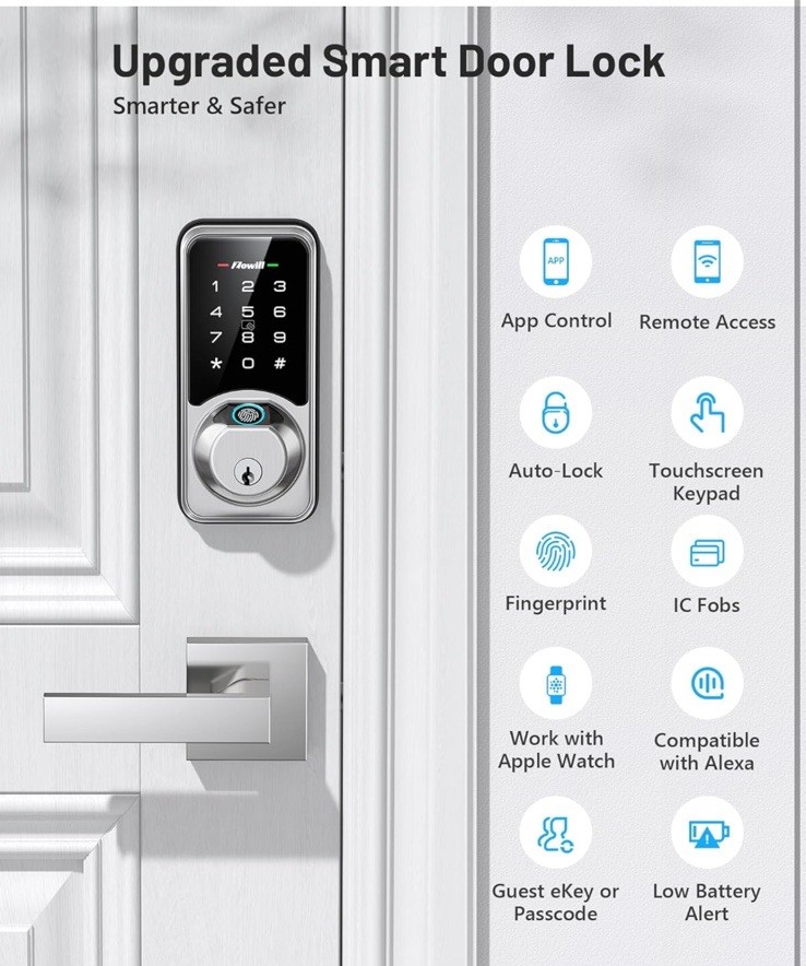 Brand Zowill Special Feature Fingerprint,Smart Lock,Wifi Lock Type Biometric Item dimensions L x W x H 12 x 3 x 3.5 inches Material Nickel Recommended Uses For Product Residential and commercial access control [ 7-in-1 Smart Door Lock ] Enjoy 7 ways to access your smart lock via Fingerprints + App Control + Web portal+ Passcodes + IC Fobs + Mechanical Keys + Alexa Voice Control (Extra Optional Function, G2 Gateway Required). [ Smart Door Lock Set for Homeowners and Rental Hosts ] It can remotely generate and share permanent, timed, one-time and recurring passwords to your visitors. Zowill smart deadbolt with handle is a great solution for short-term rental hosts, rental property management, office, hotel and self-housing resident. [ APP Control & Remote Access ] Take control of your security with the free DDlock APP, allowing you to remotely generate eKey sharing, grant access, and manage multiple types of passwords and users. When paired with Zowill G2 WiFi Gateway (Extra Optional Add-on, Sold Separately), you can check access records anywhere in real-time, voice control with Alexa and Google, monitor smart lock status, and more. [ Enhanced Security Features ] The enhanced lock features auto-lock, one-touch locking, passage mode brings more convenience to your family. The built-in anti-peeping touchscreen keypad, anti-hacking and privacy mode keeps your home secure.