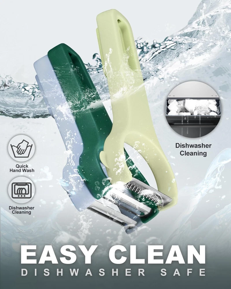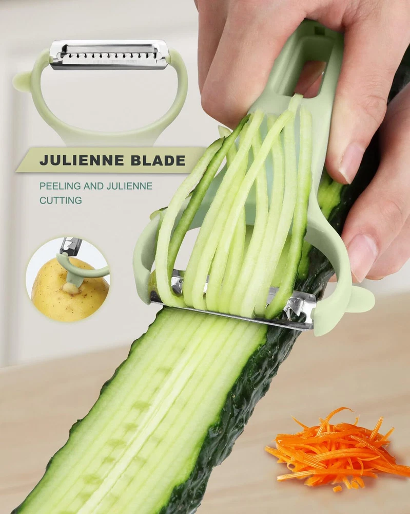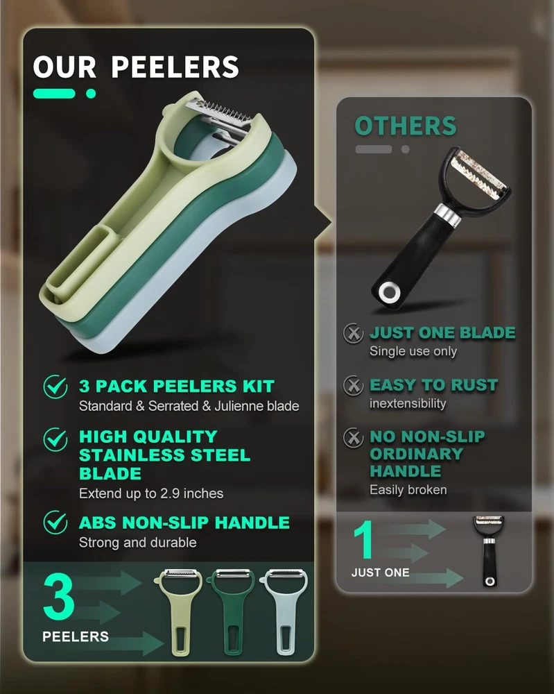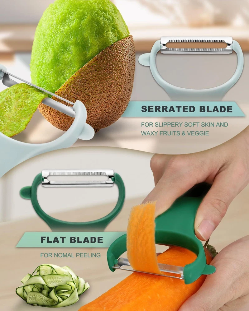 Zuacs Vegetable Peelers Kit,3 Pack Potato Slicer Julienne Peeler Fruit Cutter fo Features: Zuacs kitchen peelers set includes straight, serrated and julienne Peelers.Standard blade vegetable peeler can quickly removes tough skinned vegetables.Serrated blade for soft or smooth vegetable peeling.Julienne blade provides the function of Julienne cutting; This carrot peeler can be stacked on top of each other, and 3 can be combined into one for easy hanging or storage. This will greatly save space in your kitchen; Food grade 304 stainless steel and double-edged blade design features long-lasting sharp which can get smoothly peeling.It also has a strong anti-rust and anti-corrosion performance; Our fruit peelers has a non-slip handle design,works in right or left hand and maintains a firm grip and pressure to ensure peeling is effortless and safe; This vegetable peeler set is easy to clean and maintain. It can be washed directly with water. And it's also dishwasher safe.It's a cool kitchen gadget gift for those who loves cooking. Features: Zuacs kitchen peelers set includes straight, serrated and julienne Peelers.Standard blade vegetable peeler can quickly removes tough skinned vegetables.Serrated blade for soft or smooth vegetable peeling.Julienne blade provides the function of Julienne cutting; This carrot peeler can be stacked on top of each other, and 3 can be combined into one for easy hanging or storage. This will greatly save space in your kitchen; Food grade 304 stainless steel and double-edged blade design features long-lasting sharp which can get smoothly peeling.It also has a strong anti-rust and anti-corrosion performance; Our fruit peelers has a non-slip handle design,works in right or left hand and maintains a firm grip and pressure to ensure peeling is effortless and safe; This vegetable peeler set is easy to clean and maintain. It can be washed directly with water. And it's also dishwasher safe.It's a cool kitchen gadget gift for those who loves cooking. eBay integration by