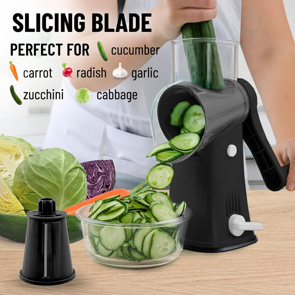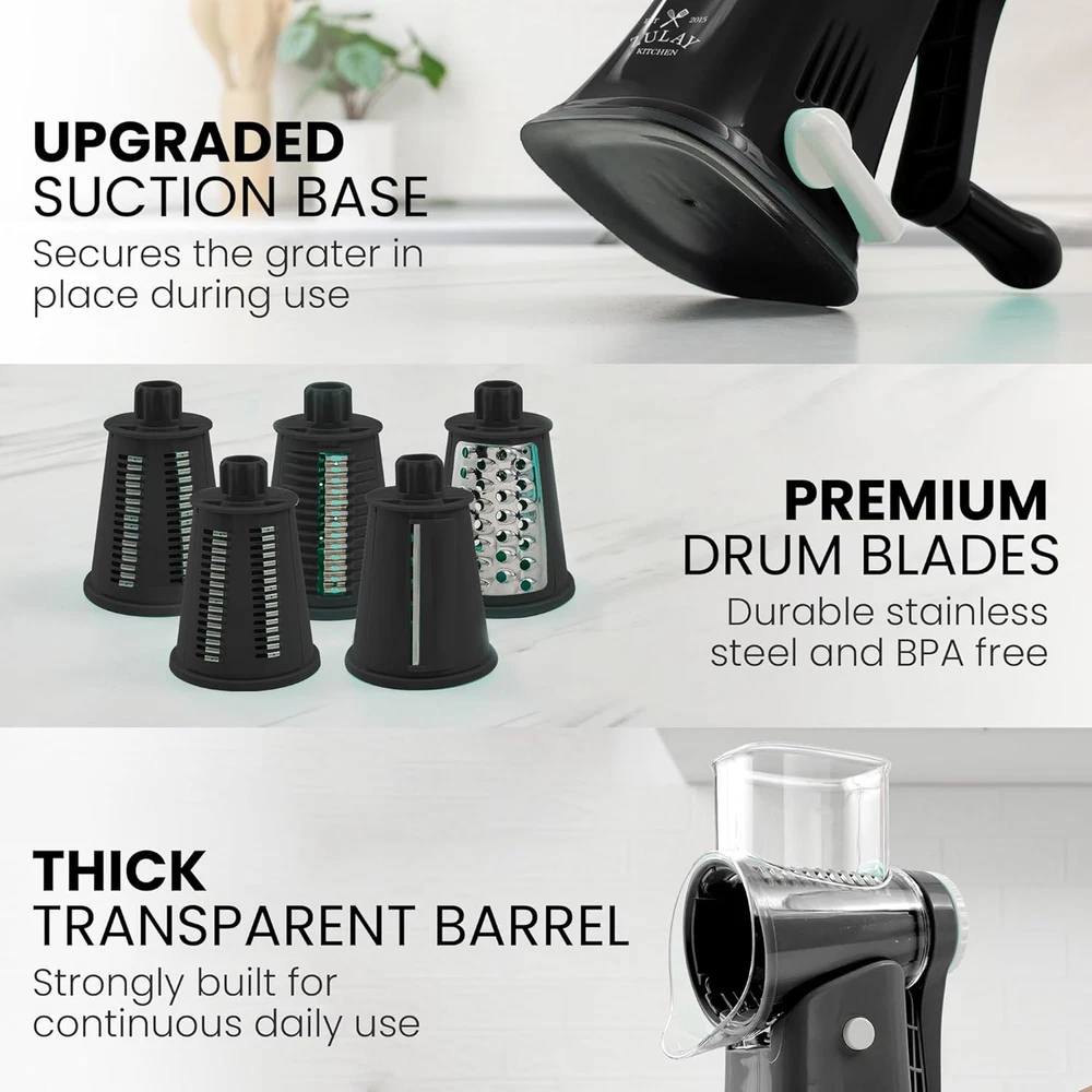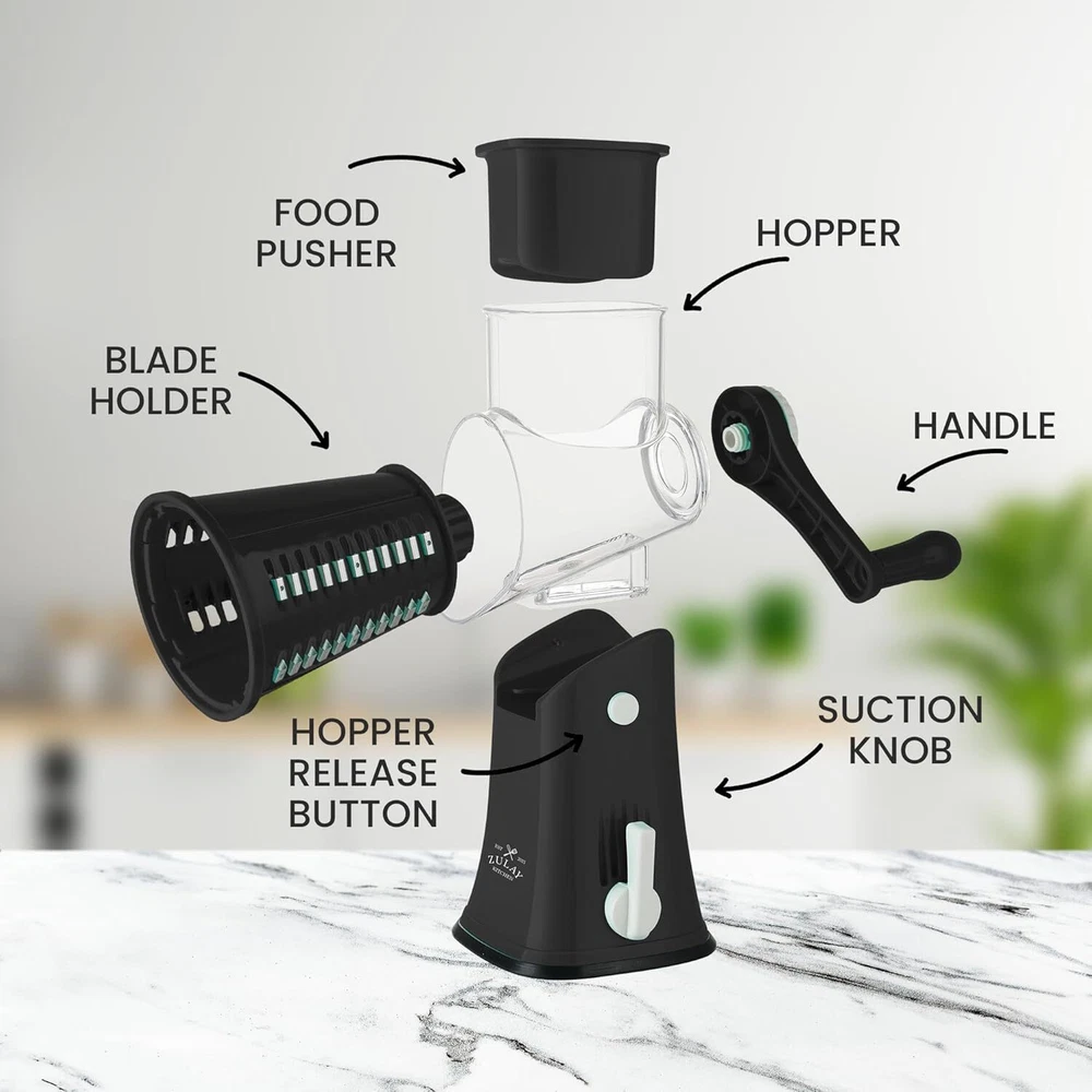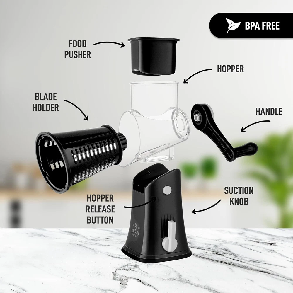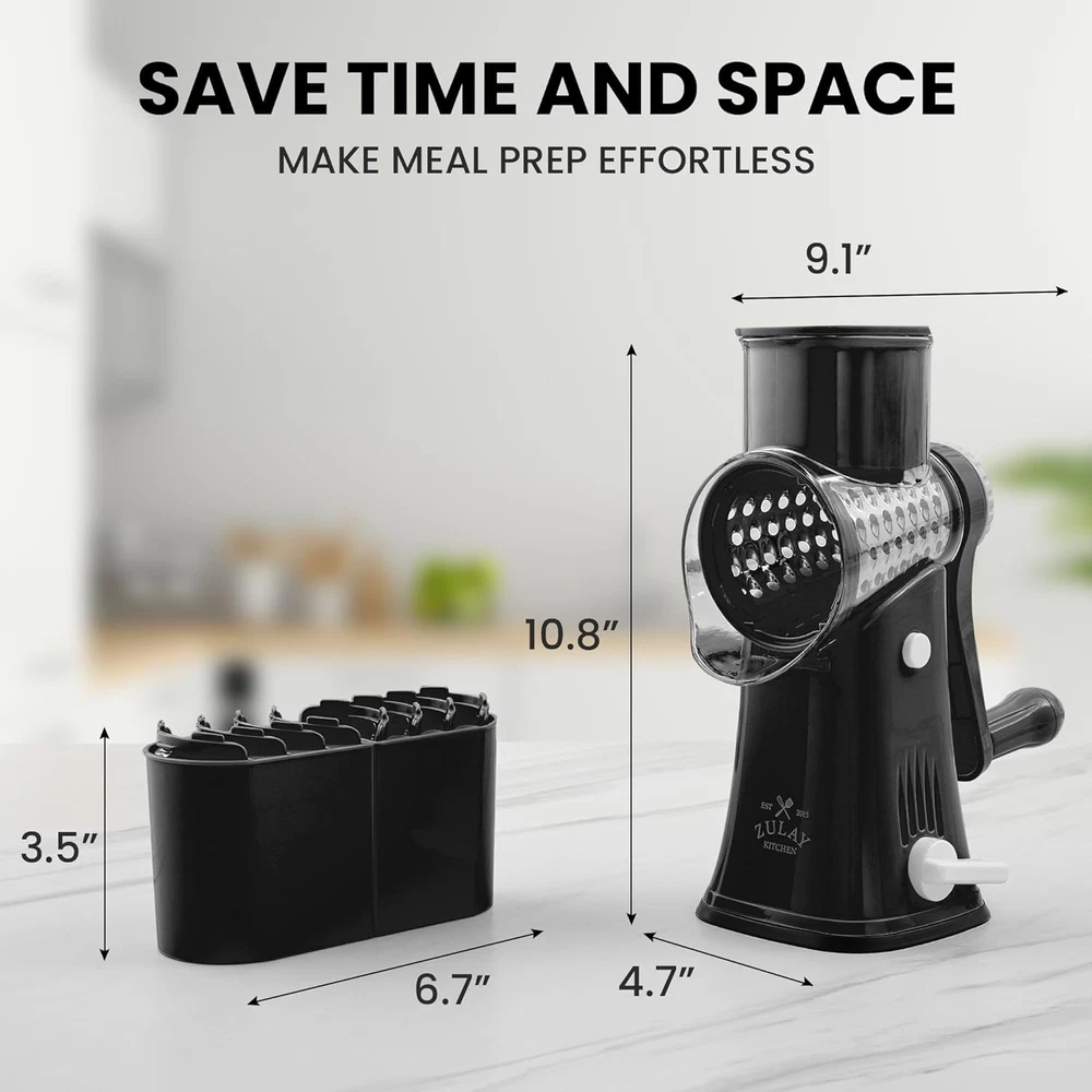 Zulay Kitchen Rotary Cheese Grater 5 Blade Shredder - Manual Jet Black Product Details Color: Jet Black Material: Stainless Steel Brand: Zulay Kitchen Style: 5 Blades Item Weight: 1.14 Kilograms Shape: Rectangular, Round Is Dishwasher Safe: Yes Manufacturer: Zulay Kitchen Package Dimensions: 10.12 x 7.56 x 5.59 inches Item Weight: 2.51 pounds Item model number: Rotary Cheese Grater - 5 Blades SAFE TO USE CHEESE GRATER: No more injuries! This rotary cheese grater is designed with easy to install blades that don’t require you to touch the blade directly. It also comes with a food pusher that keeps your hand away from the blades and lets you add more food into the wide hopper. This vegetable shredder is made from BPA-free, food-grade materials, making it safe to use. SAVE TIME AND EFFORT: If you love freshly grated cheese but don't want to put in a lot of effort, then this cheese grater with handle is just what you need. Simply rotate the handle to shred cheese 18 times faster than cutting cheese by hand; it is designed for both left and right handed people. Grate like a pro with our easy-to-use rotary cheese grater with handle. GRATE, SLICE, AND SHRED: With 5 interchangeable stainless steel blades, this rotary grater is perfect for thin and wavy vegetable slicing, coarse shredding, and fine and coarse julienne. The sharp blades of this multifunctional grater are perfect for grating with carrots, cucumbers, potatoes, nuts, cookies, and even a soft block of cheese. EASY TO CLEAN AND STORE: The hopper and blades, which handle most of the mess, are dishwasher safe for hassle-free cleaning. The base, handle, and food pusher can be quickly wiped clean. Plus, it comes with a compact storage box, keeping everything neatly organized and easily accessible in your kitchen cabinet. FUNCTIONAL DESIGN: The powerful suction base securely attaches to a clean and dry surface, preventing the food shredder from falling over. The transparent barrel is slightly inclined to prevent clogging and allow the food to come out smoothly.