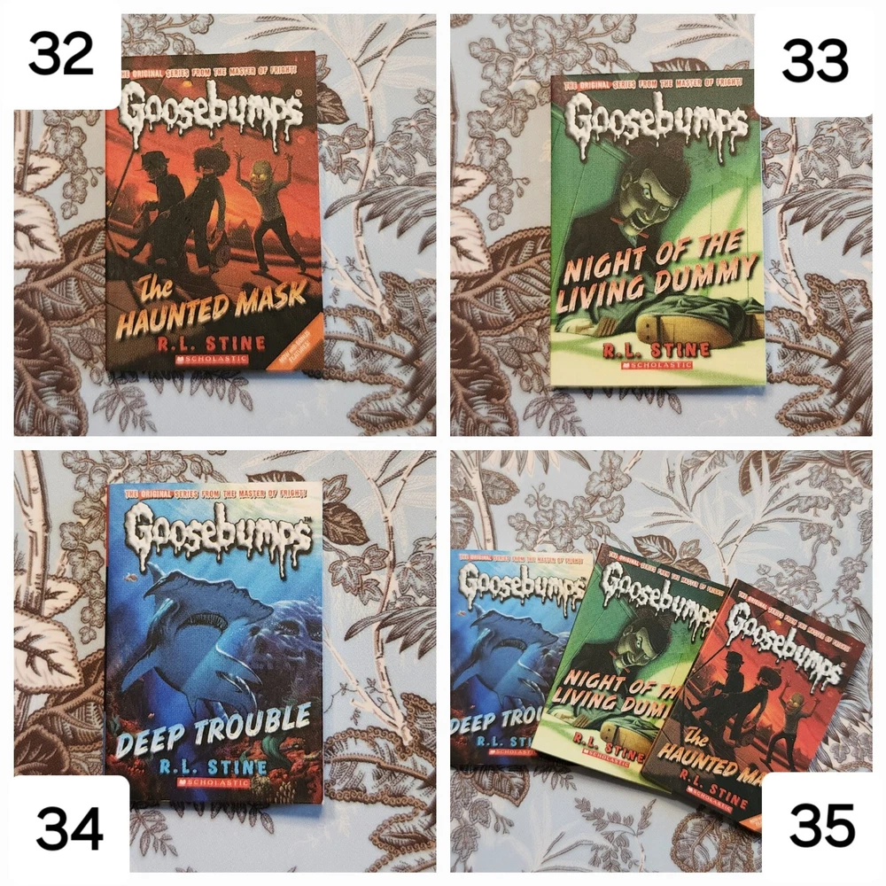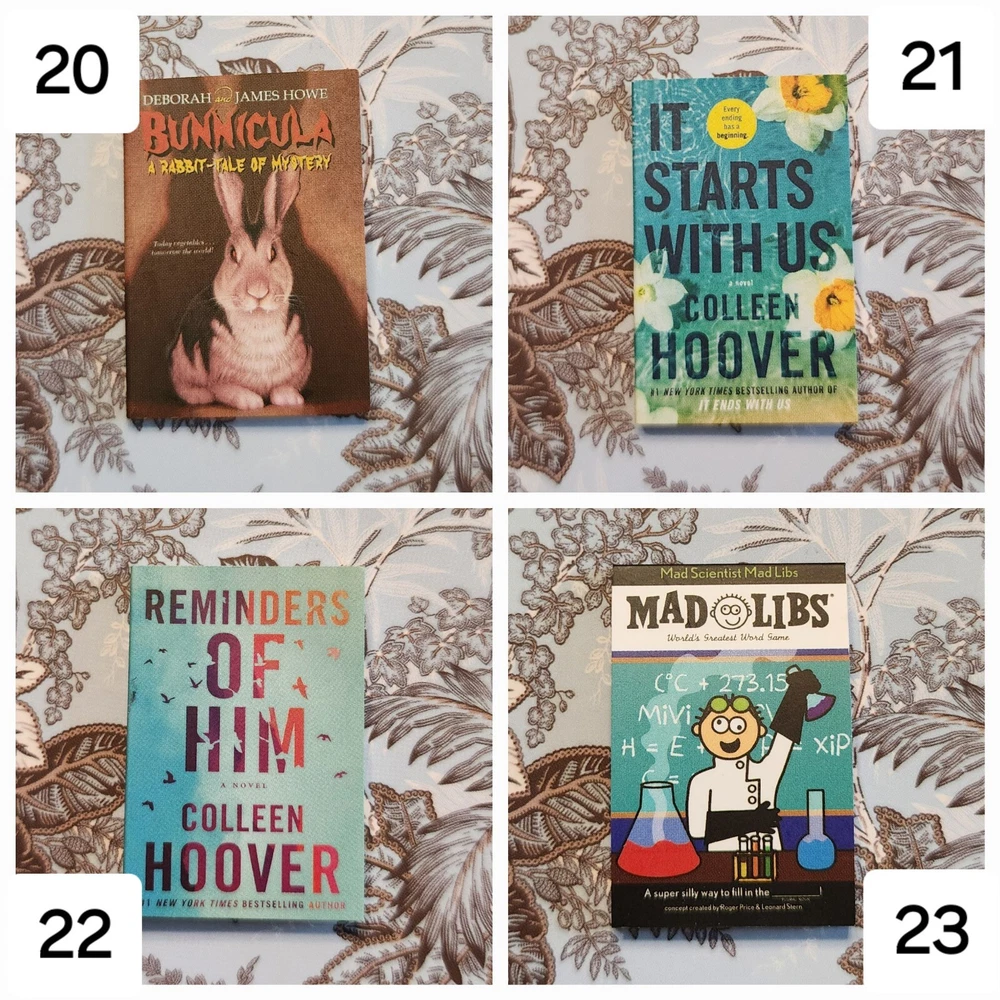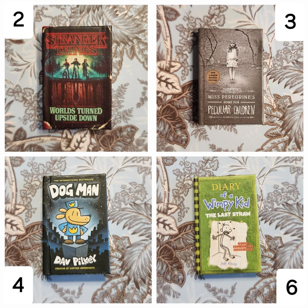 Mini Brand Books List: LEGENDARY: 1: Goosebumps - Night of the Living Dummy (Legendary) ICONIC: 2: Stranger Things - World Turned Upside Down LUXURY: 3: Miss Peregrine's Home for Peculiar Children 4: Dog Man 5: Dog Man Unleashed ULTRA RARE: 6: Diary of a Wimpy Kid - The Last Straw (Hardback) 7: Diary of a Wimpy Kid - Dog Days 8: Alice's Adventure in Wonderland 9: Black Beauty 10: A Christmas Carol RARE: 11: Burn Book (Paperback) 12: Clueless 13: Pride and Prejudice 14: Library of Souls 15: Hallow City 16: Babysitters Club - Little Sister 17: Babysitters Club - Kristys Great Idea 18: Cat Kid - Comic Club 19: Howlday Inn 20: Bunnicula COMMON: 21: It Starts With Us 22: Reminders of Him 23: Mad Libs 24: Charlie and the Chocolate Factory 25: The BFG 26: Matilda 27: The Twits 28: Diary of a Wimpy Kid - Rodrick Rules 29: Diary of a Wimpy Kid 30: Stranger Things - Suspicious Minds 31: Stranger Things - Darkness on the Edge of Town 32: Goosebumps - Haunted Mask 33: Goosebumps - Night of the Living Dummy 34: Goosebumps - Deep Trouble 35: Goosebumps Trio - Get All 3! 36: Vampire Diaries - The Fury 37: Vampire Diaries - The Awakening 38: Mini Magnifying Glass 39: White Bookshelf 40: Purple Bookmark 41: White Bookmark 42: Brown Bookmark 43: Brown/White Bookmark 44: Red Bookmark 45: Blue Bookmark Flat rate shipping of $4.00.