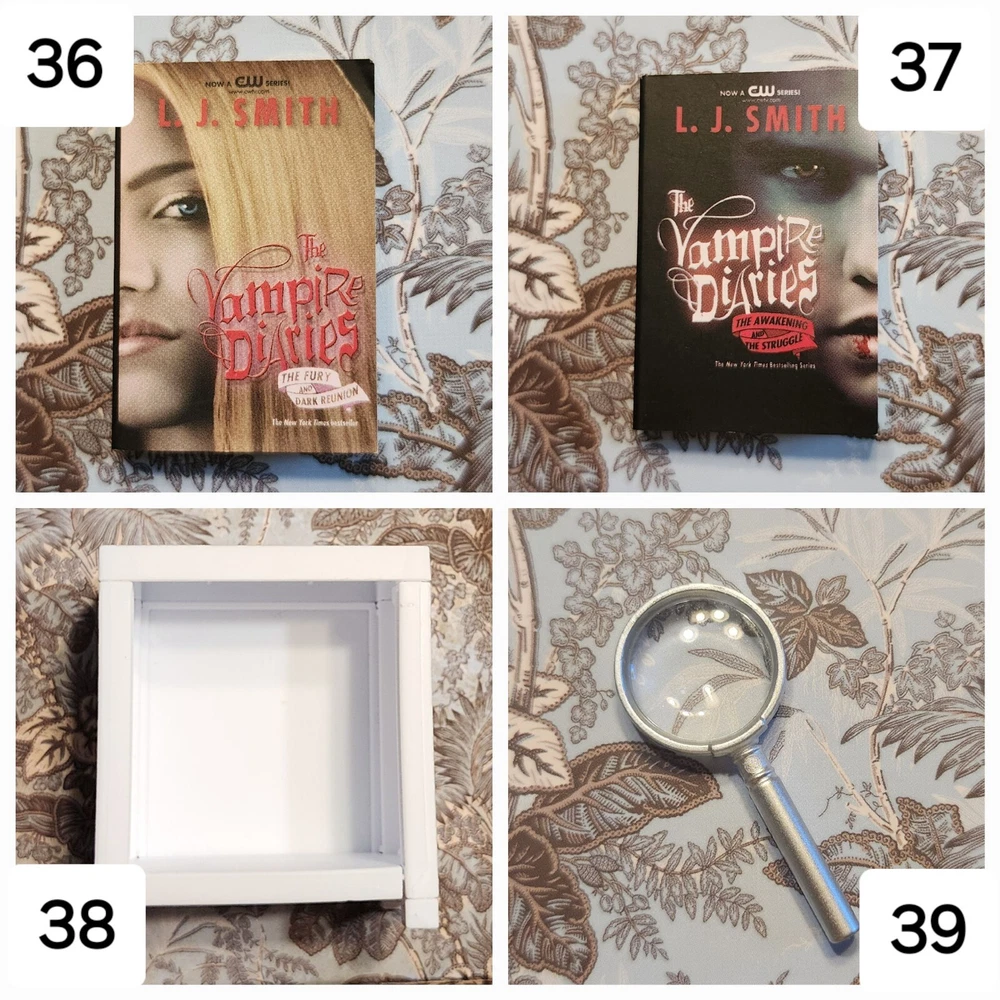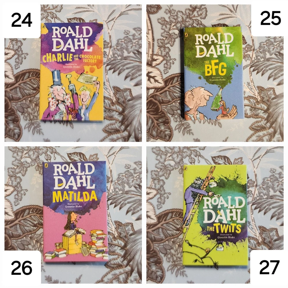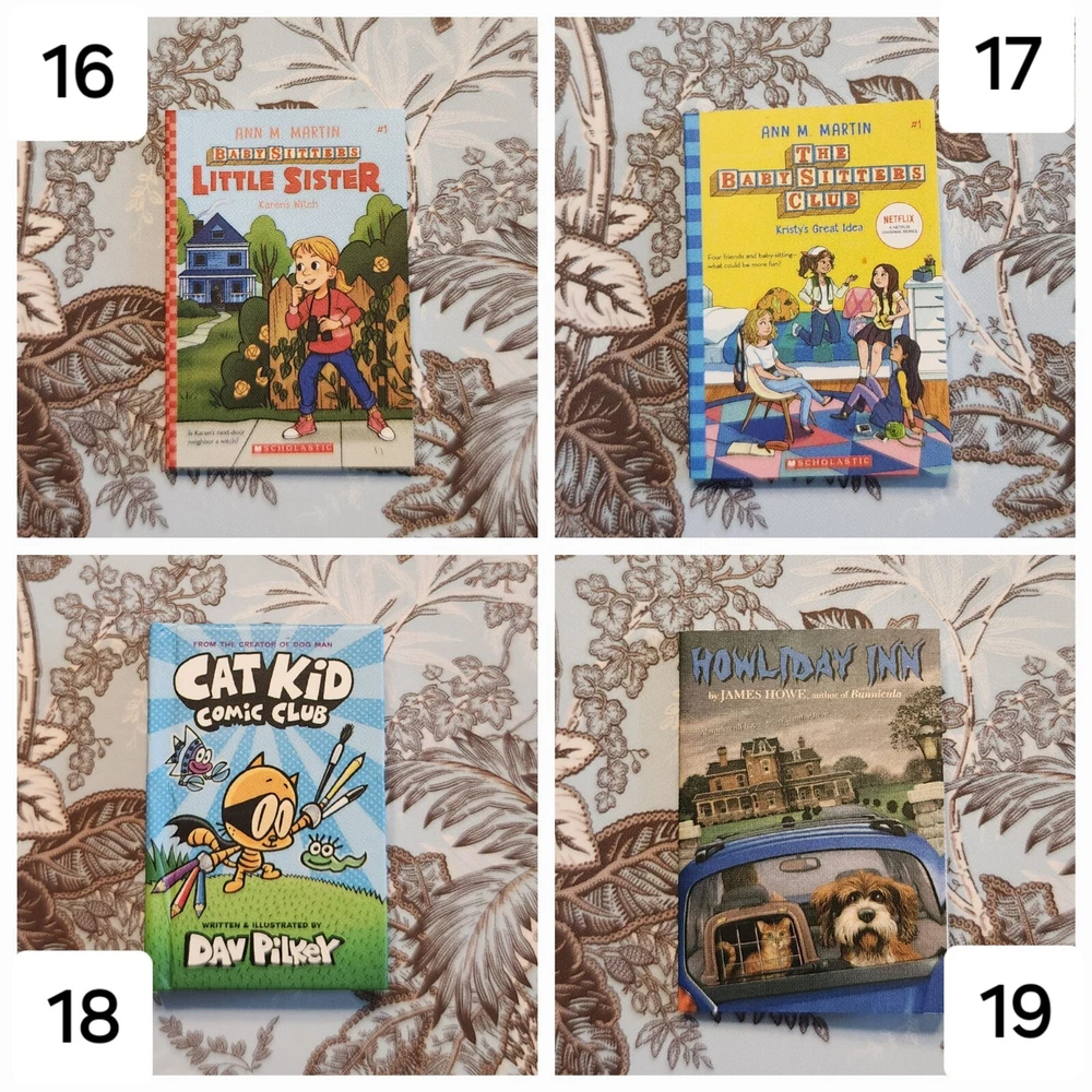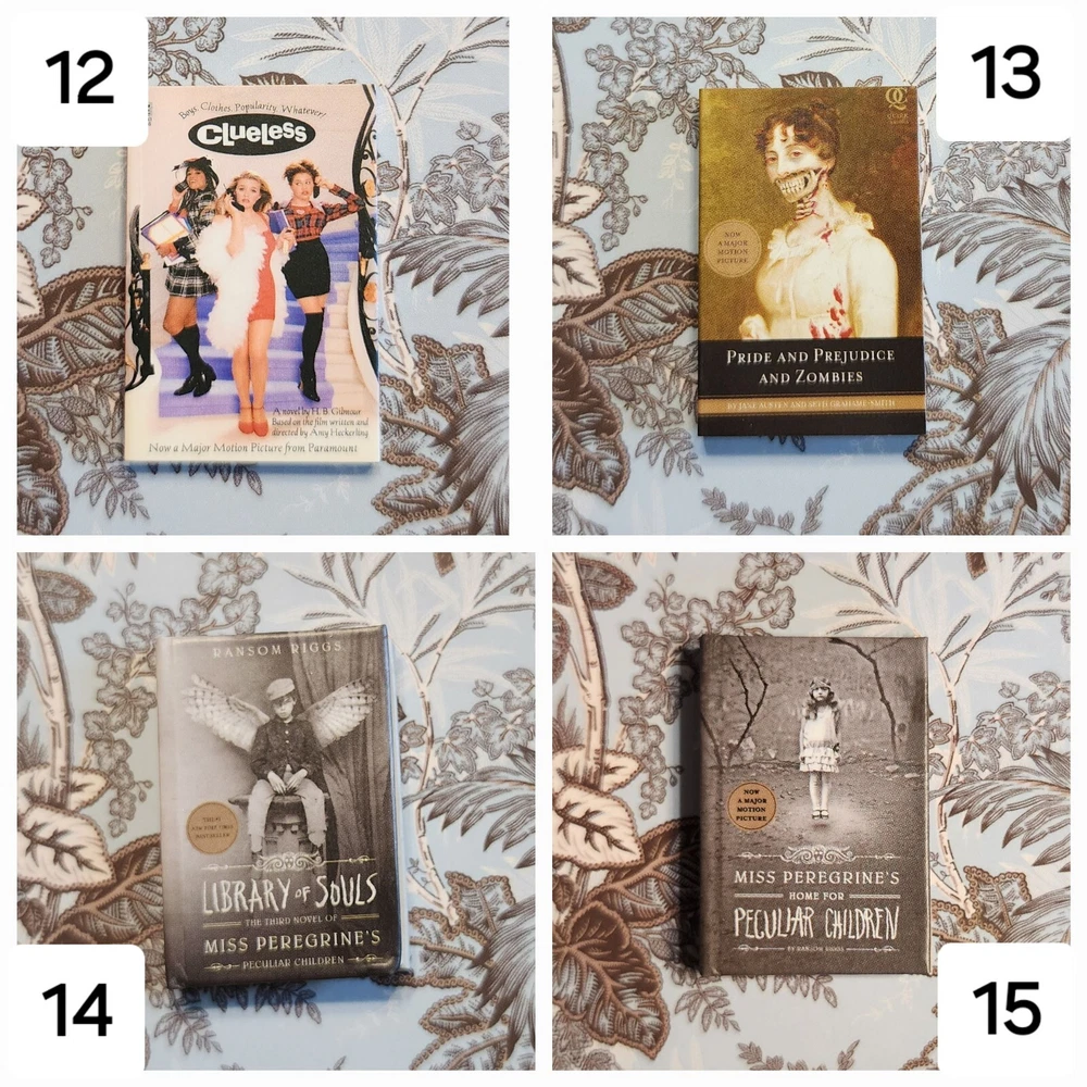 Mini Brand Books List: LEGENDARY: 1: Goosebumps - Night of the Living Dummy (Legendary) ICONIC: 2: Stranger Things - World Turned Upside Down LUXURY: 3: Miss Peregrine's Home for Peculiar Children 4: Dog Man 5: Dog Man Unleashed ULTRA RARE: 6: Diary of a Wimpy Kid - The Last Straw (Hardback) 7: Diary of a Wimpy Kid - Dog Days 8: Alice's Adventure in Wonderland 9: Black Beauty 10: A Christmas Carol RARE: 11: Burn Book (Paperback) 12: Clueless 13: Pride and Prejudice 14: Library of Souls 15: Hallow City 16: Babysitters Club - Little Sister 17: Babysitters Club - Kristys Great Idea 18: Cat Kid - Comic Club 19: Howlday Inn 20: Bunnicula COMMON: 21: It Starts With Us 22: Reminders of Him 23: Mad Libs 24: Charlie and the Chocolate Factory 25: The BFG 26: Matilda 27: The Twits 28: Diary of a Wimpy Kid - Rodrick Rules 29: Diary of a Wimpy Kid 30: Stranger Things - Suspicious Minds 31: Stranger Things - Darkness on the Edge of Town 32: Goosebumps - Haunted Mask 33: Goosebumps - Night of the Living Dummy 34: Goosebumps - Deep Trouble 35: Goosebumps Trio - Get All 3! 36: Vampire Diaries - The Fury 37: Vampire Diaries - The Awakening 38: Mini Magnifying Glass 39: White Bookshelf 40: Purple Bookmark 41: White Bookmark 42: Brown Bookmark 43: Brown/White Bookmark 44: Red Bookmark 45: Blue Bookmark Flat rate shipping of $4.00.